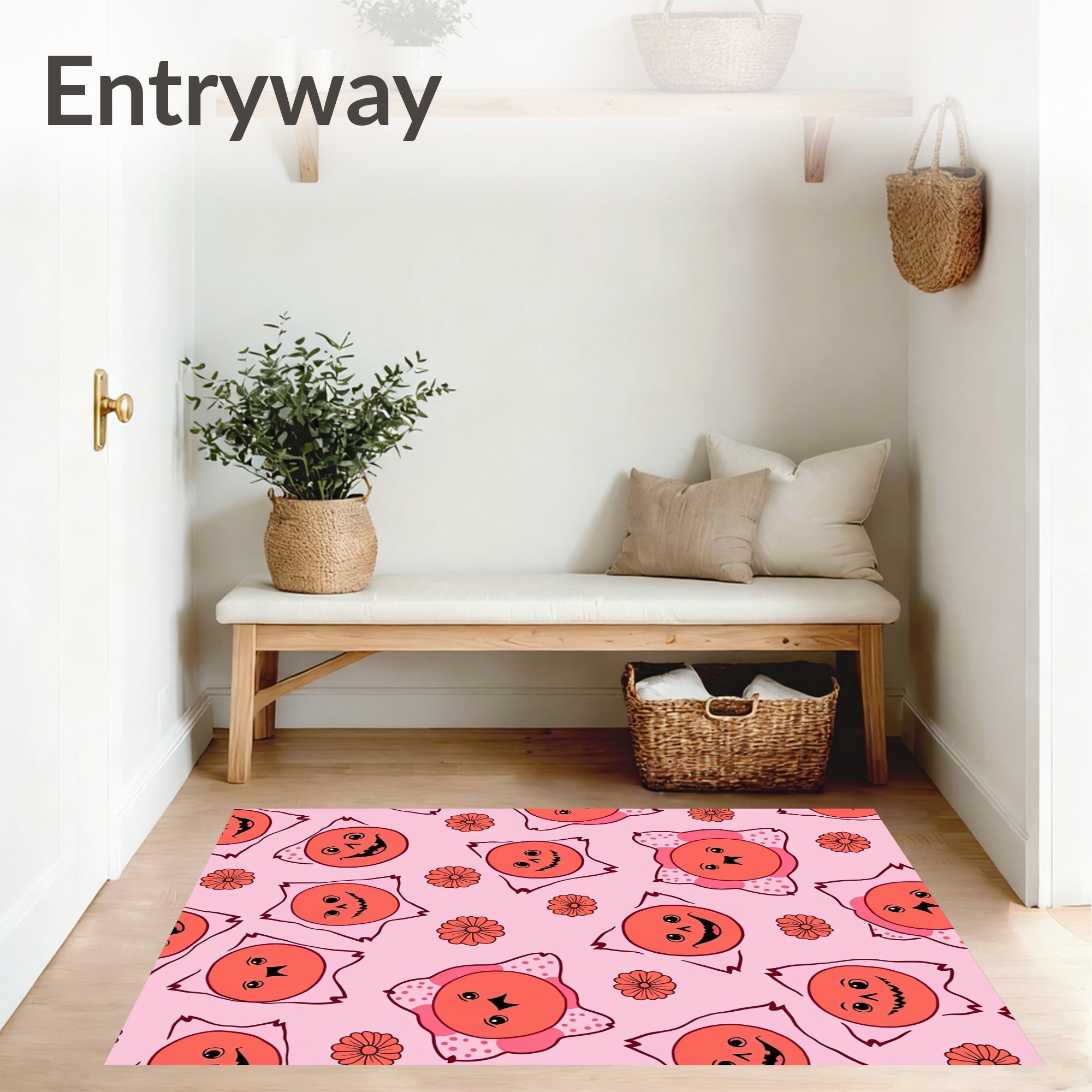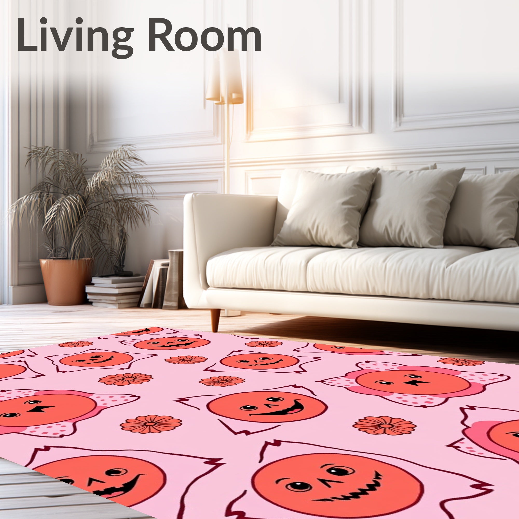 Ultra Soft Area Rug, Non Slip, Stain Resistant, Washable Area Rugs for Living Room, Bedroom, Buddies Pumpkin Patch Featuring Friendly Apparition Illustrations(Pink) Overview:
