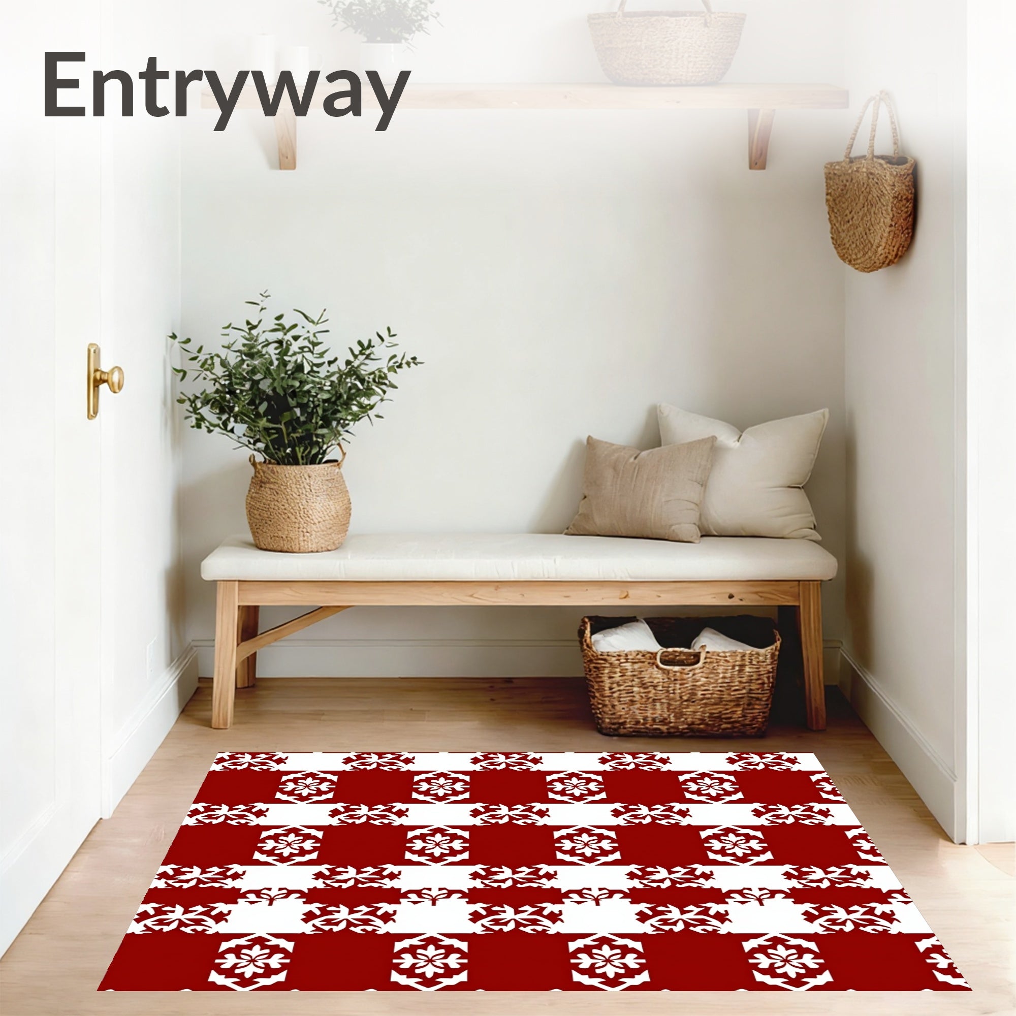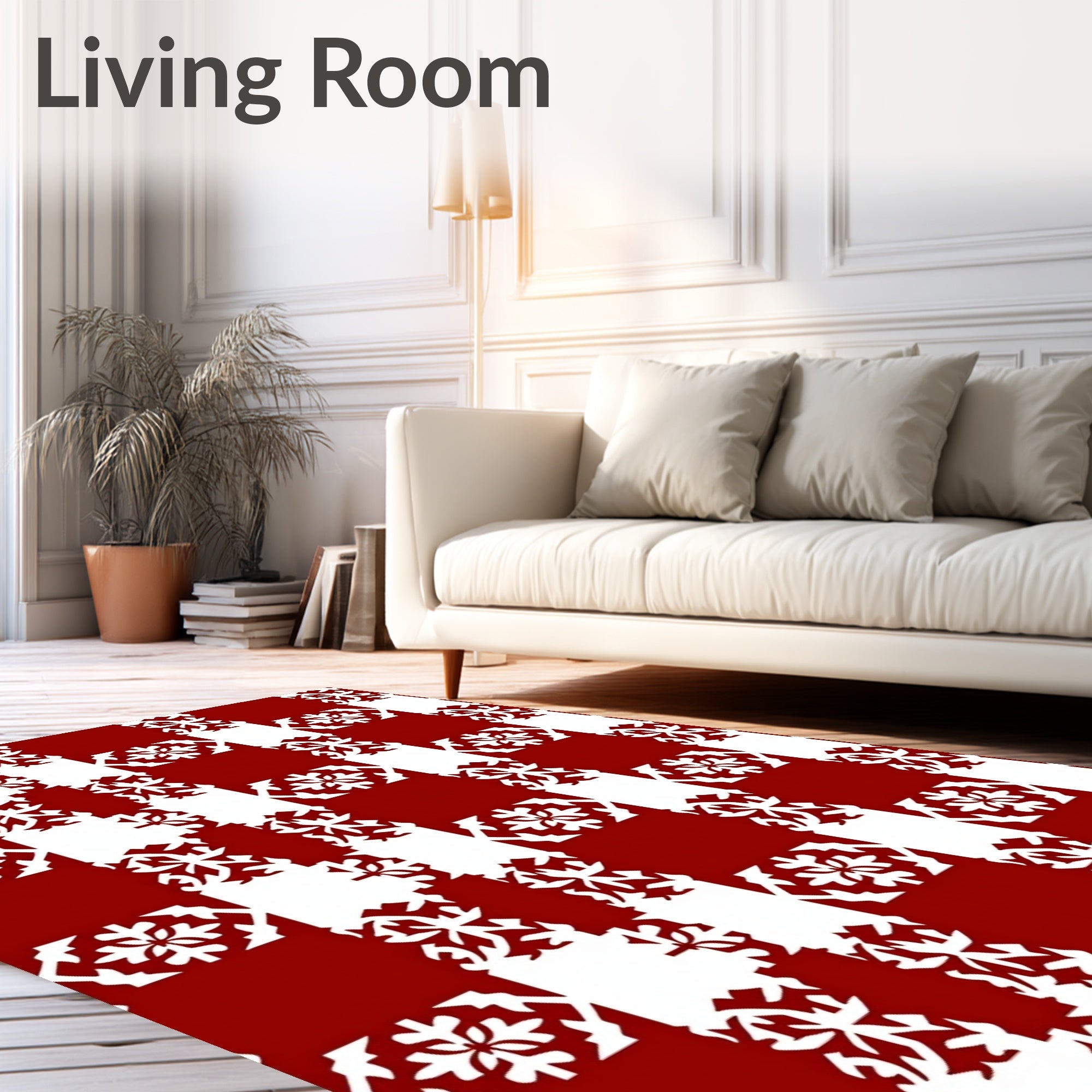 Ultra Soft Area Rug, Non Slip, Stain Resistant, Washable Area Rugs for Living Room, Bedroom, Buffalo Checkered Tartan with Nordic Snowflake Motifs(Red) Overview:
