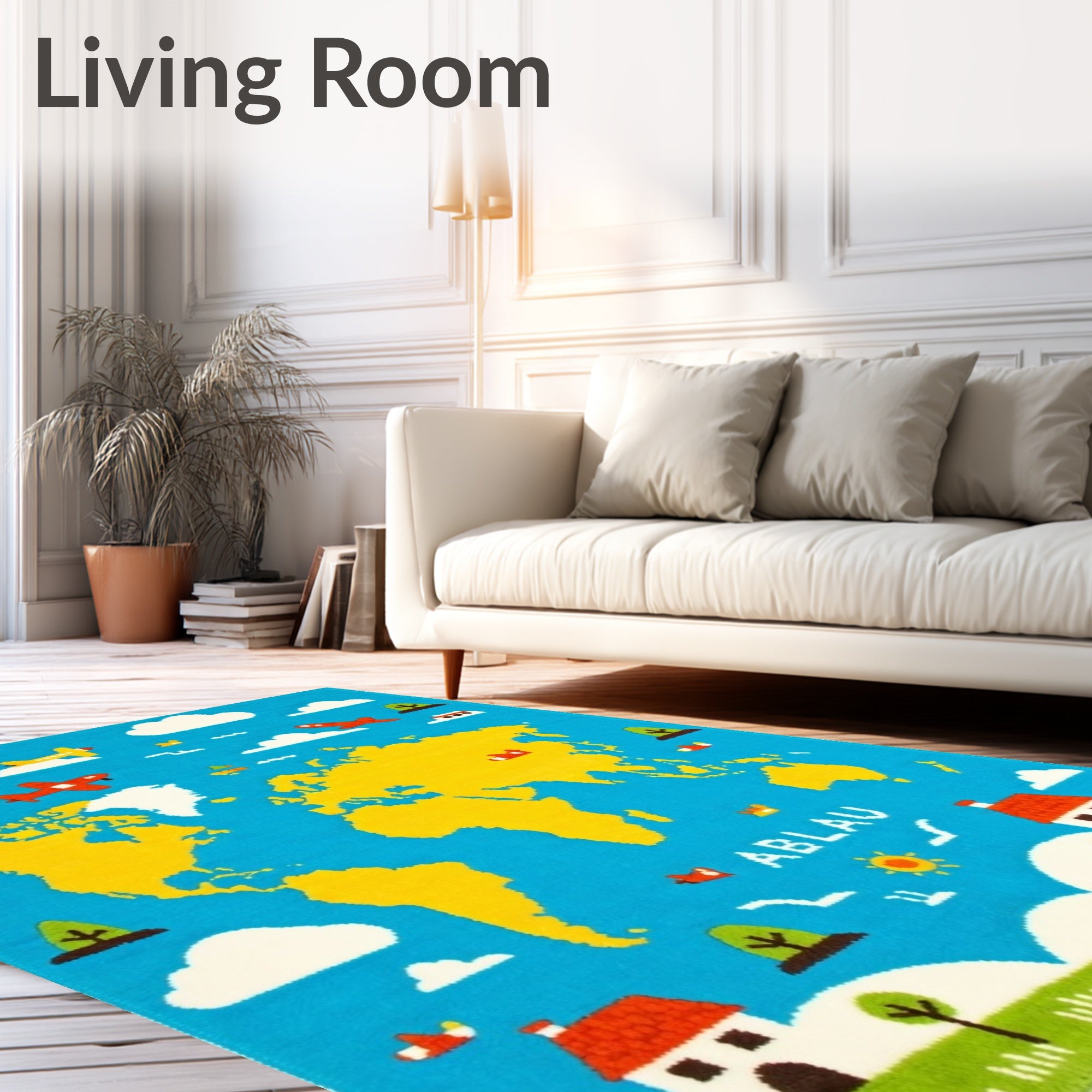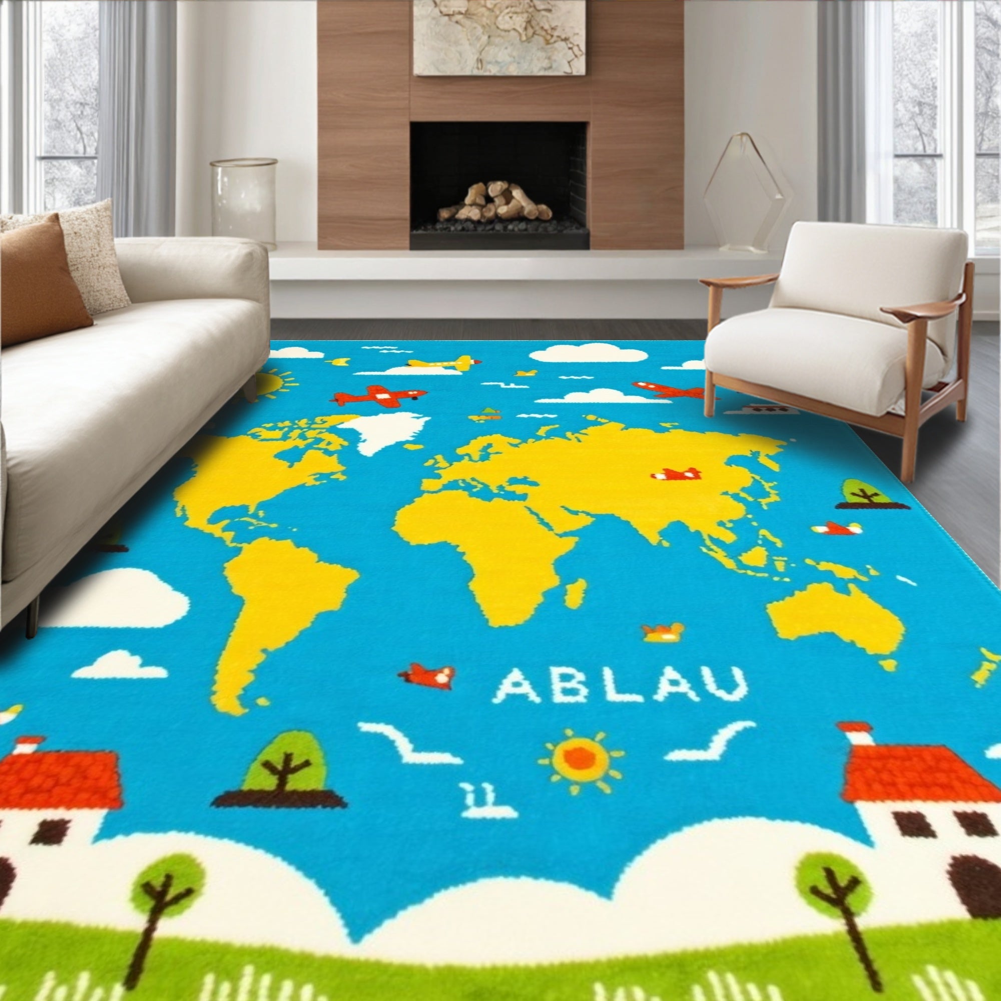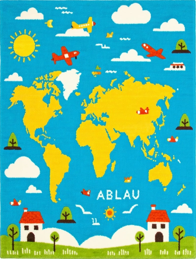 Flatwoven High Traffic Area Rug, Cartoon Map Cute Planes and Colorful Borders, Non Slip, Stain Resistant, Washable Area Rugs for Living Room, Bedroom (Blue) Overview: