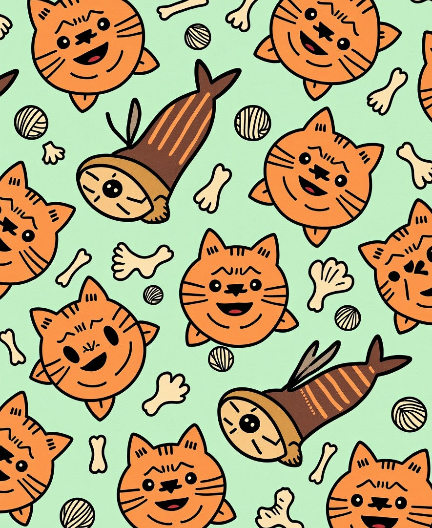 Cartoon Tabby Cats with Fish Bone and Yarn Accessories(Green)
