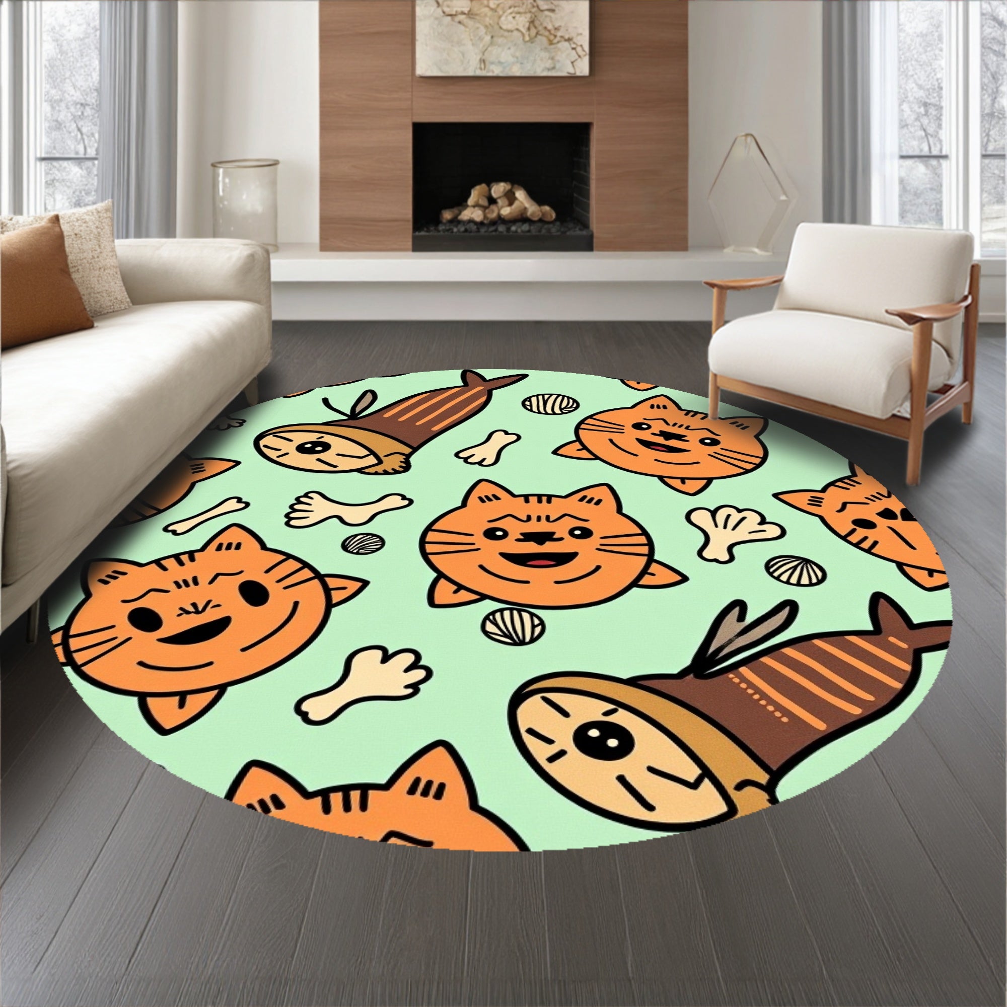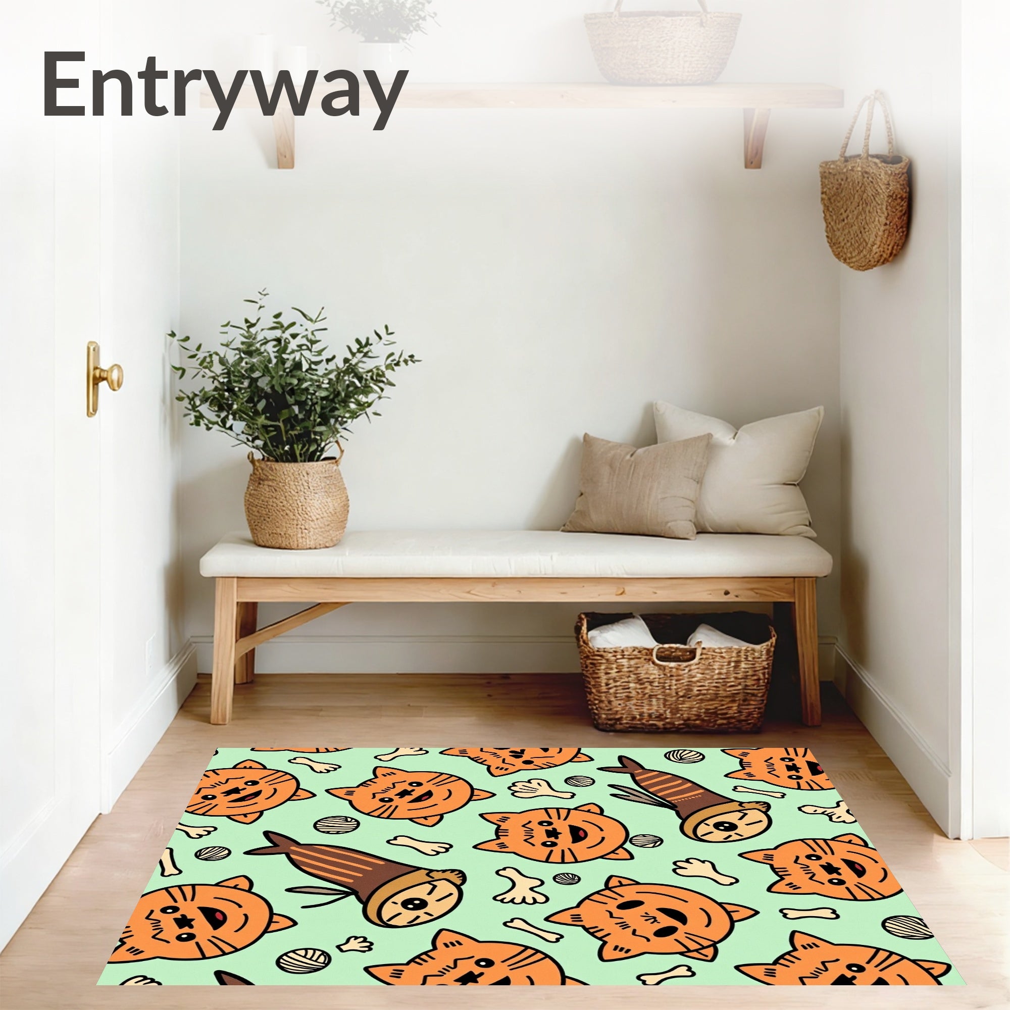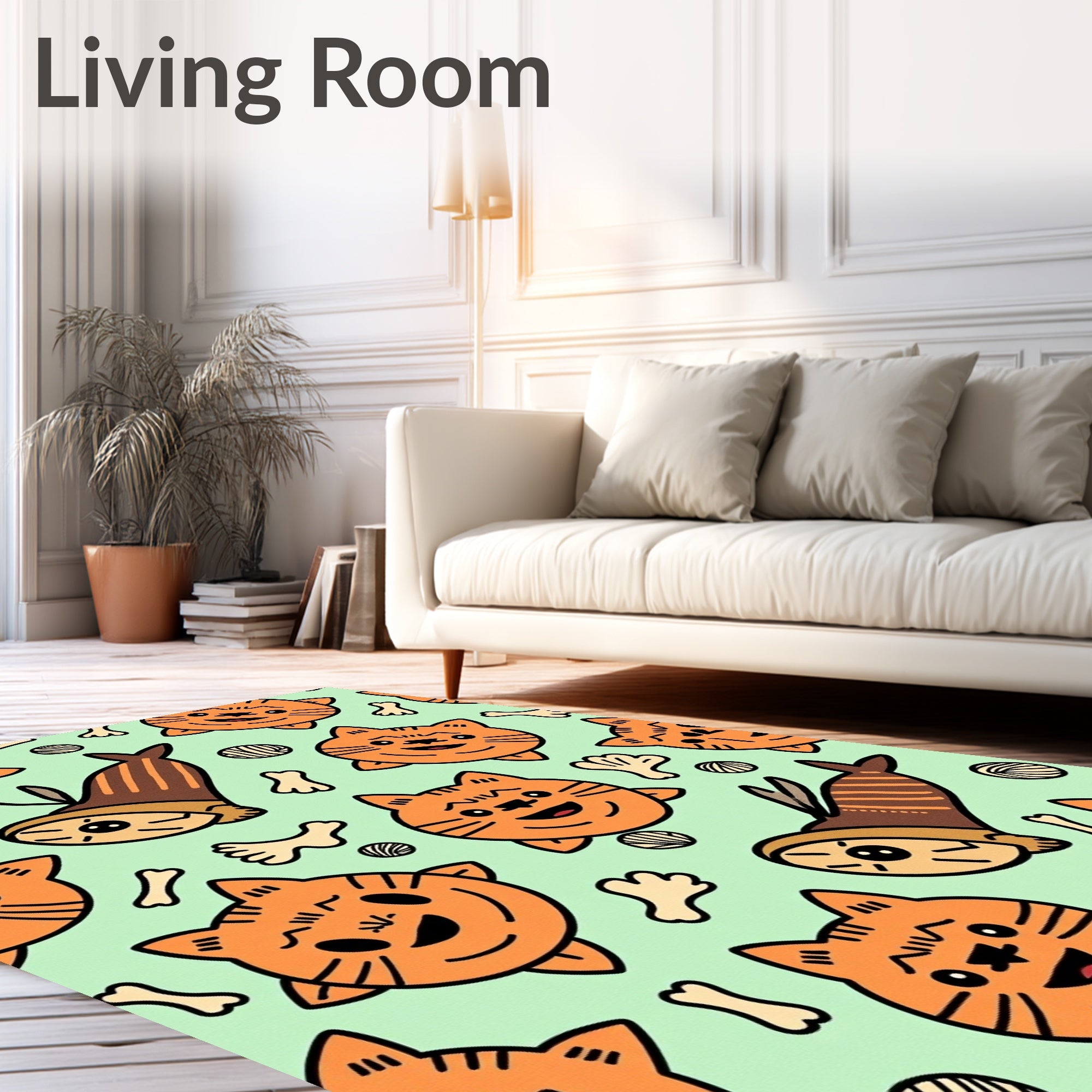 Ultra Soft Area Rug, Non Slip, Stain Resistant, Washable Area Rugs for Living Room, Bedroom, Cartoon Tabby Cats with Fish Bone and Yarn Accessories(Green) Overview: