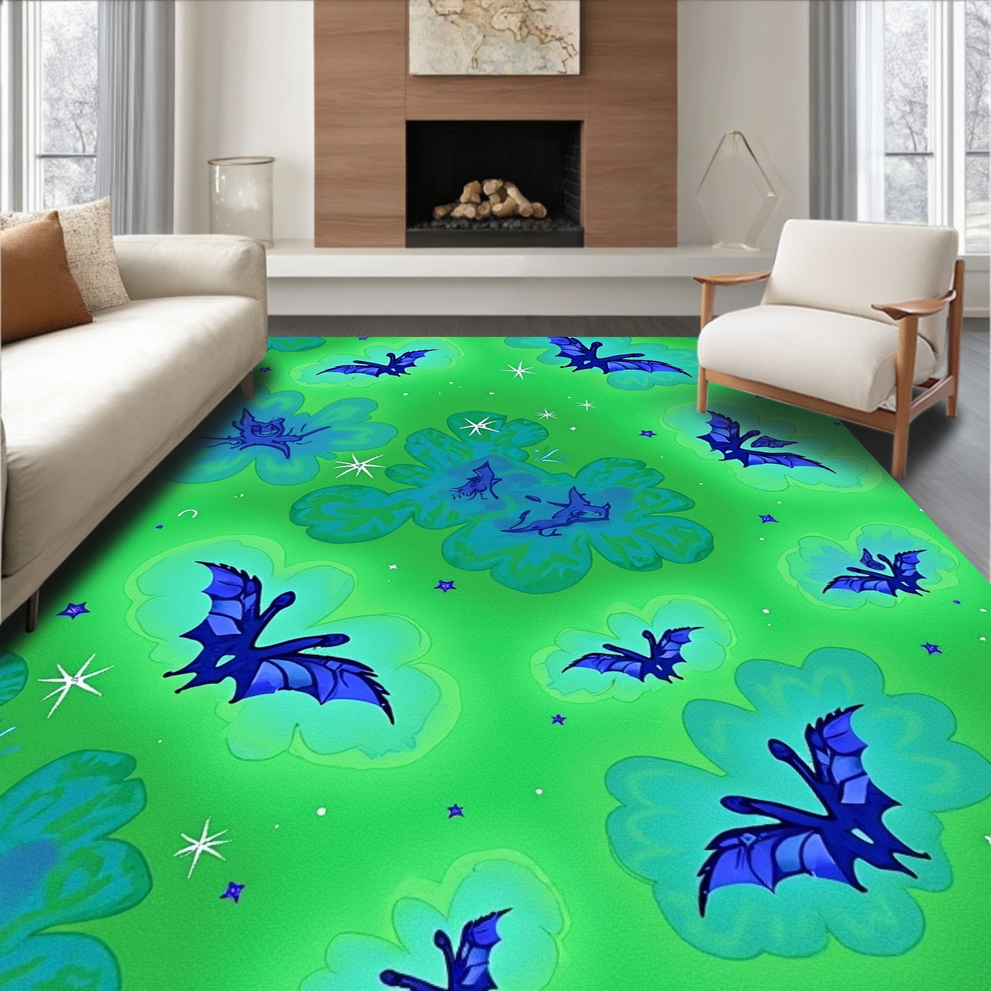 Ultra Soft Area Rug, Non Slip, Stain Resistant, Washable Area Rugs for Living Room, Bedroom, Celestial Dreamscape With Glittering Bats And Moons Motif(Green) Overview: