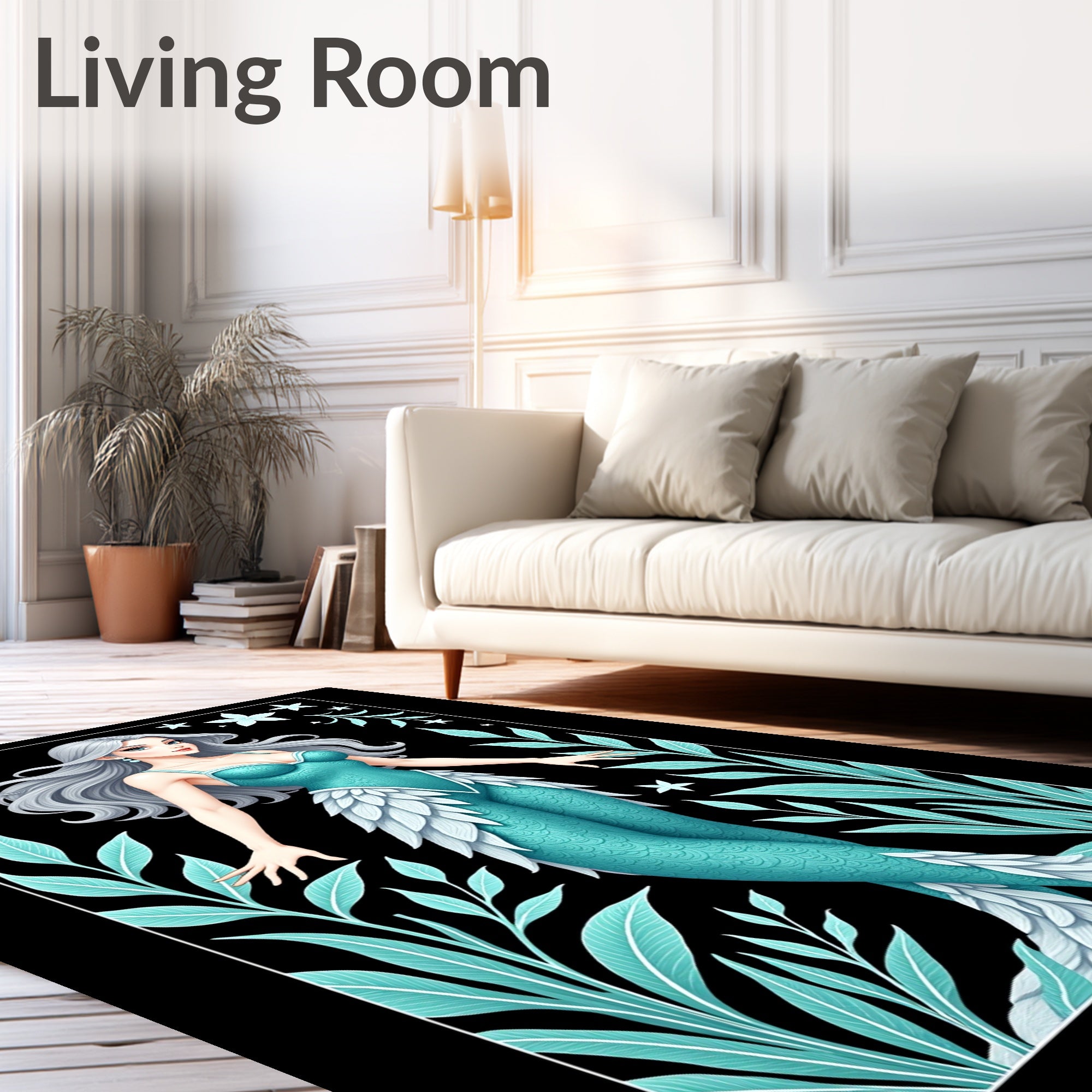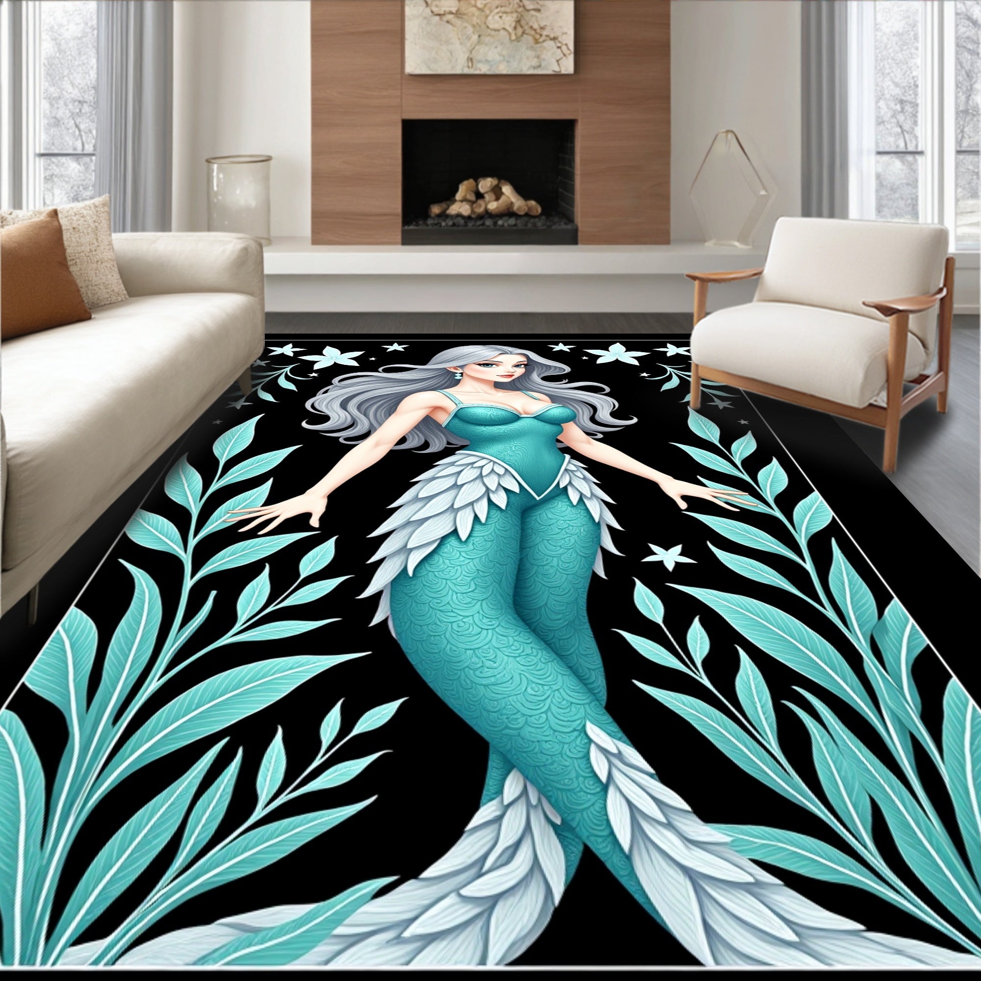 Ultra Soft Area Rug, Non Slip, Stain Resistant, Washable Area Rugs for Living Room, Bedroom, Celestial Mermaid Lagoon with Whimsical Sea Flora(Black) Overview: