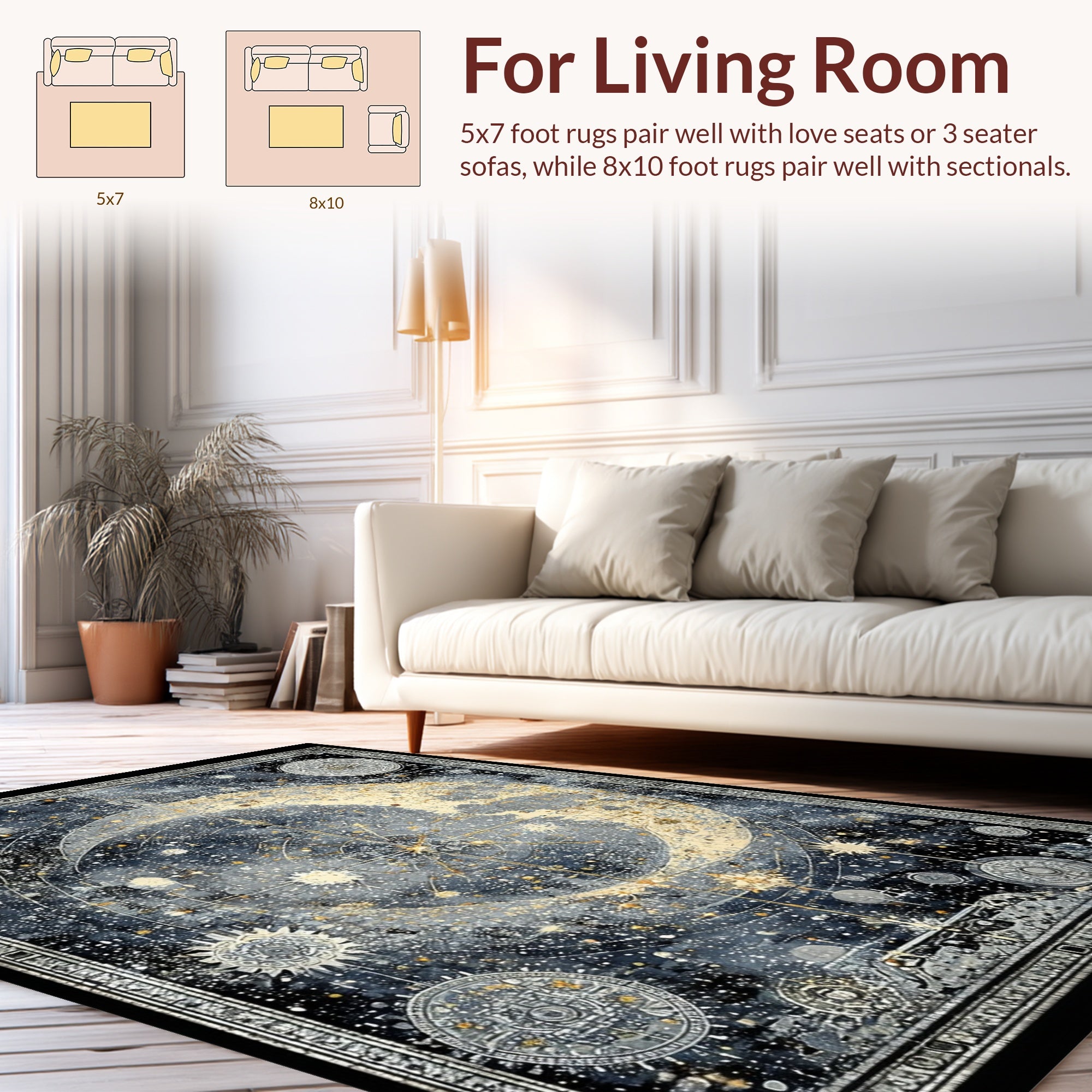 Ultra Soft Area Rug, Non Slip, Stain Resistant, Washable Area Rugs for Living Room, Bedroom, Celestial Phases Rug with Sunburst and Astral Clockwork Motifs(Black) Overview:
