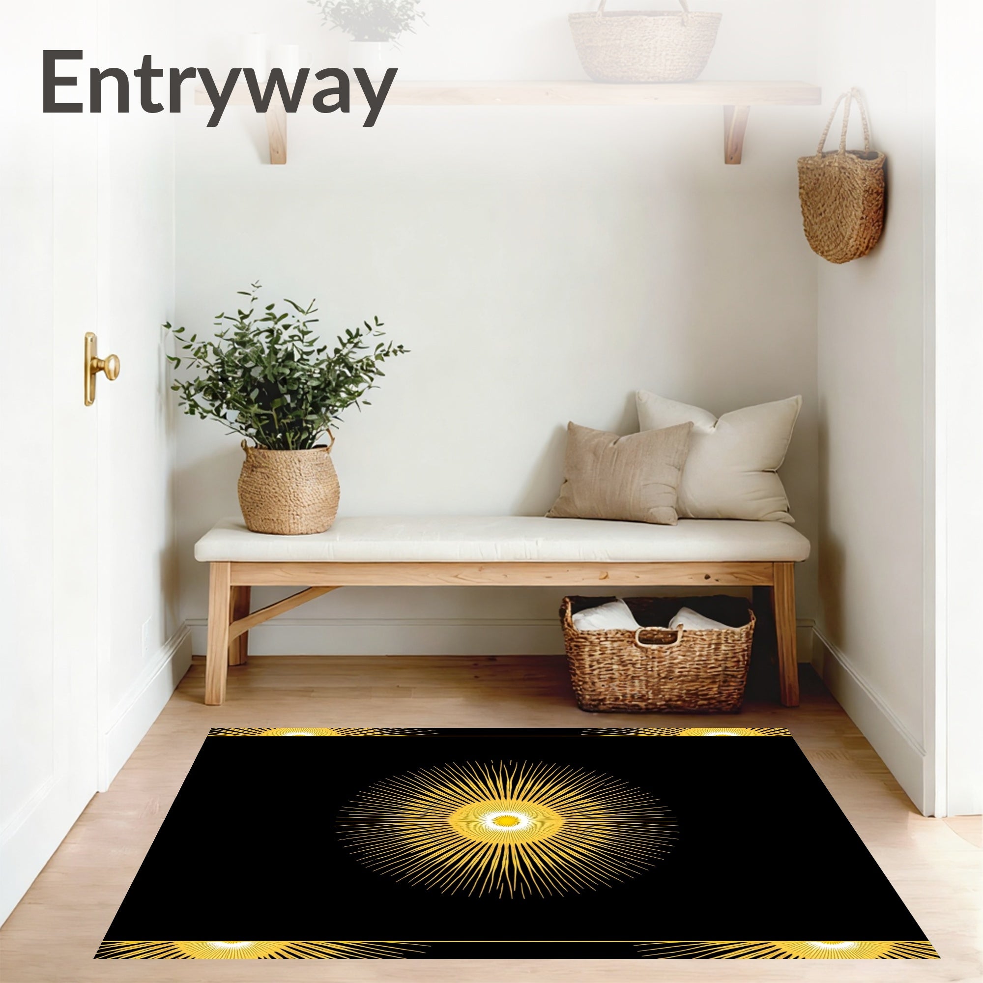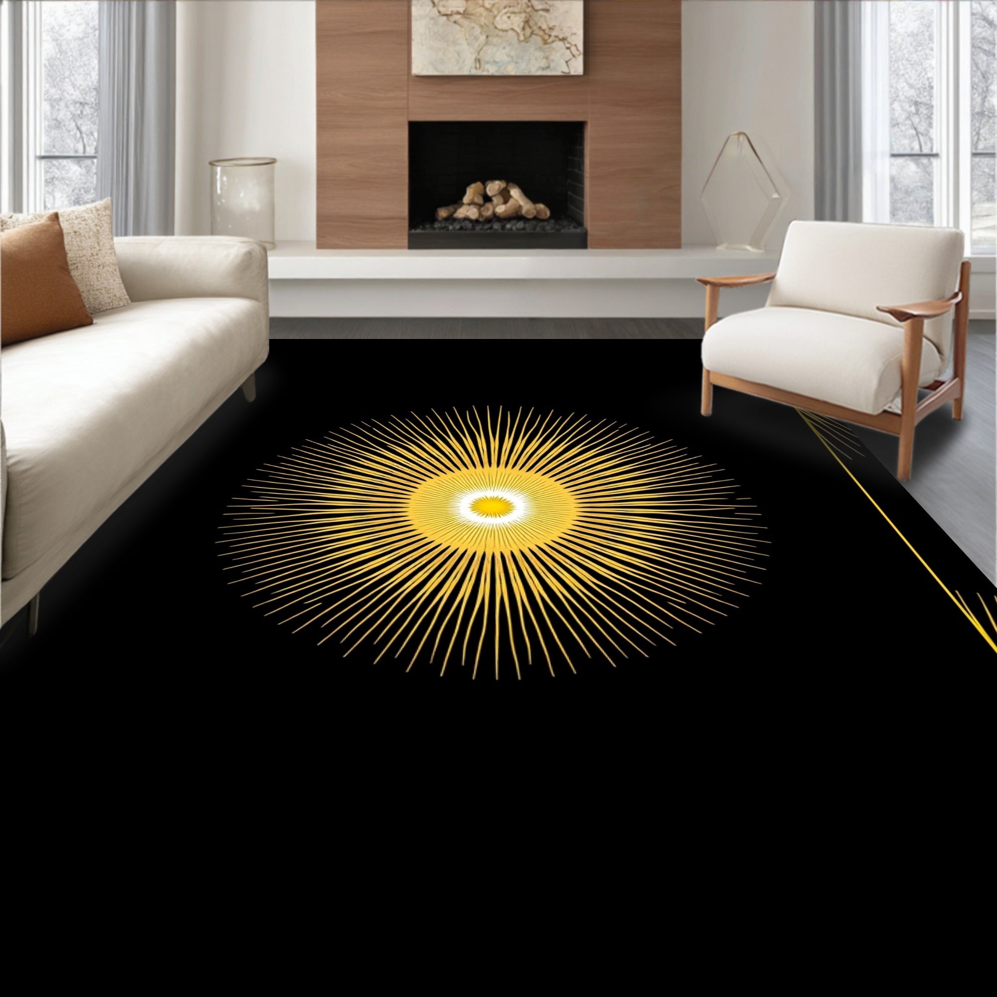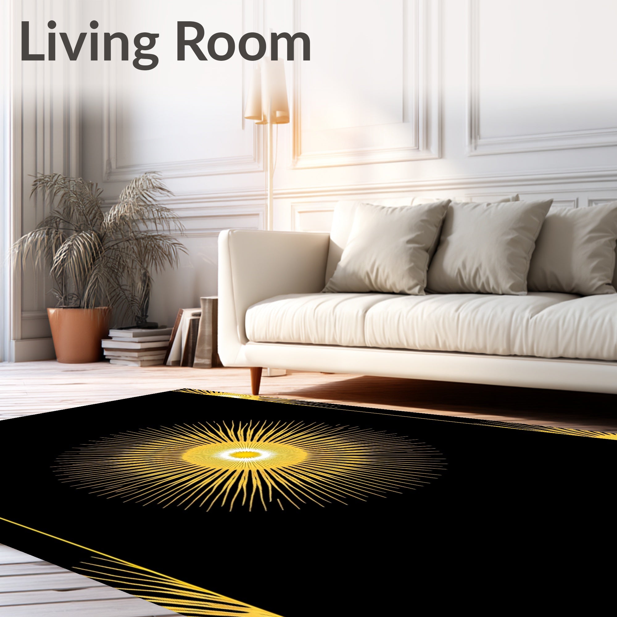 Ultra Soft Area Rug, Non Slip, Stain Resistant, Washable Area Rugs for Living Room, Bedroom, Celestial Starburst Design with Radiant Gold Highlights(Black) Overview:
