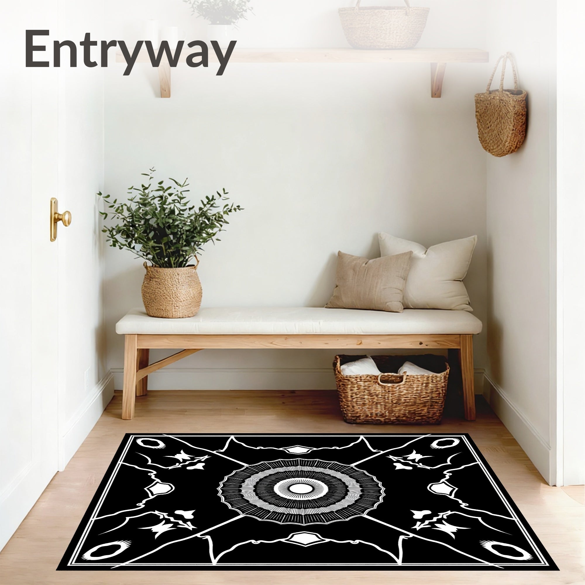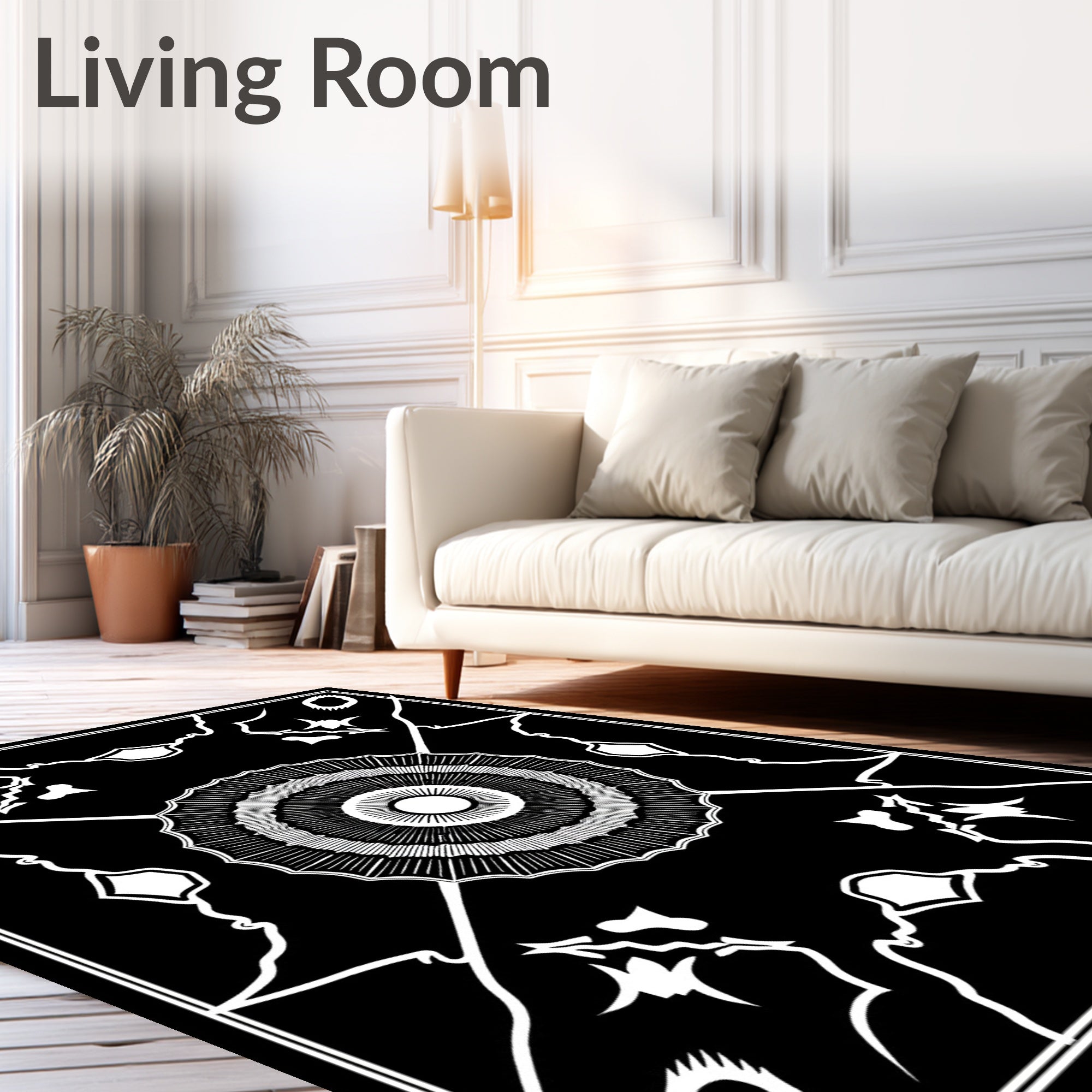 Ultra Soft Area Rug, Non Slip, Stain Resistant, Washable Area Rugs for Living Room, Bedroom, Celestial Starburst Motif with Abstract Interlocking Lines(Black) Overview:
