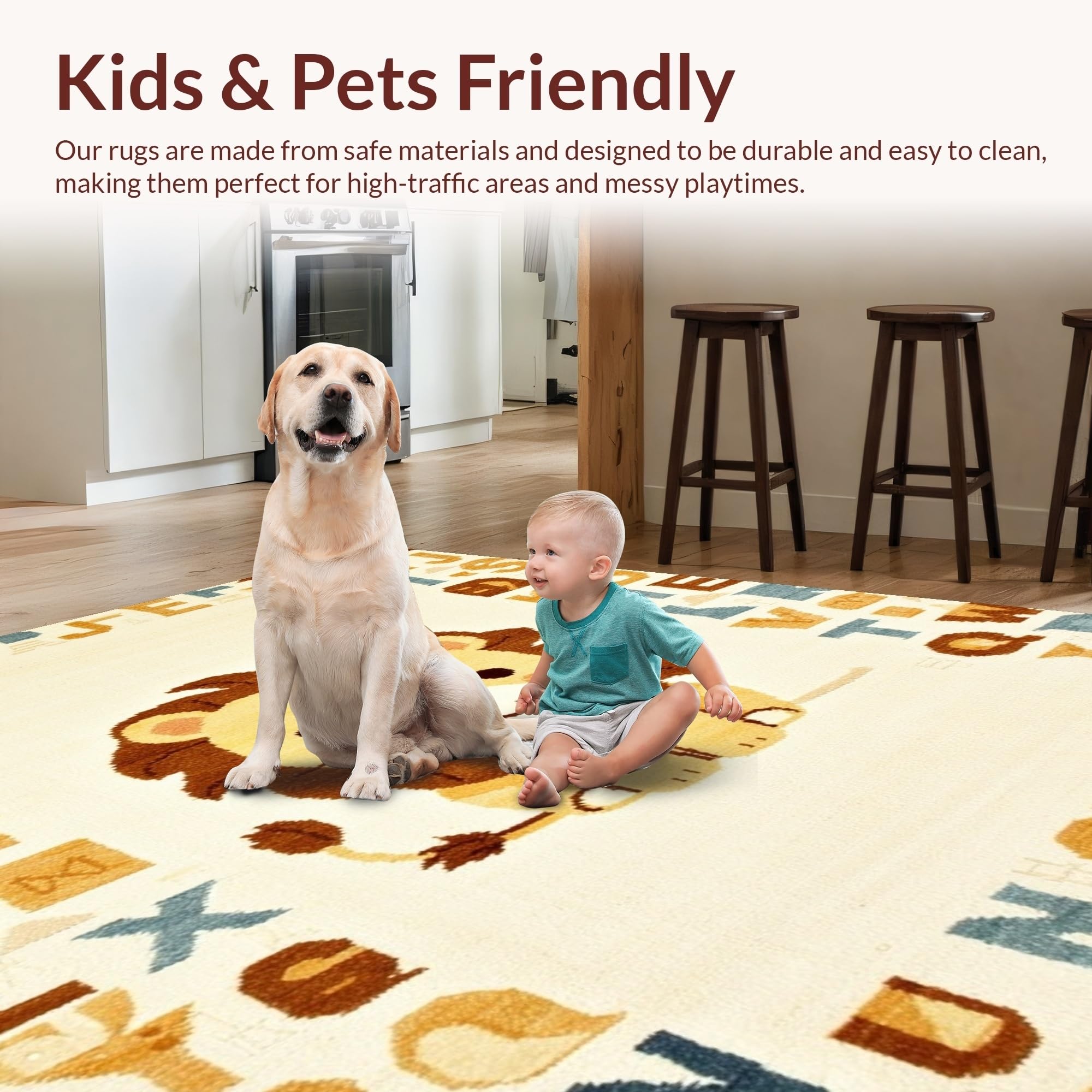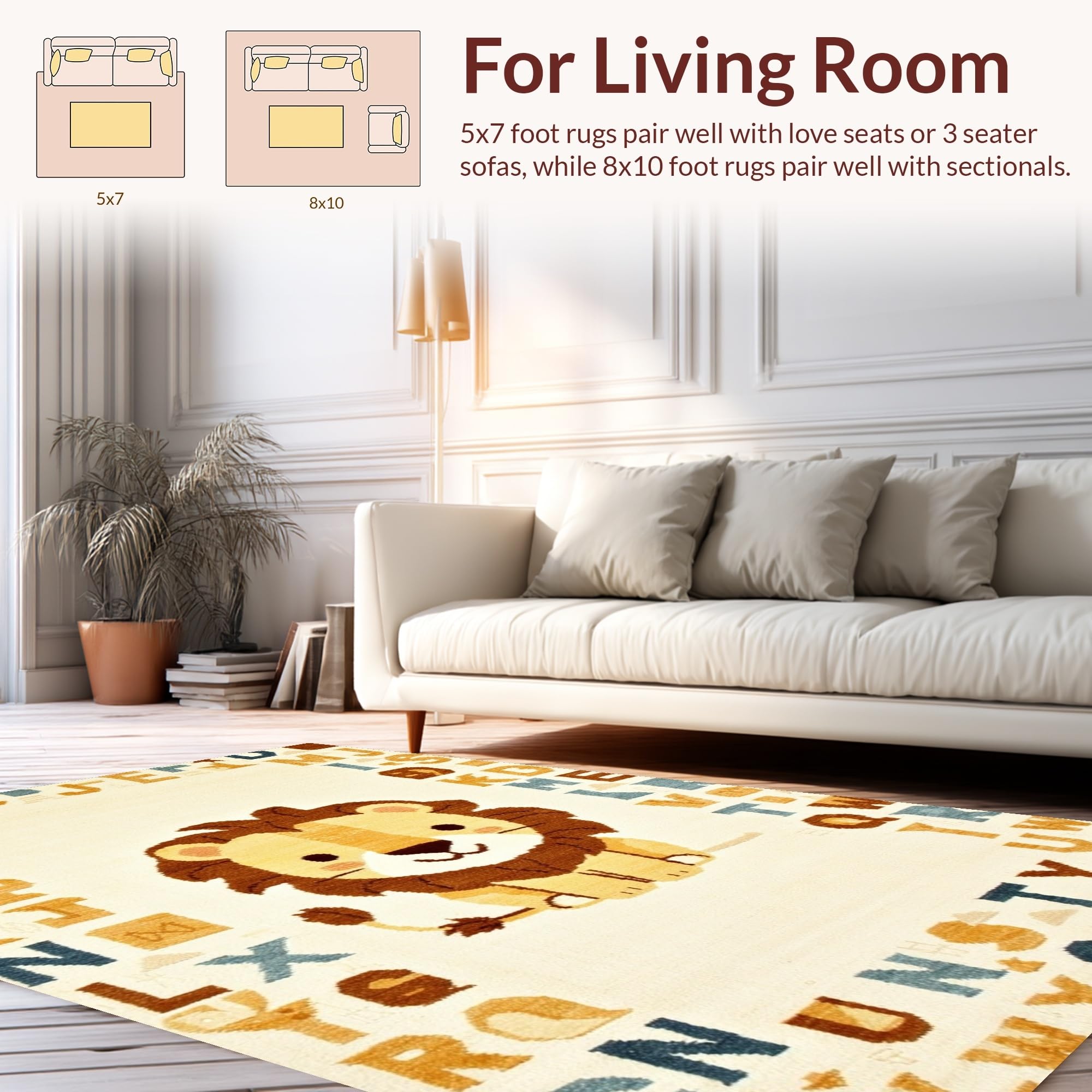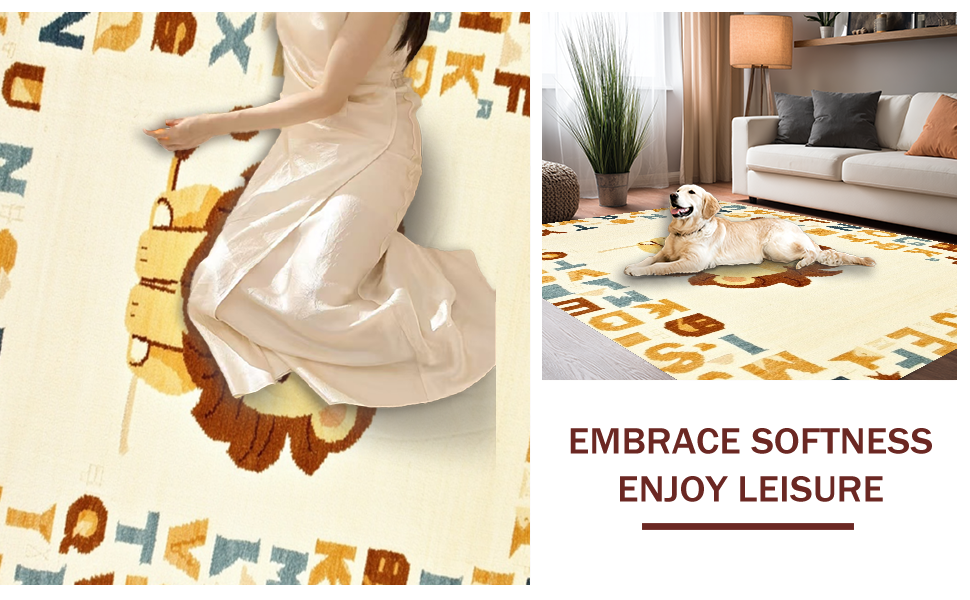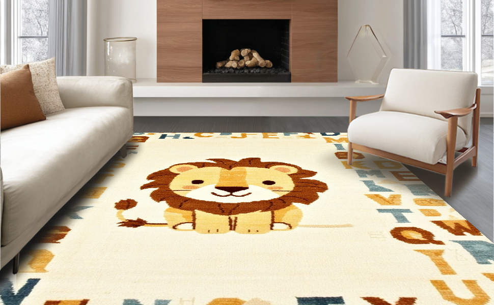 Ultra Soft Area Rug, Non Slip, Stain Resistant, Washable Area Rugs for Living Room, Bedroom, Charming Alphabetic Lion Art(Beige) Overview:
