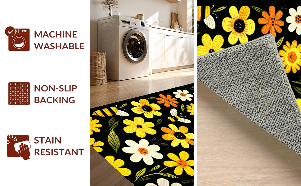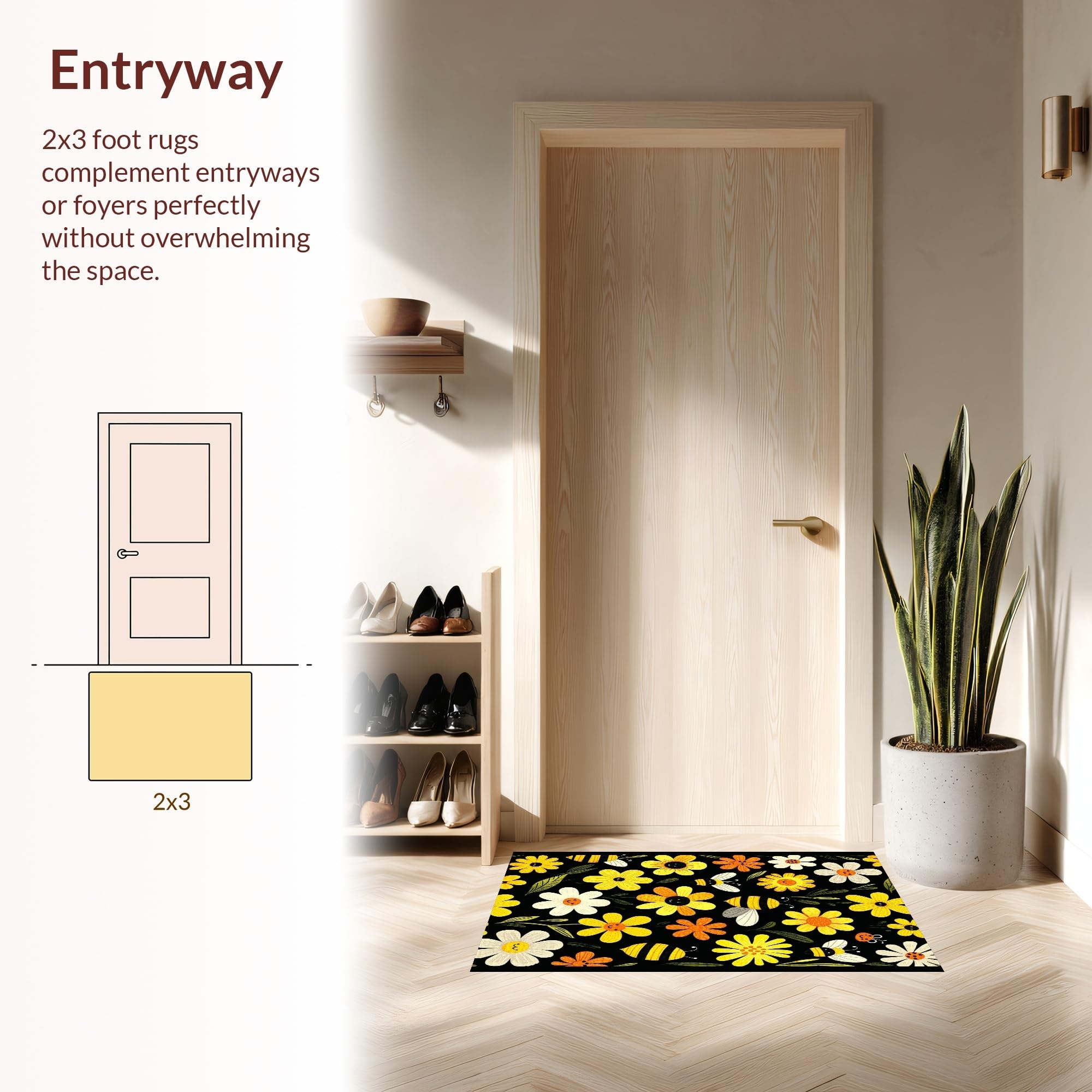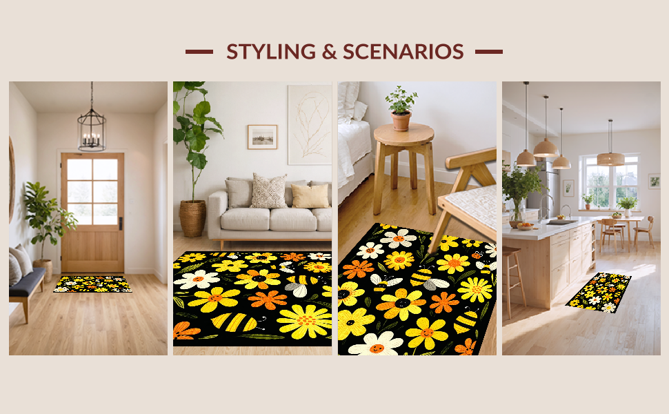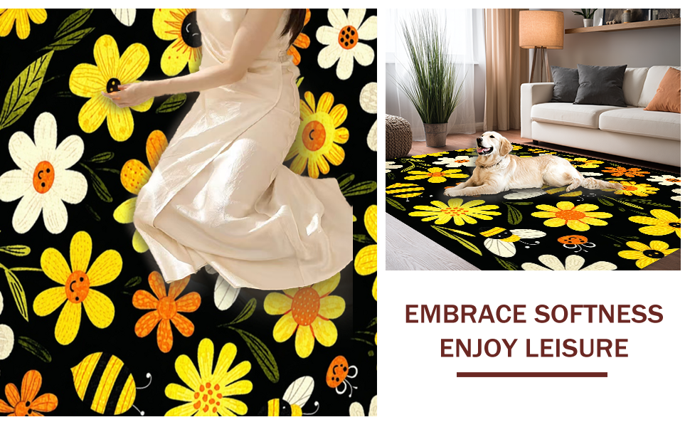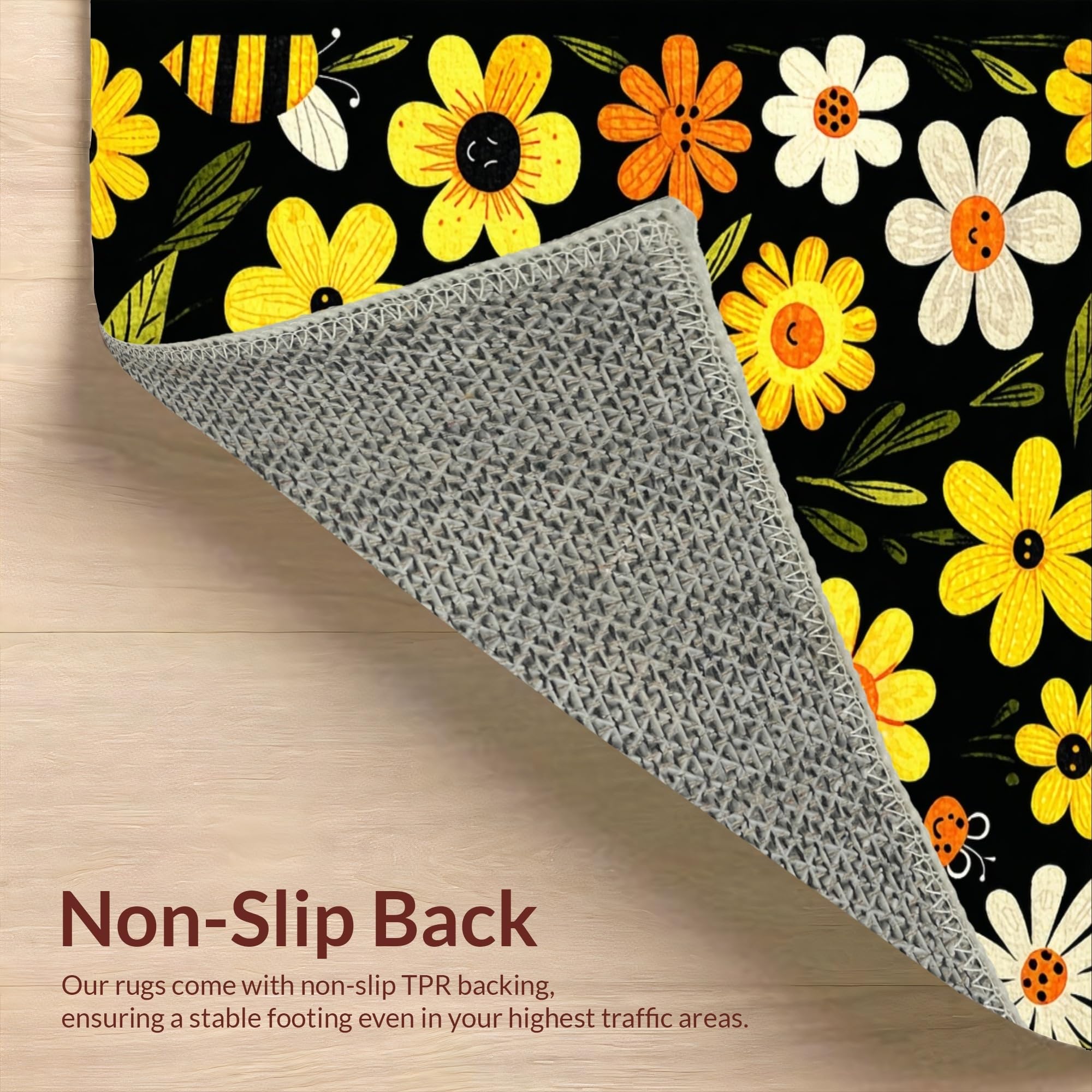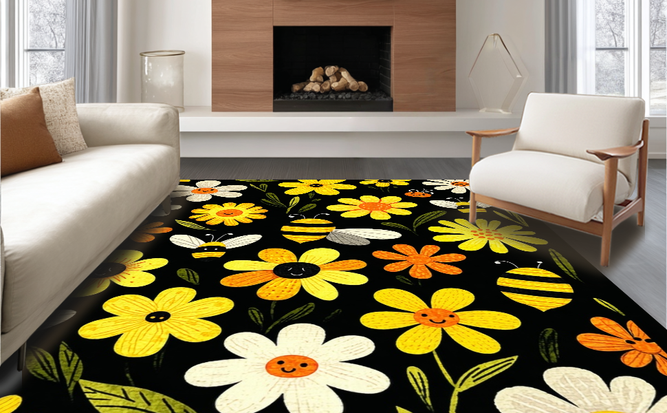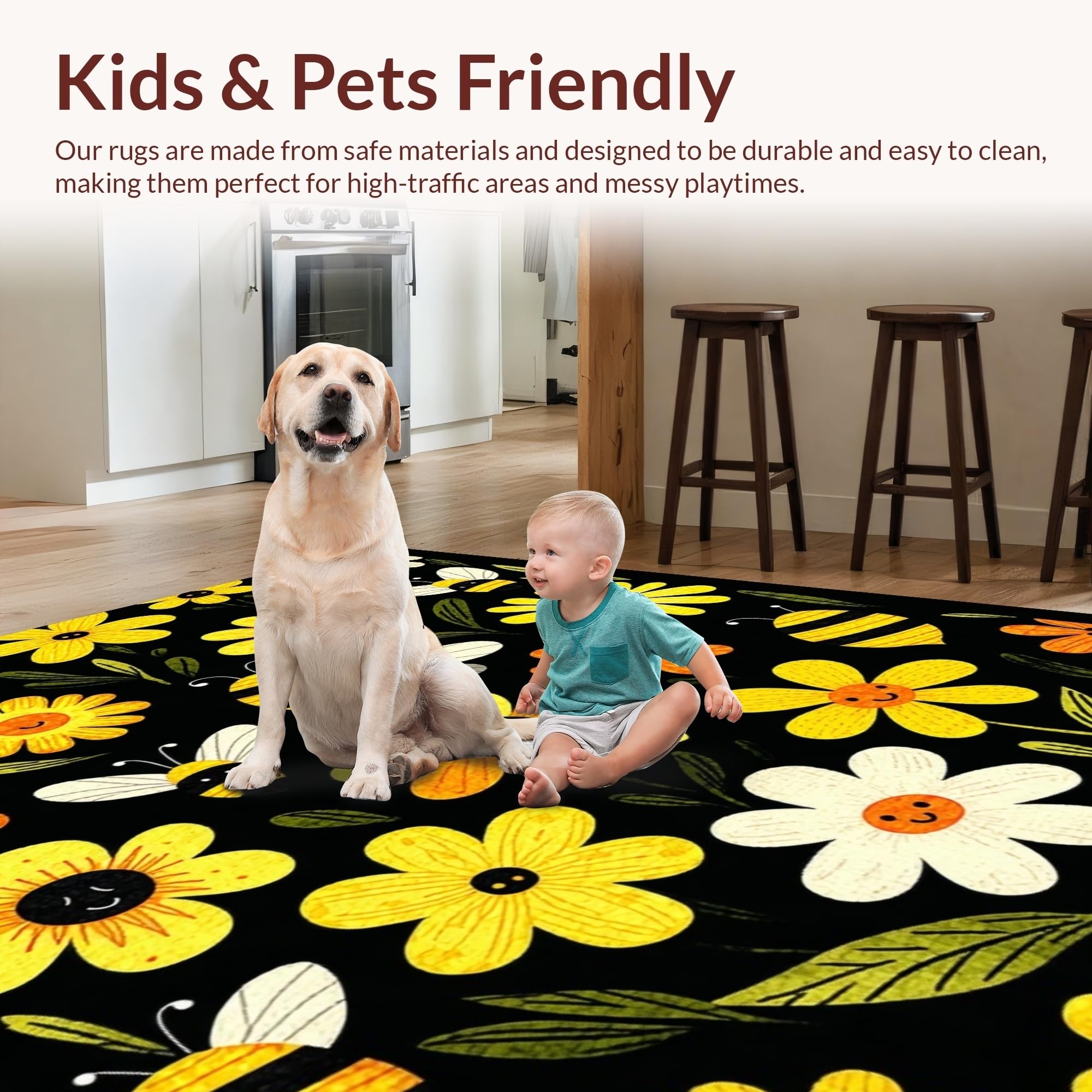 Ultra Soft Area Rug, Non Slip, Stain Resistant, Washable Area Rugs for Living Room, Bedroom, Charming Bee Floral Arrangement(Yellow) Overview: