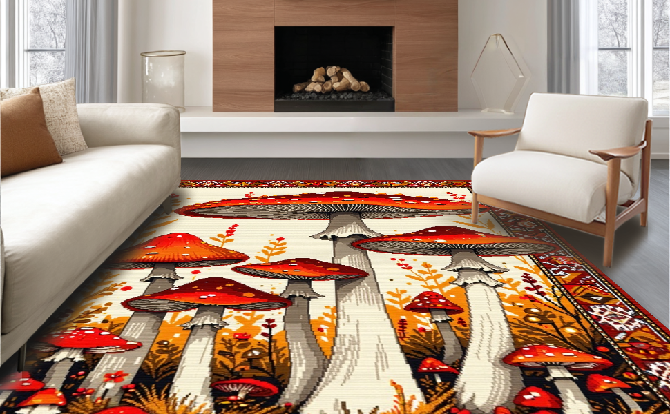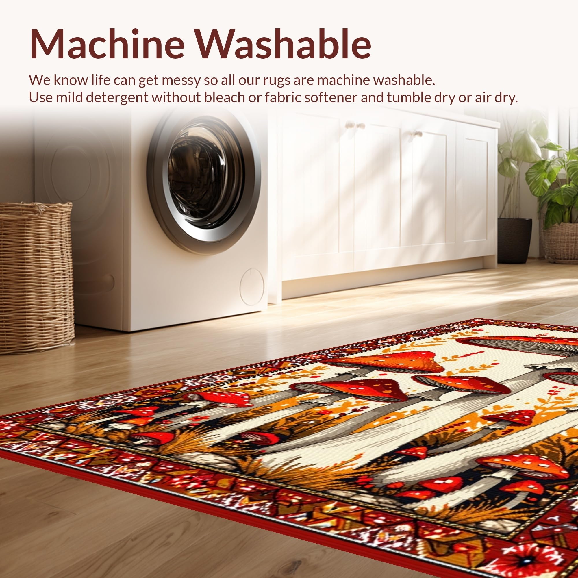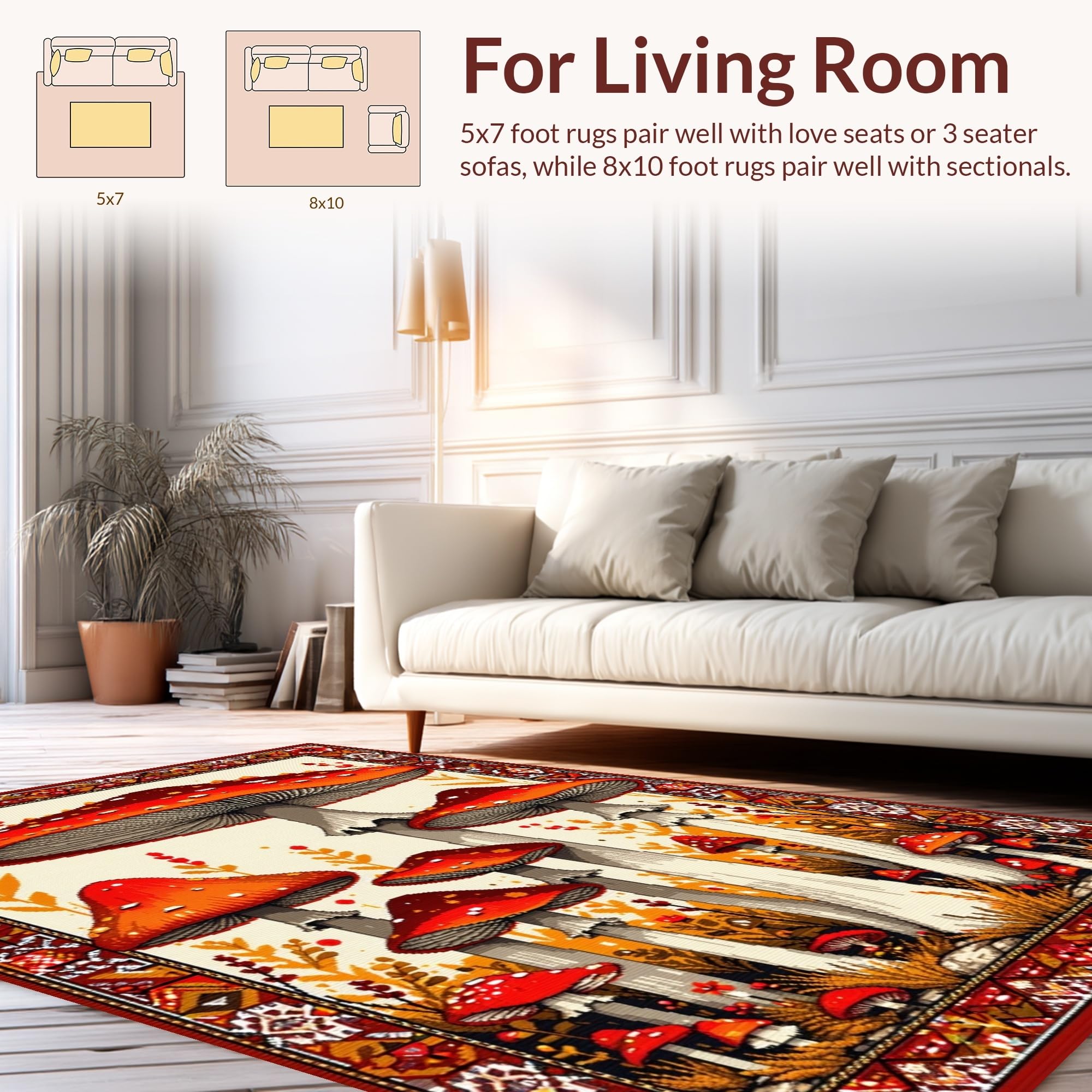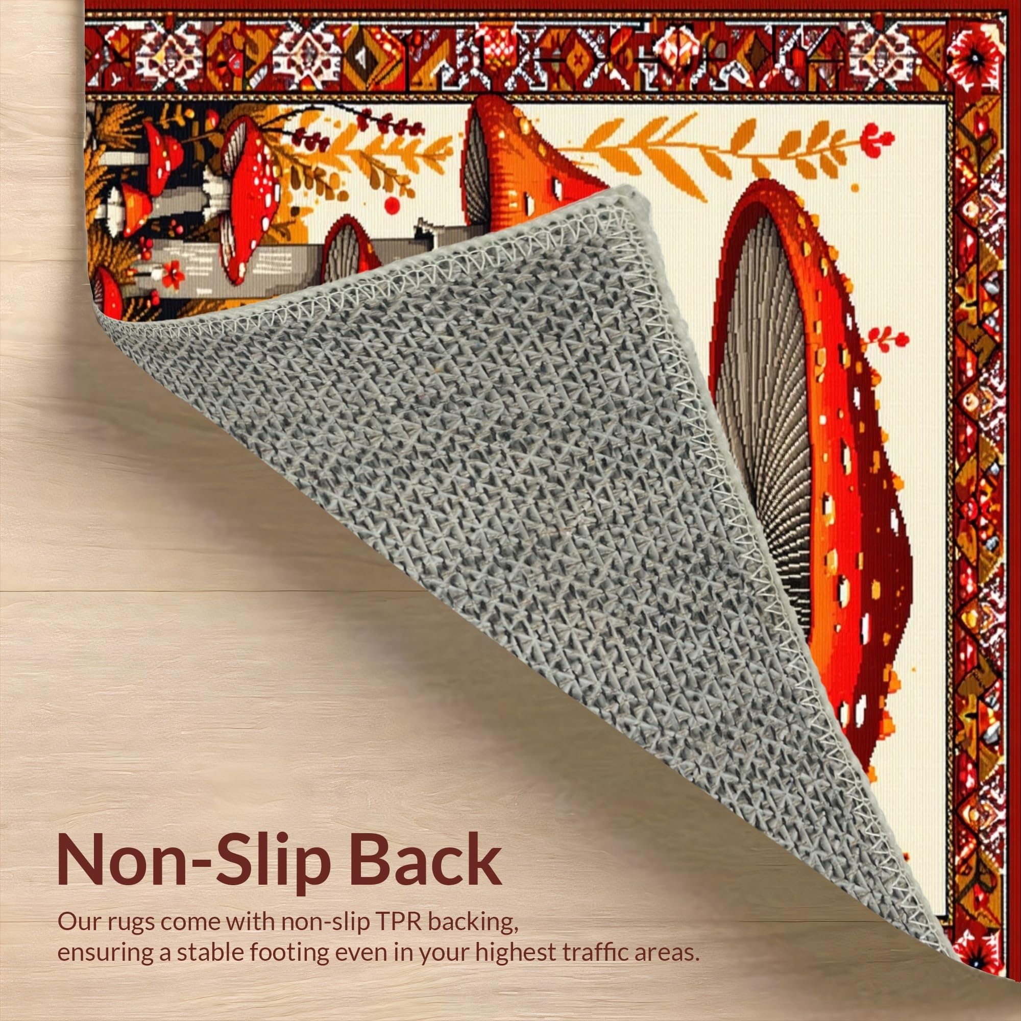 Ultra Soft Area Rug, Non Slip, Stain Resistant, Washable Area Rugs for Living Room, Bedroom, Charming Earthy Toned Fungi Motif(Red) Overview: