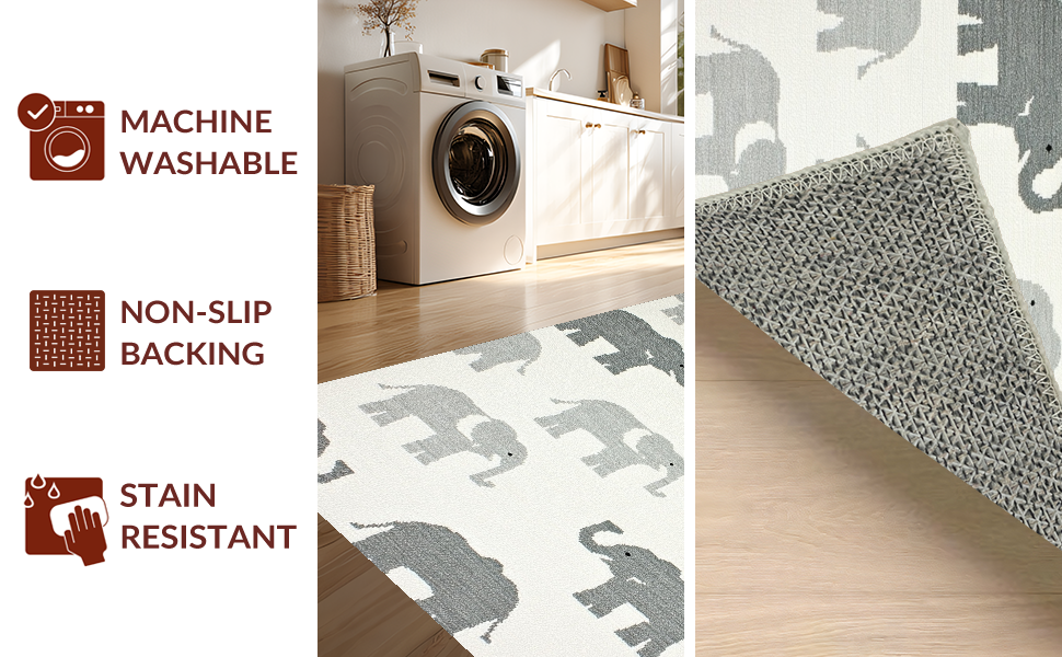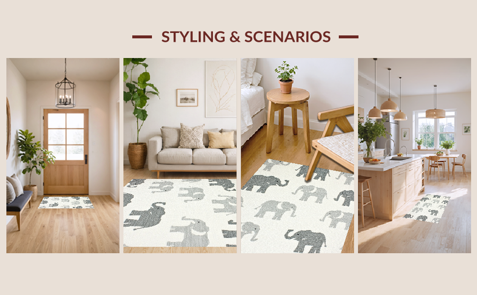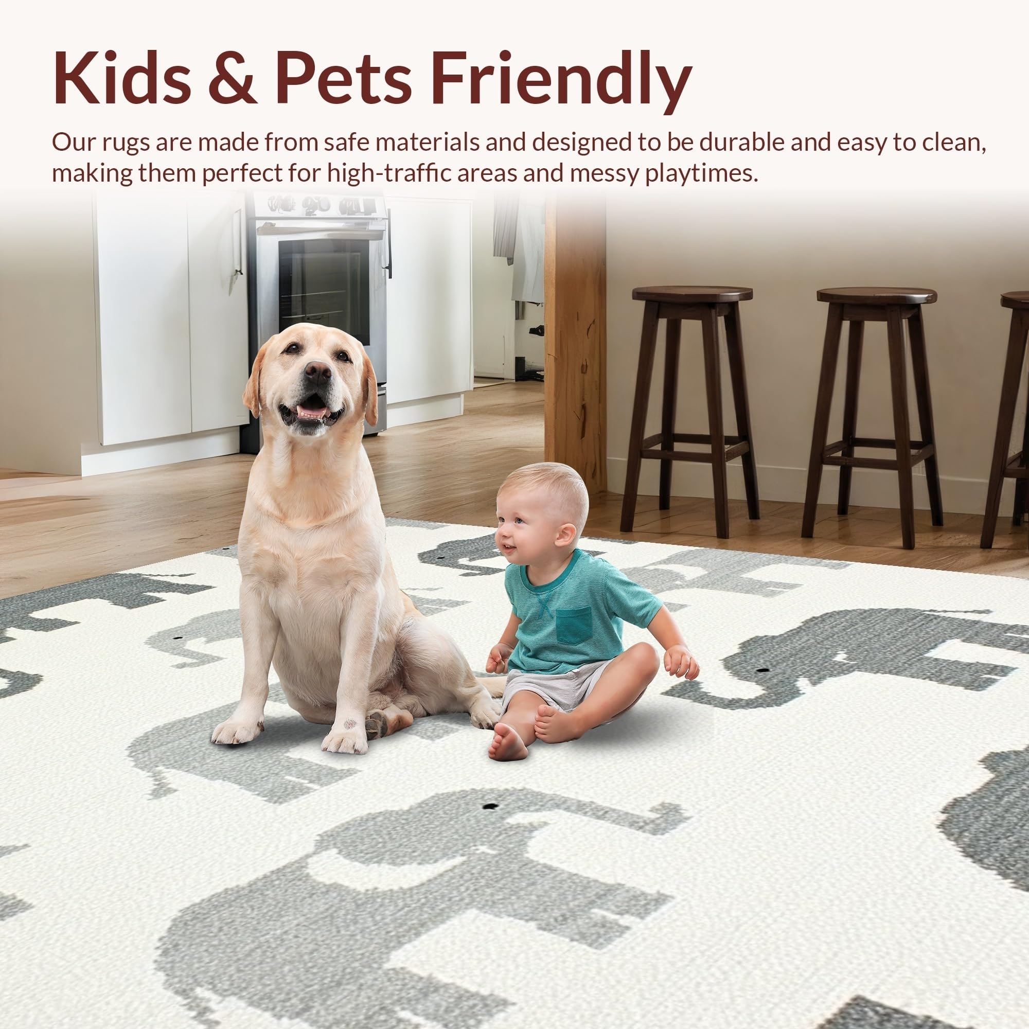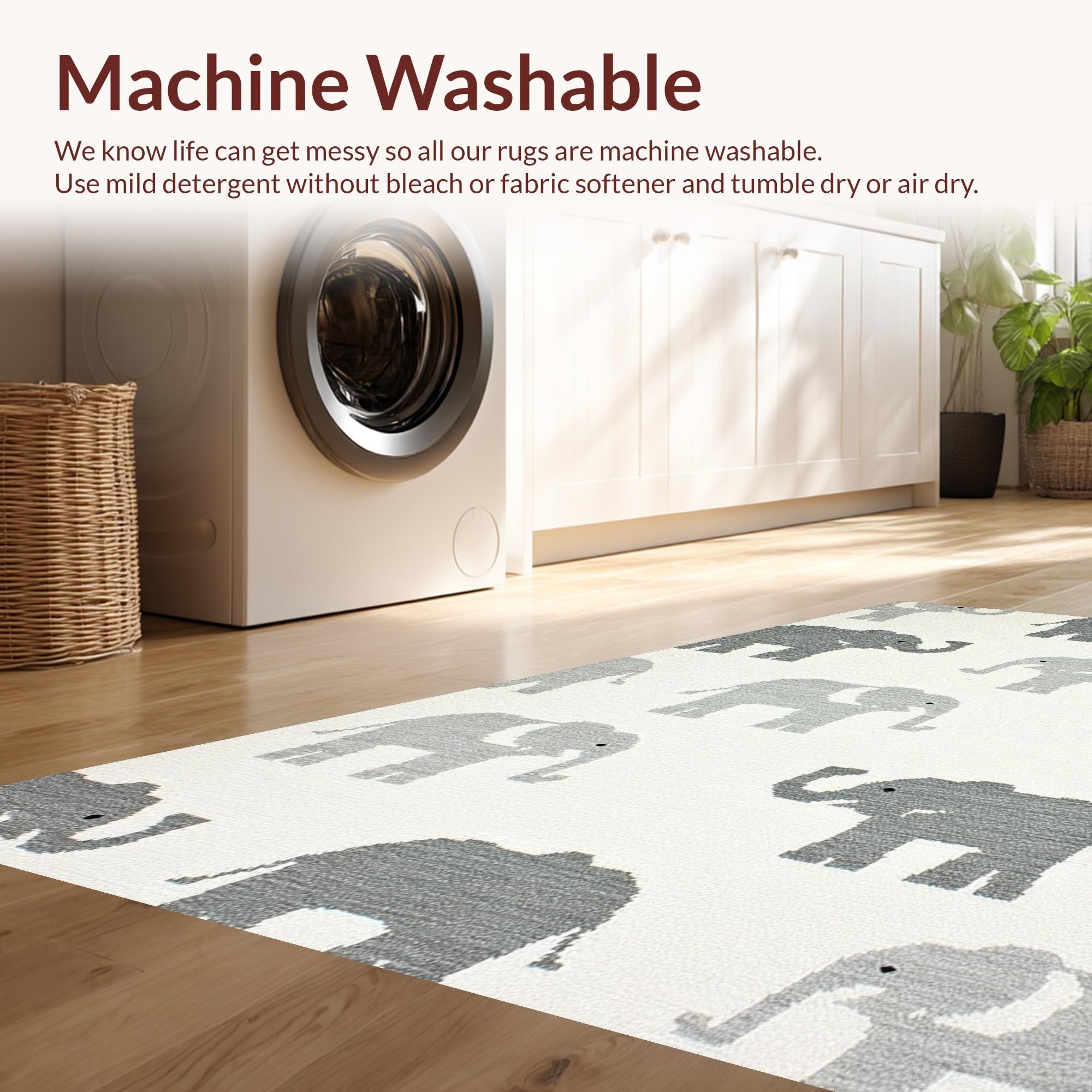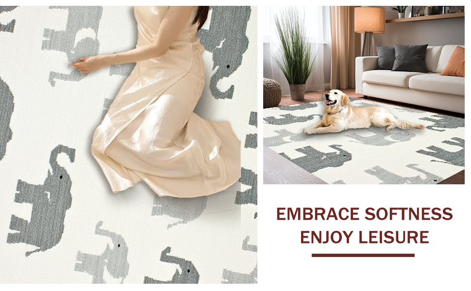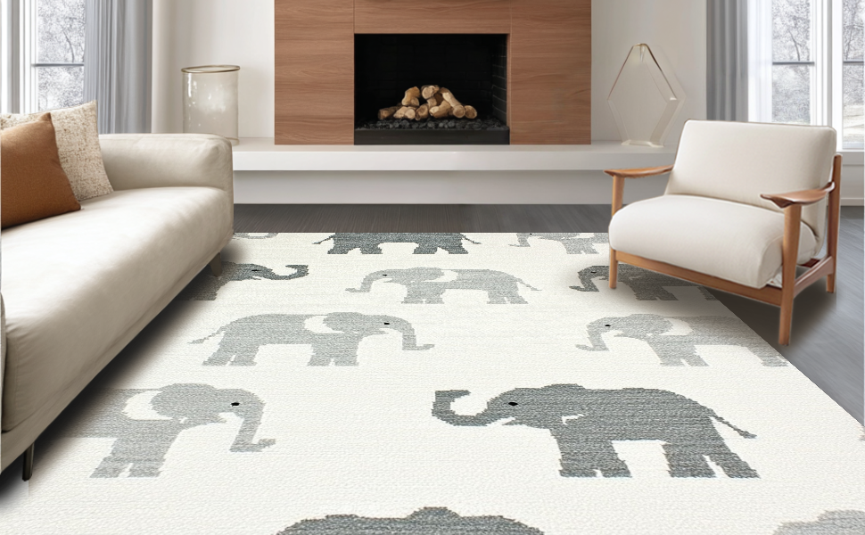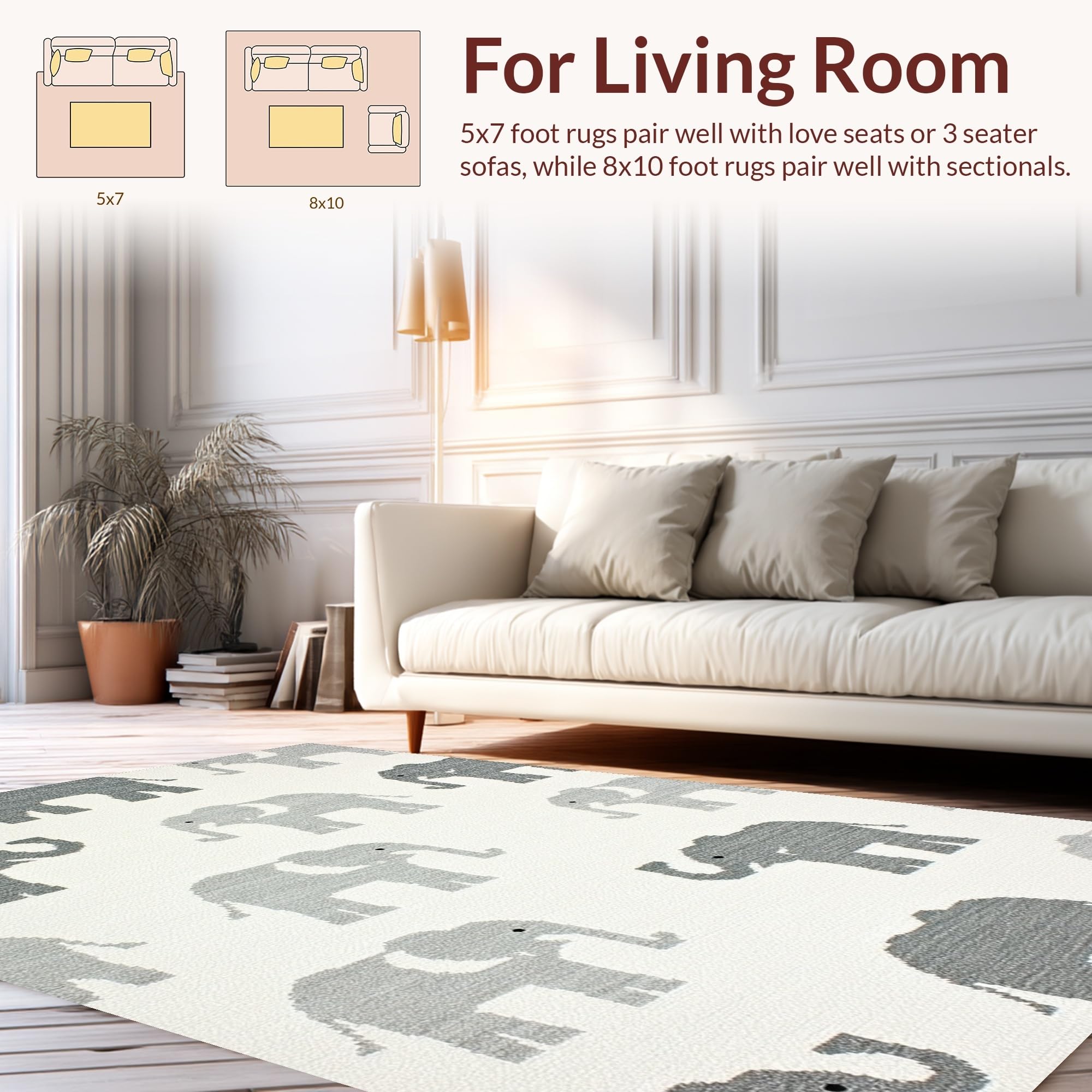 Ultra Soft Area Rug, Non Slip, Stain Resistant, Washable Area Rugs for Living Room, Bedroom, Charming Elephant-Themed Transitional Decor(Beige) Overview: