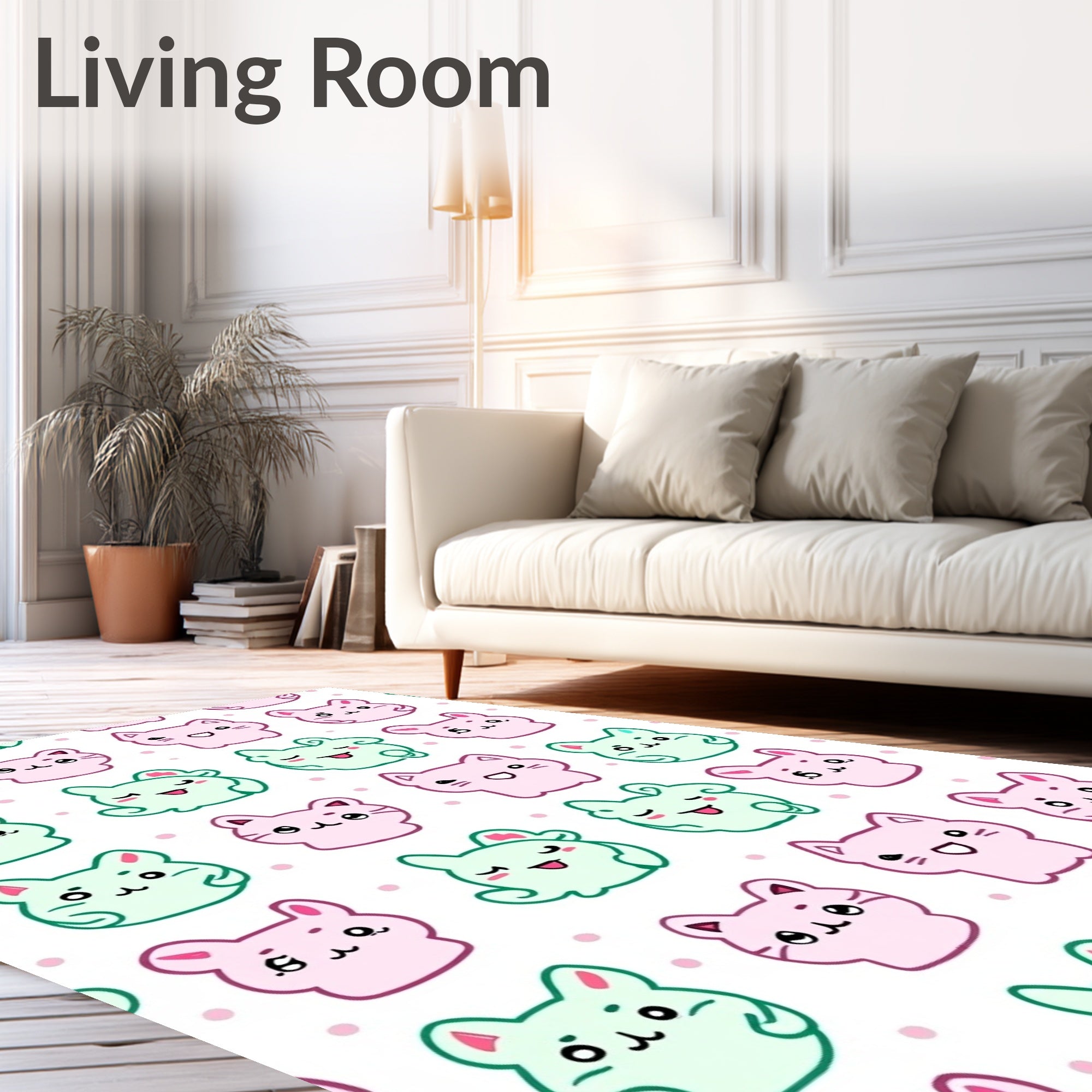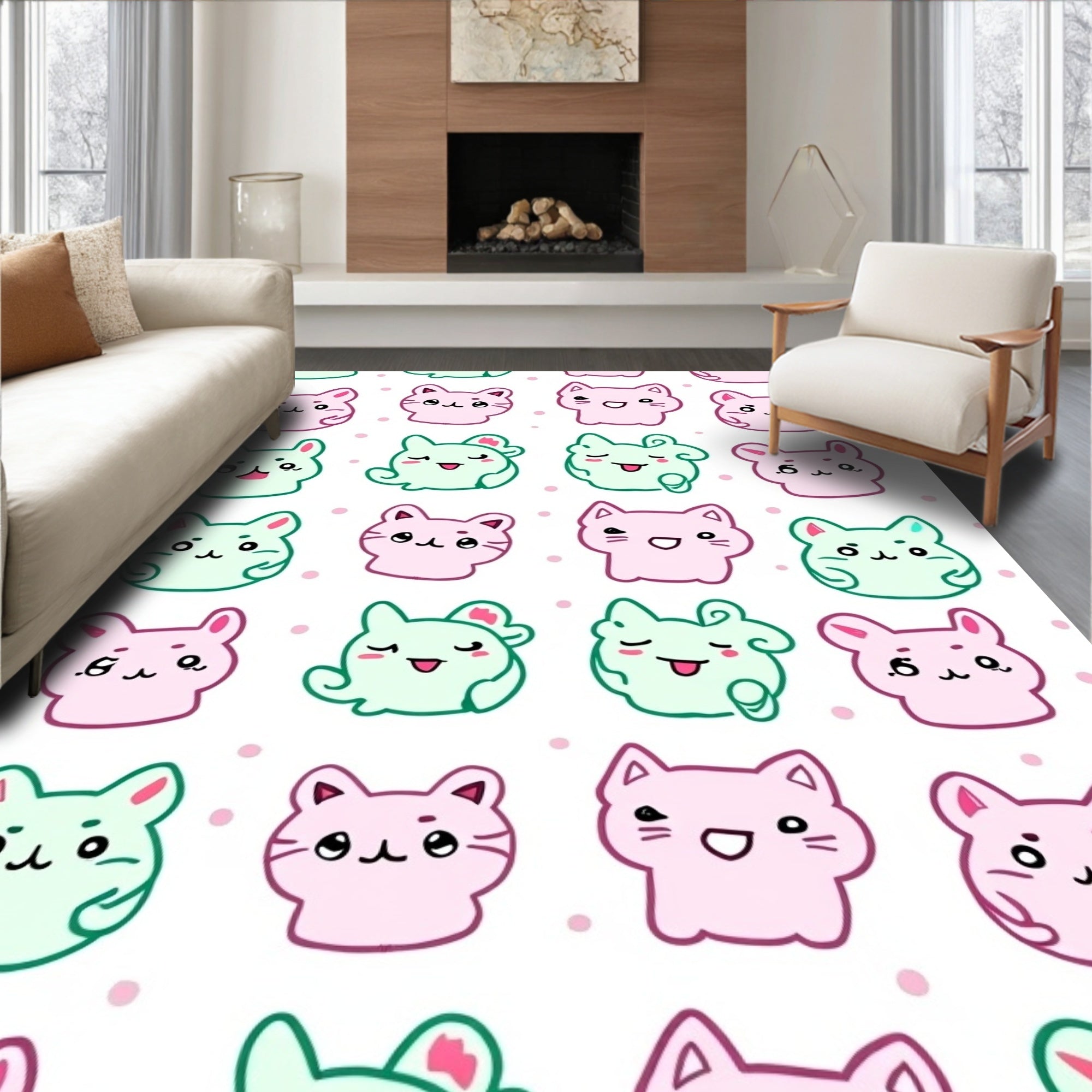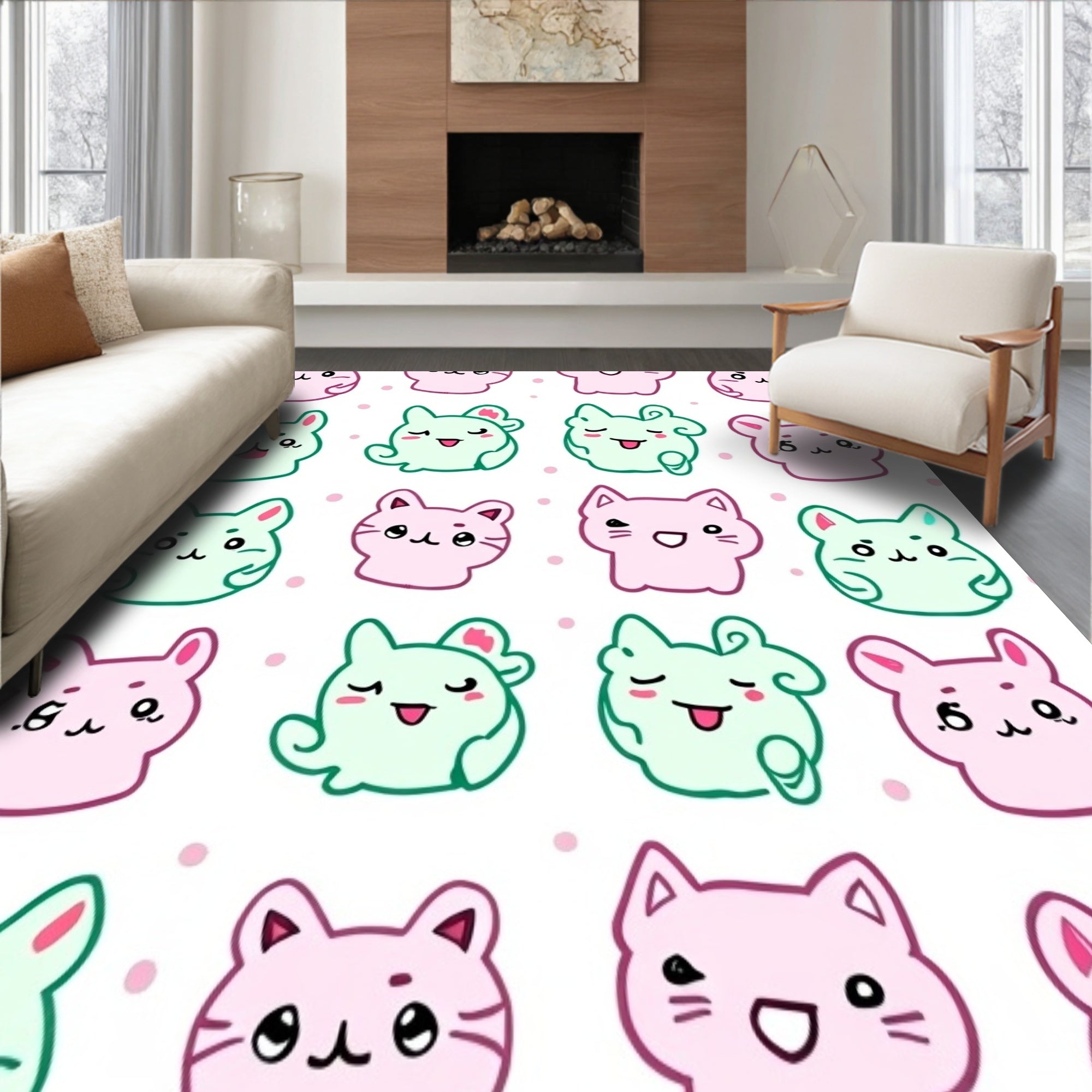 Ultra Soft Area Rug, Non Slip, Stain Resistant, Washable Area Rugs for Living Room, Bedroom, Charming Kitten Faces with Polka Dot Background and Curly Tail Details(Pink) Overview: