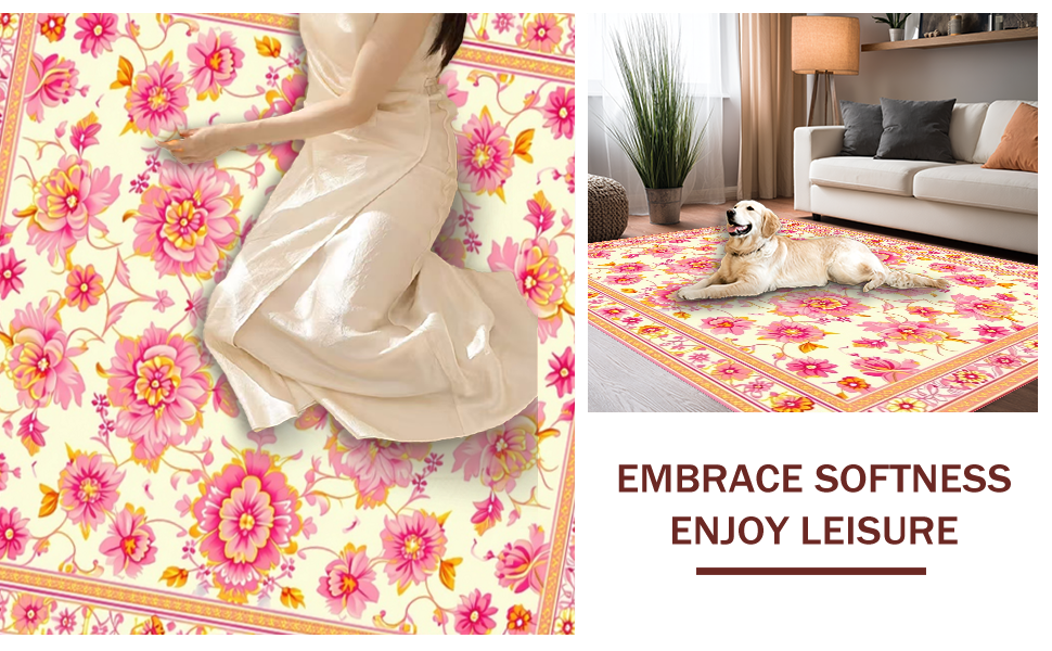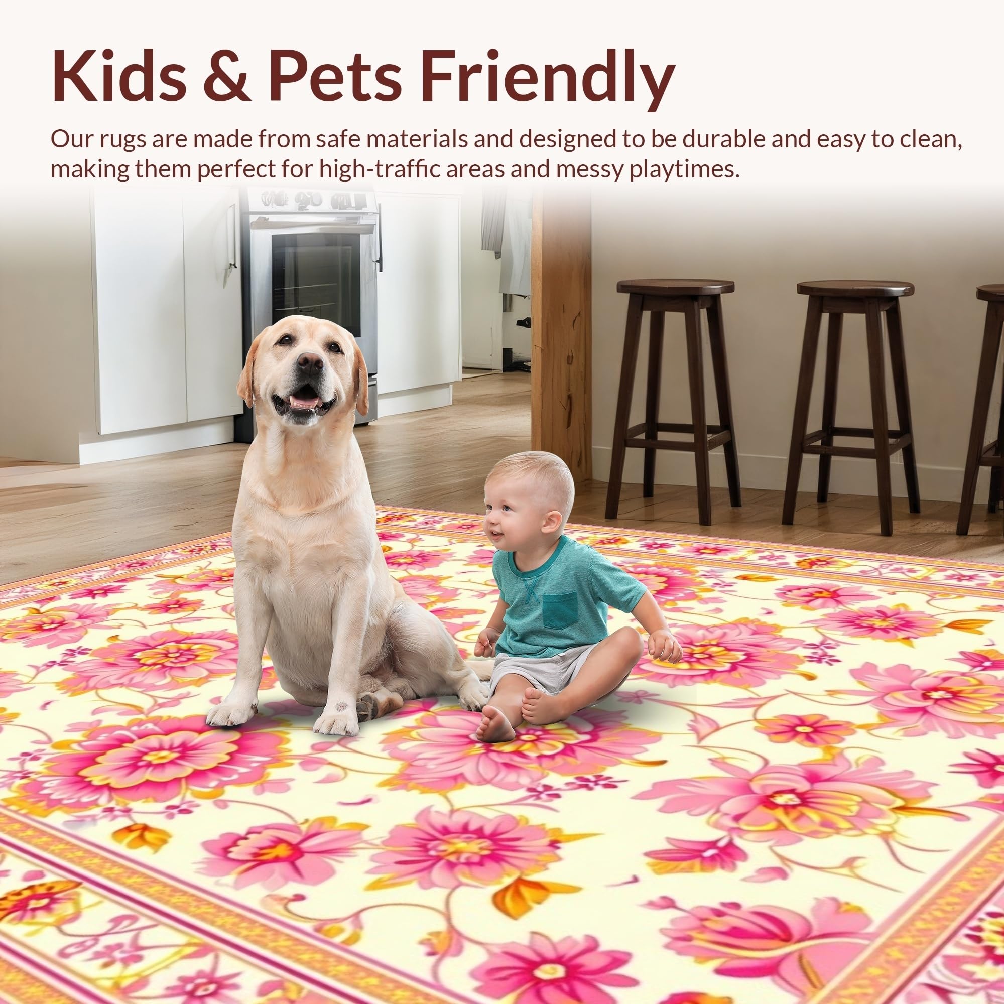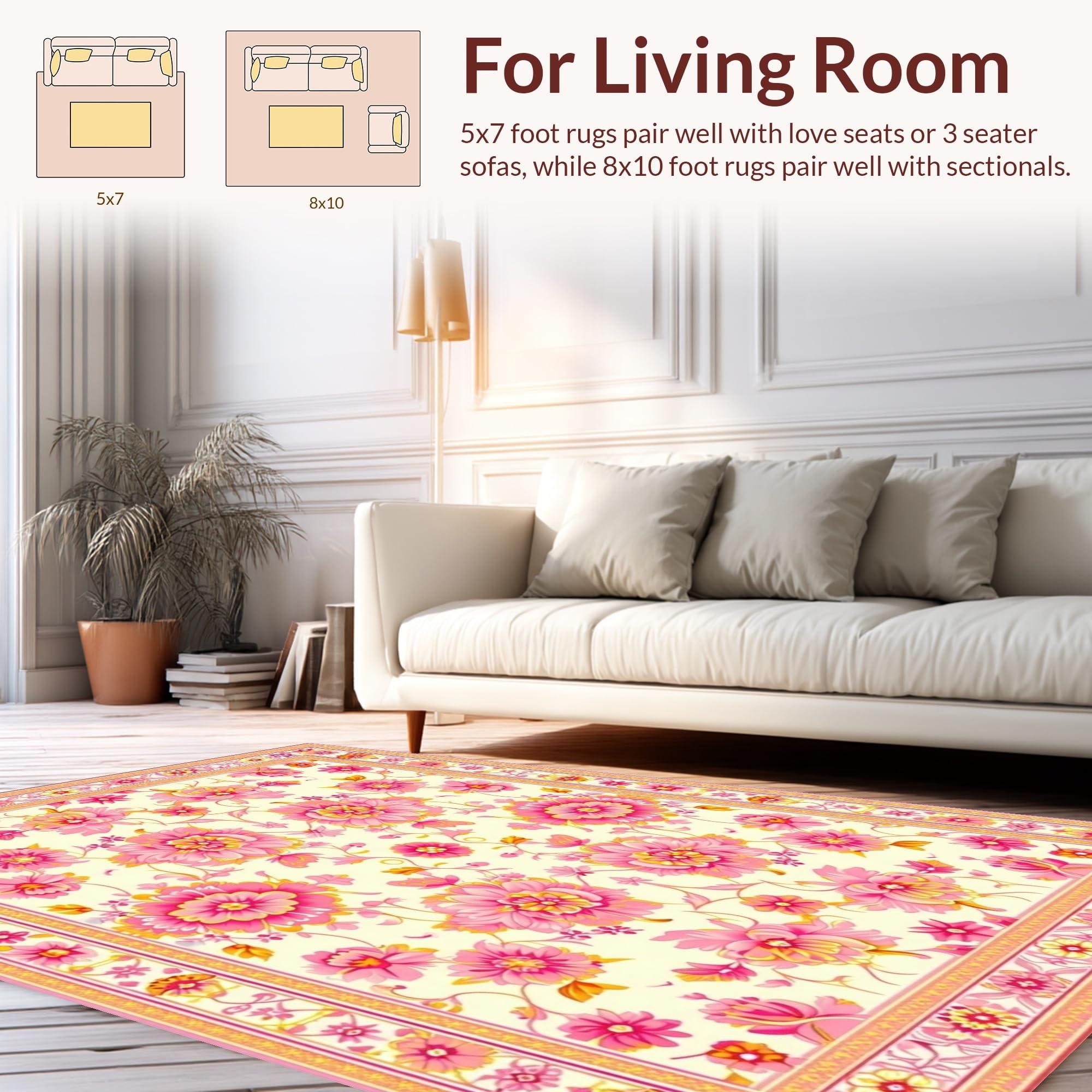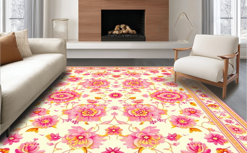 Ultra Soft Area Rug, Non Slip, Stain Resistant, Washable Area Rugs for Living Room, Bedroom, Charming Pink Textual Motif(Ivory) Overview: