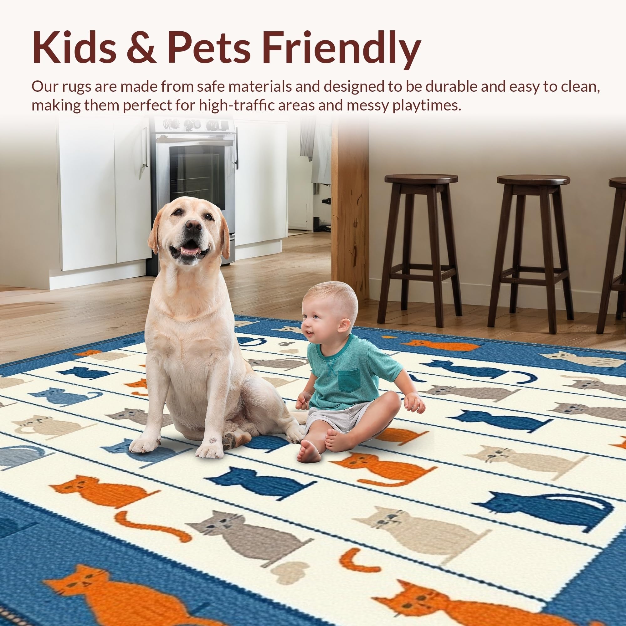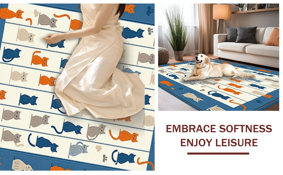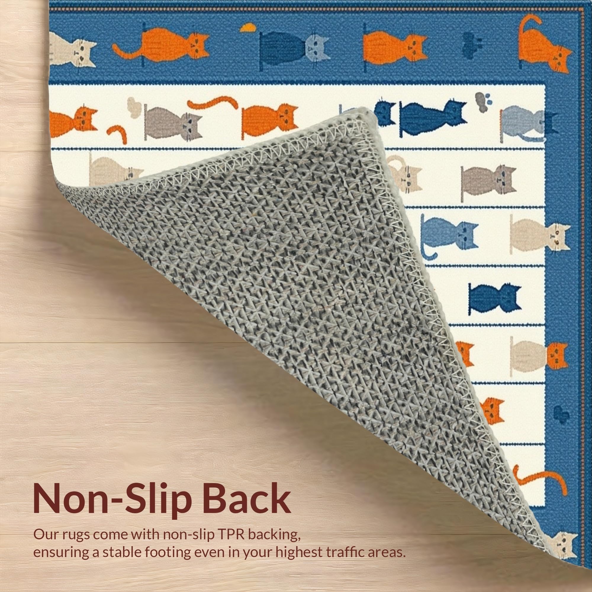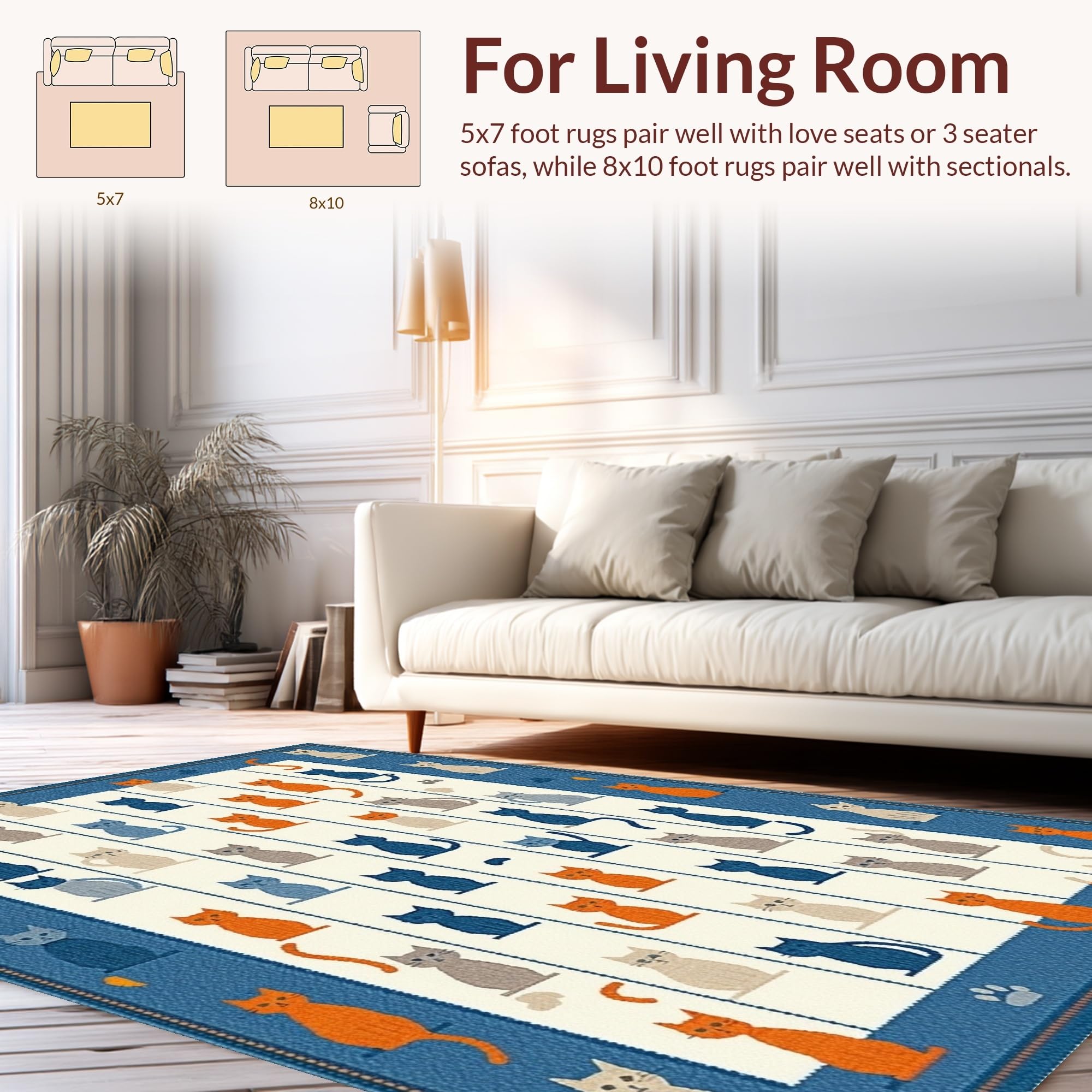 Ultra Soft Area Rug, Non Slip, Stain Resistant, Washable Area Rugs for Living Room, Bedroom, Charming Rustic Cat Illustrations(Blue) Overview:
