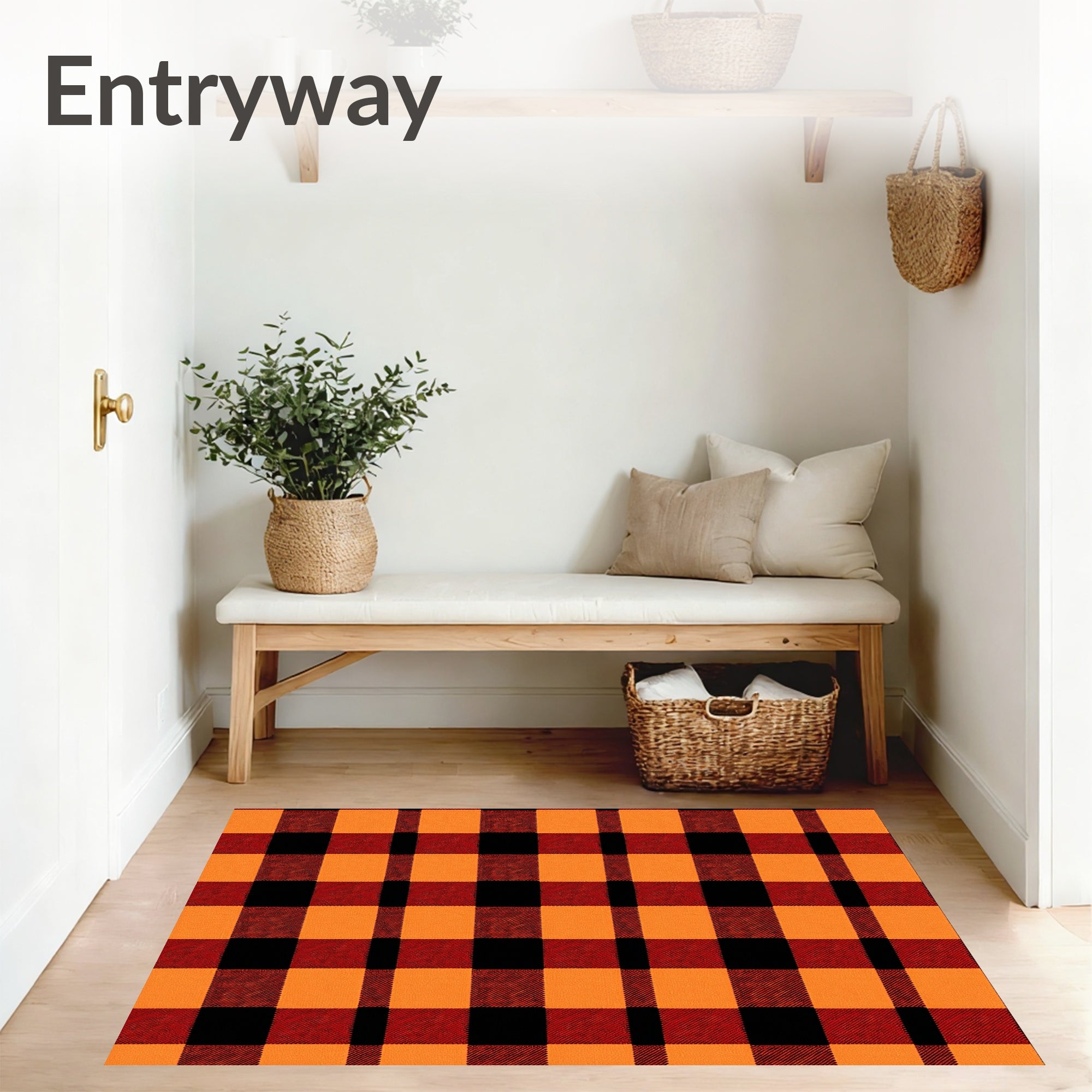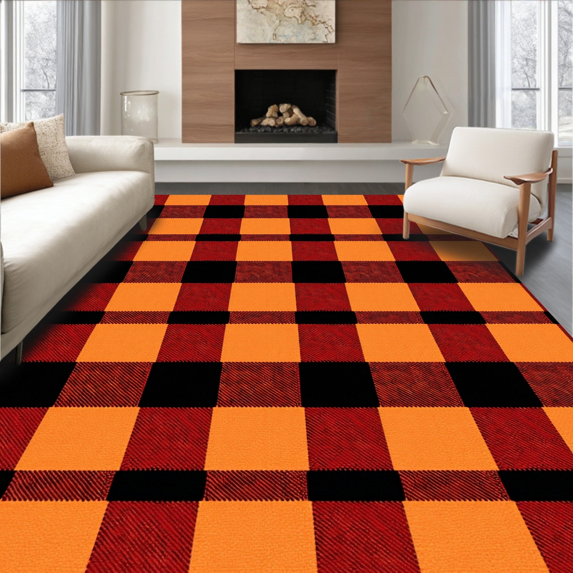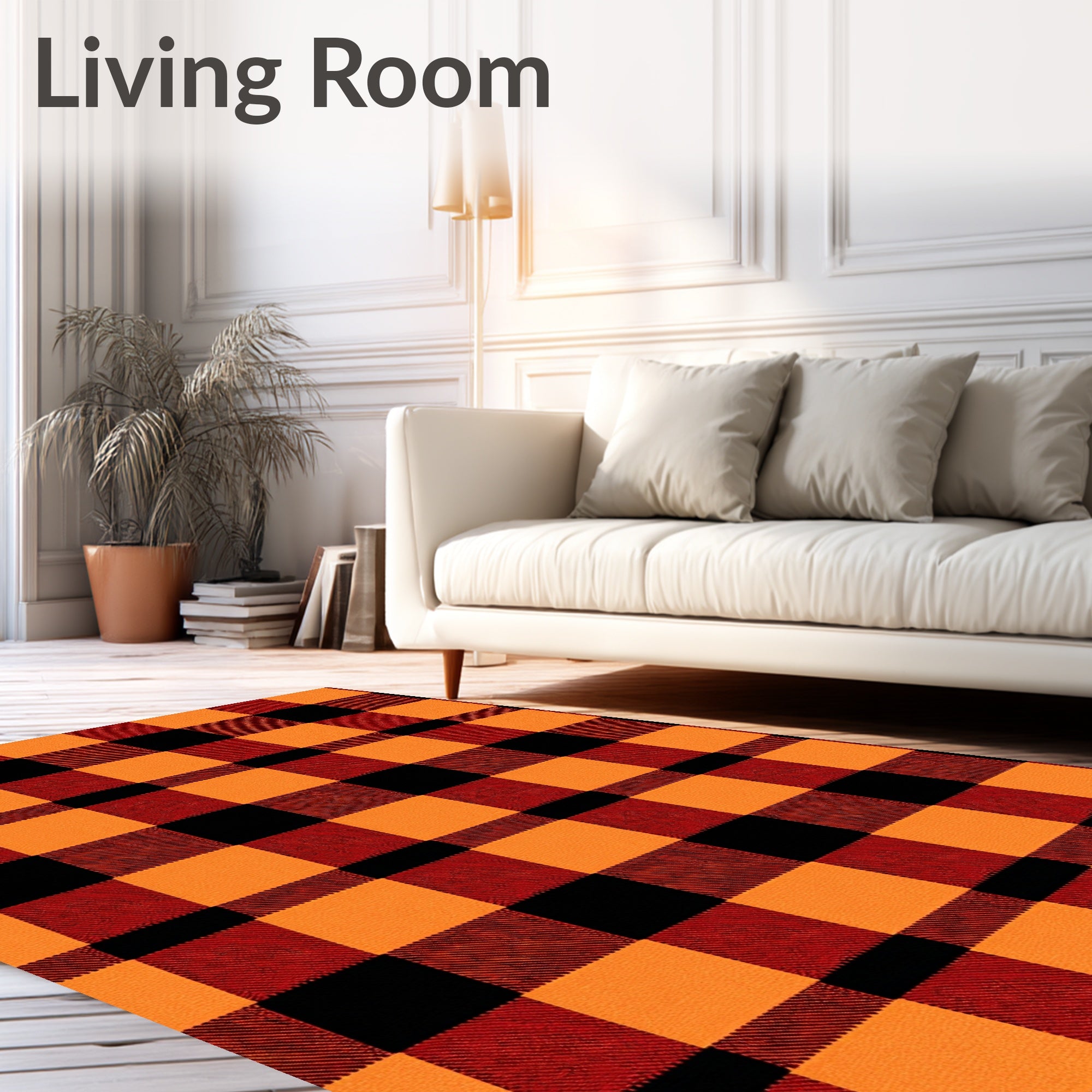 Ultra Soft Area Rug, Non Slip, Stain Resistant, Washable Area Rugs for Living Room, Bedroom, Checkered Buffalo Accent with Bold Contrasting Stripes(Orange) Overview: