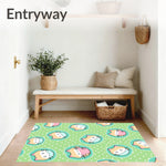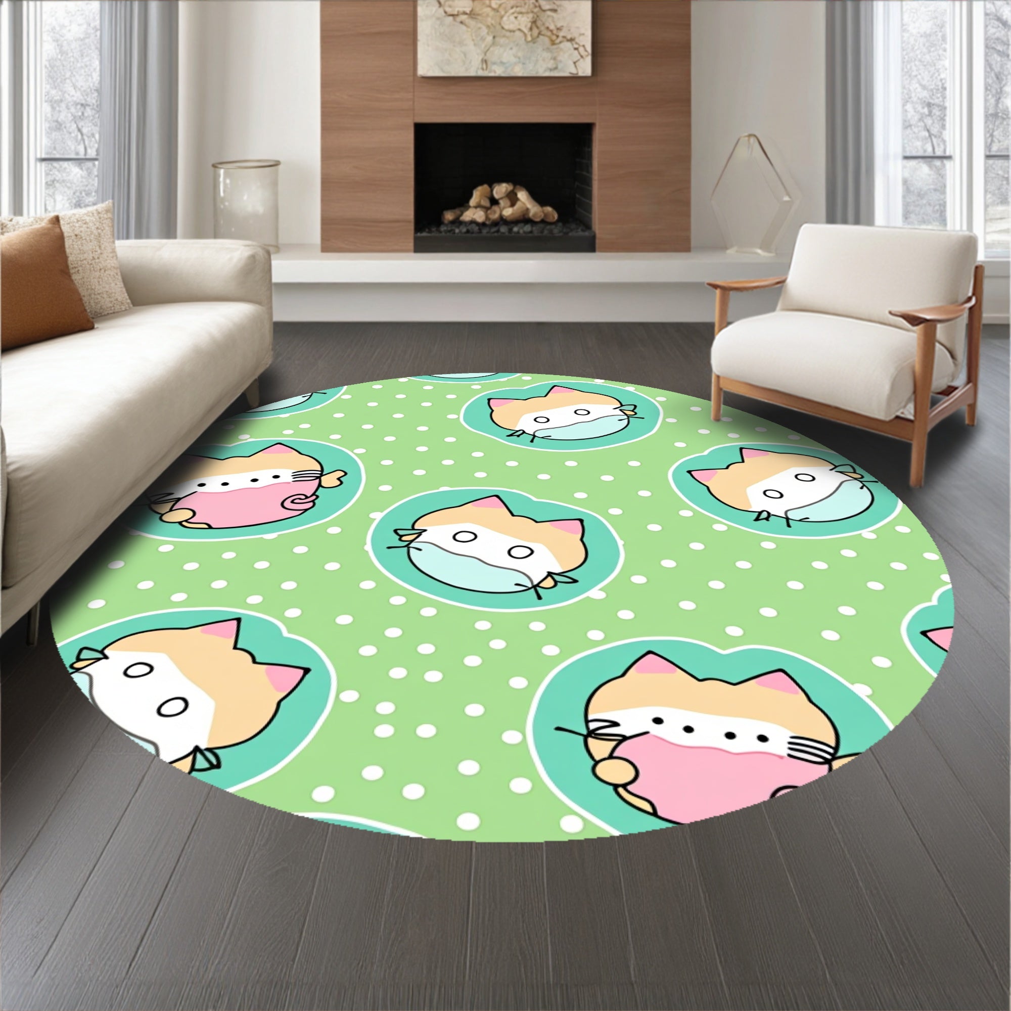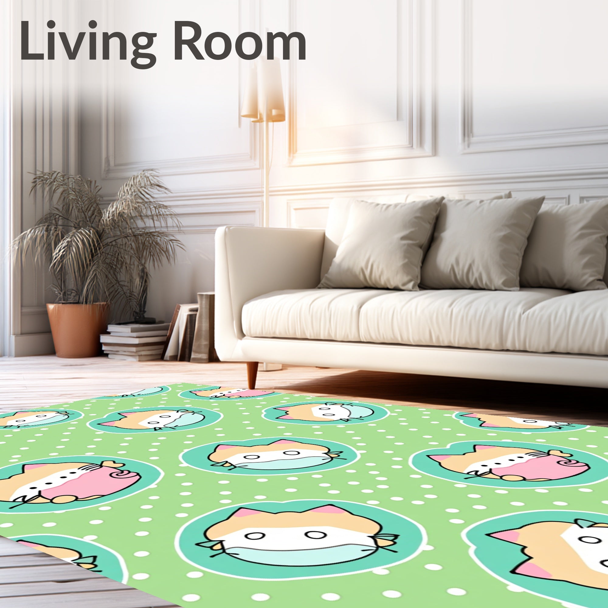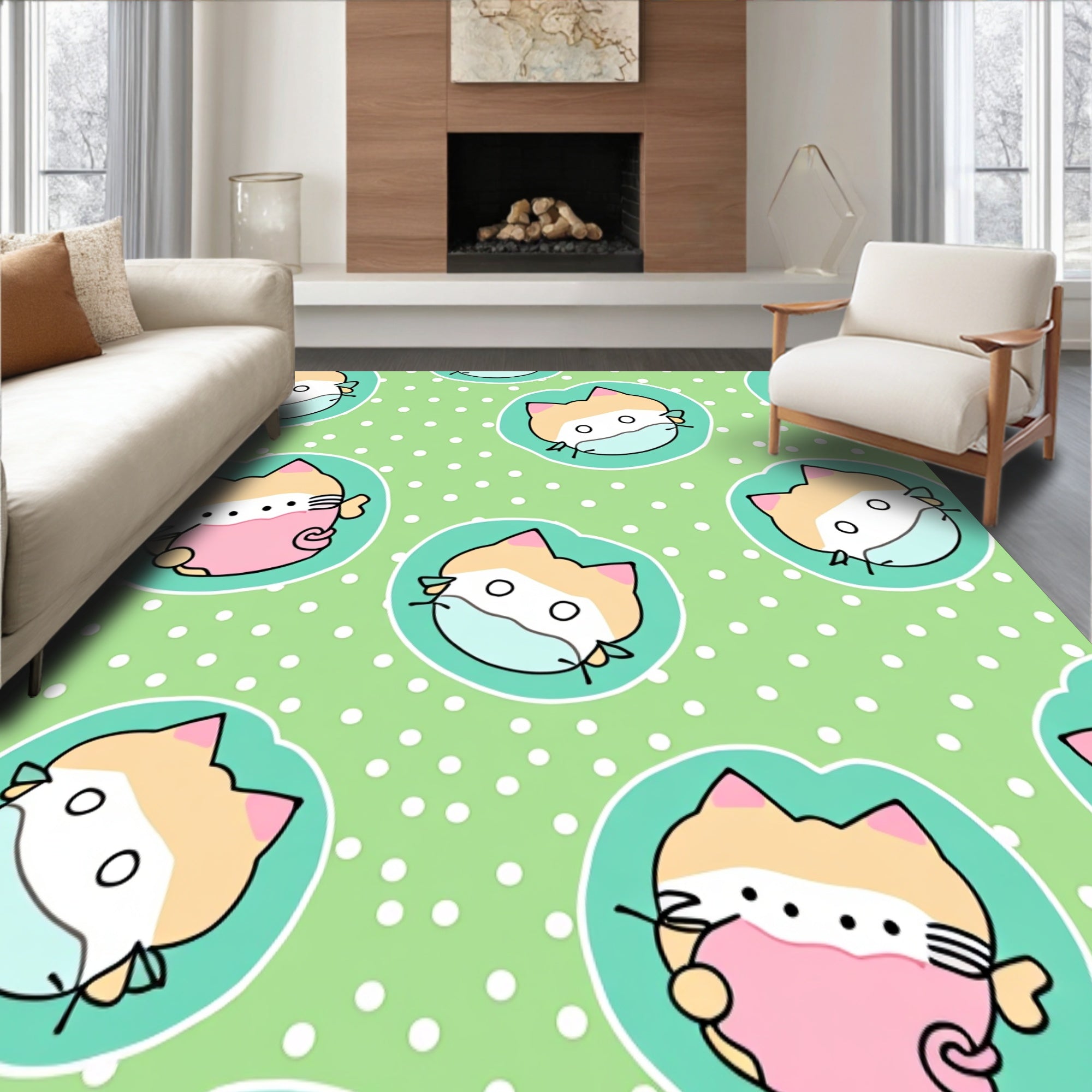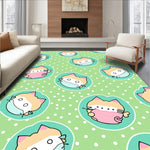 Ultra Soft Area Rug, Non Slip, Stain Resistant, Washable Area Rugs for Living Room, Bedroom, Cheerful Kitten Faces with Polka Dot Accents and Swirling Tail Motifs(Green) Overview: