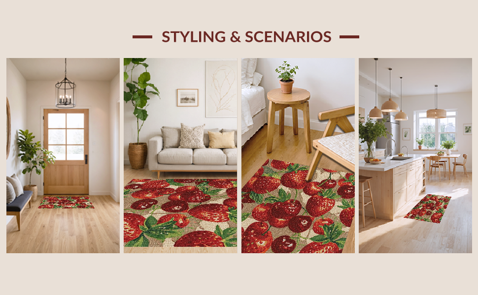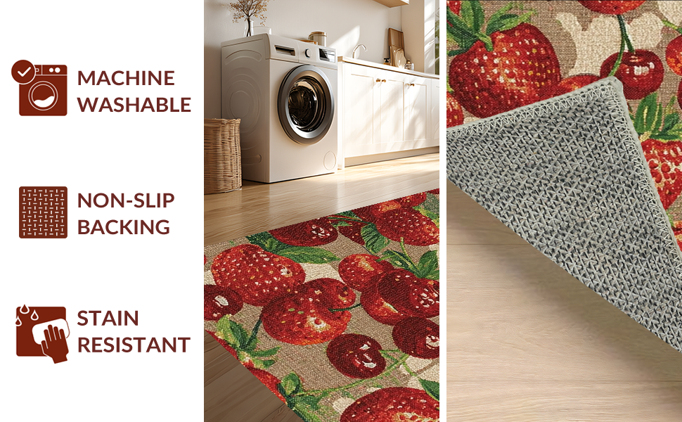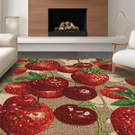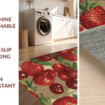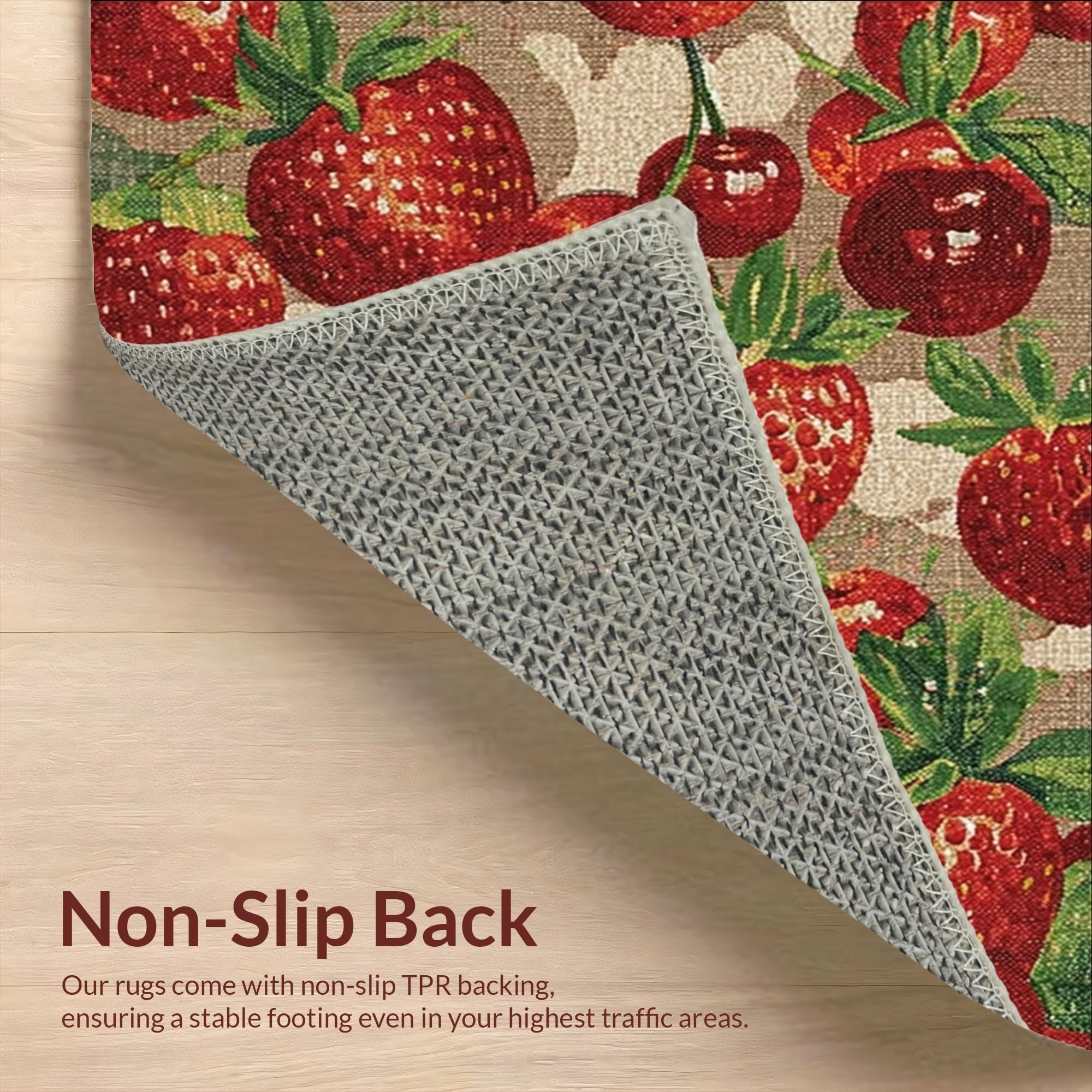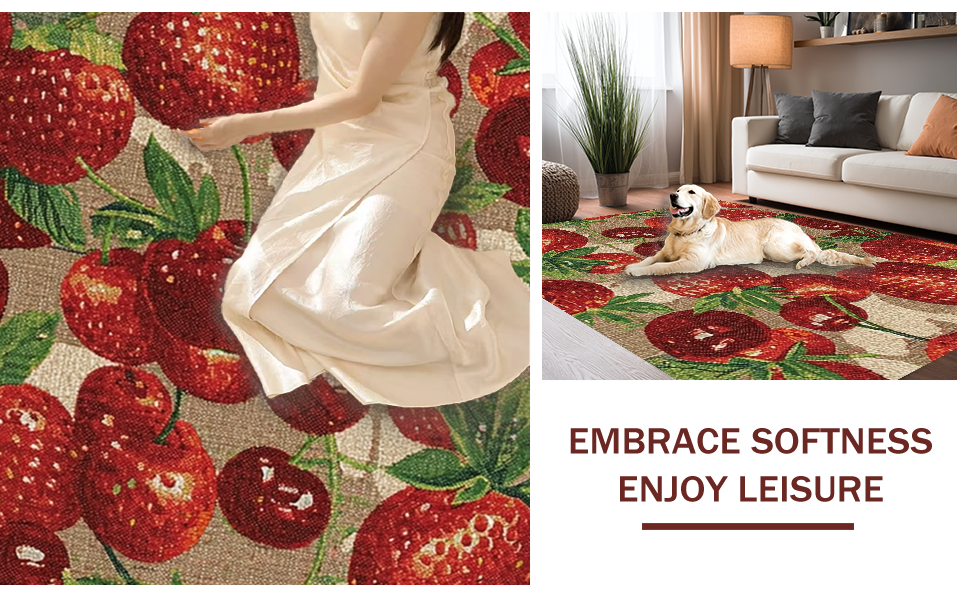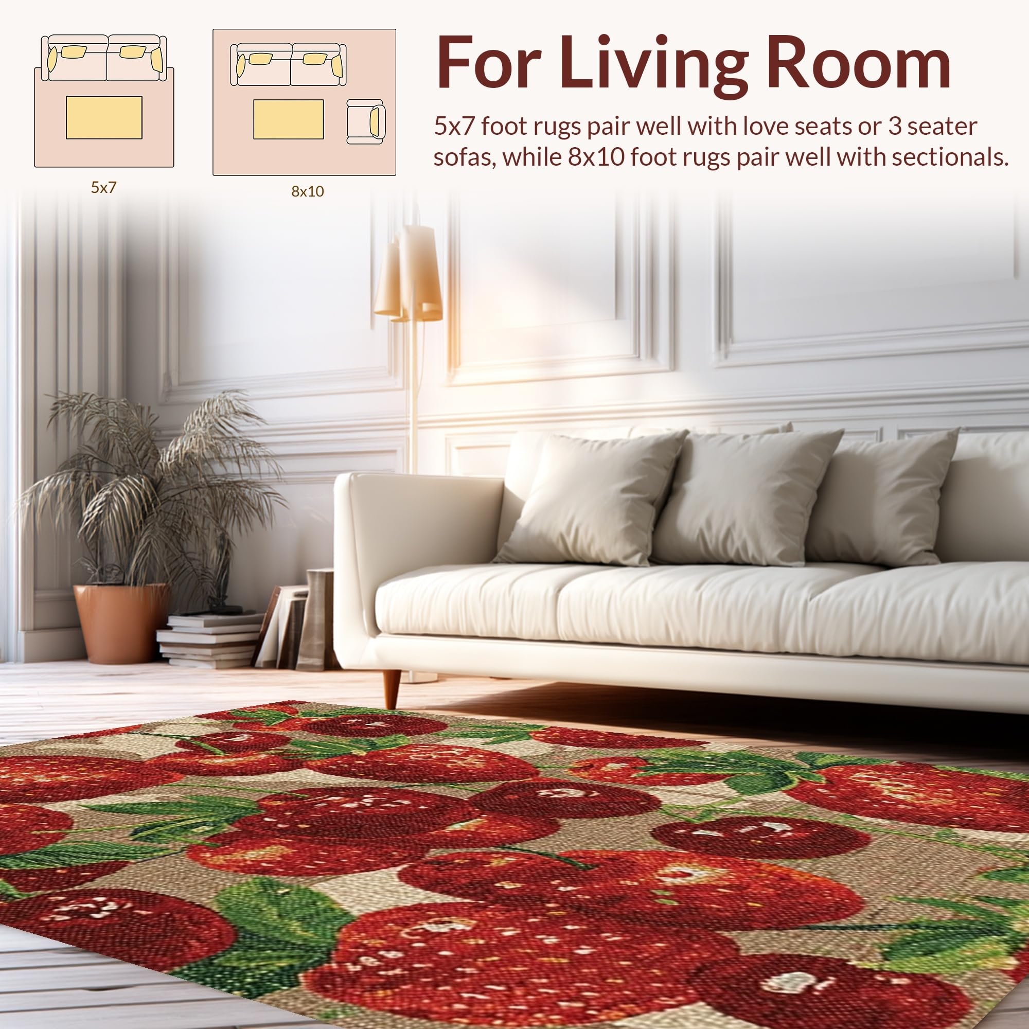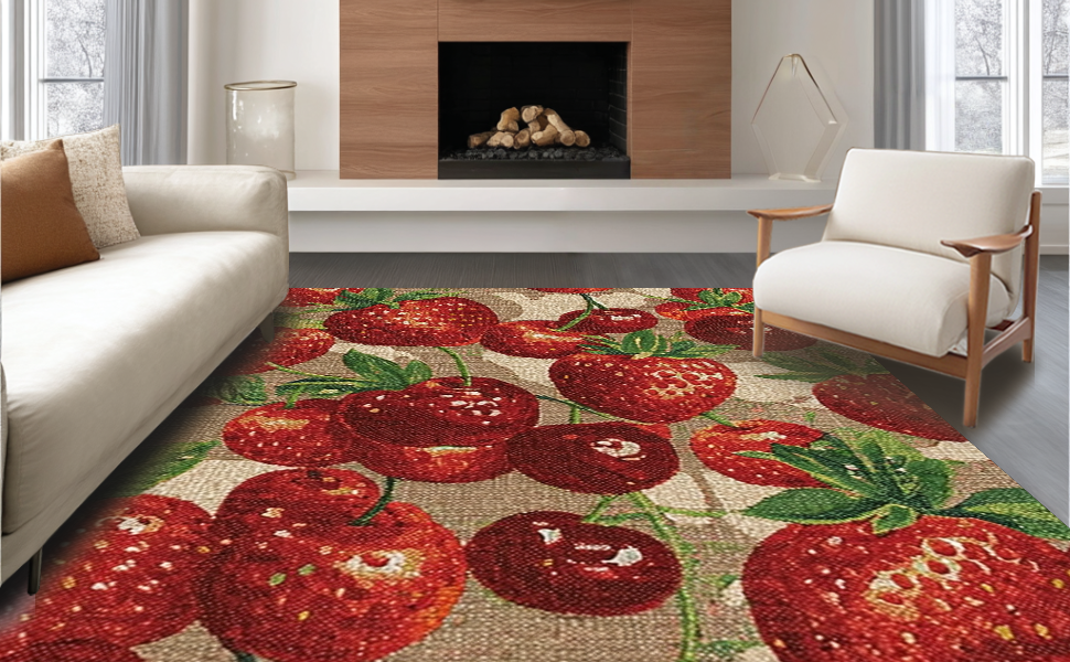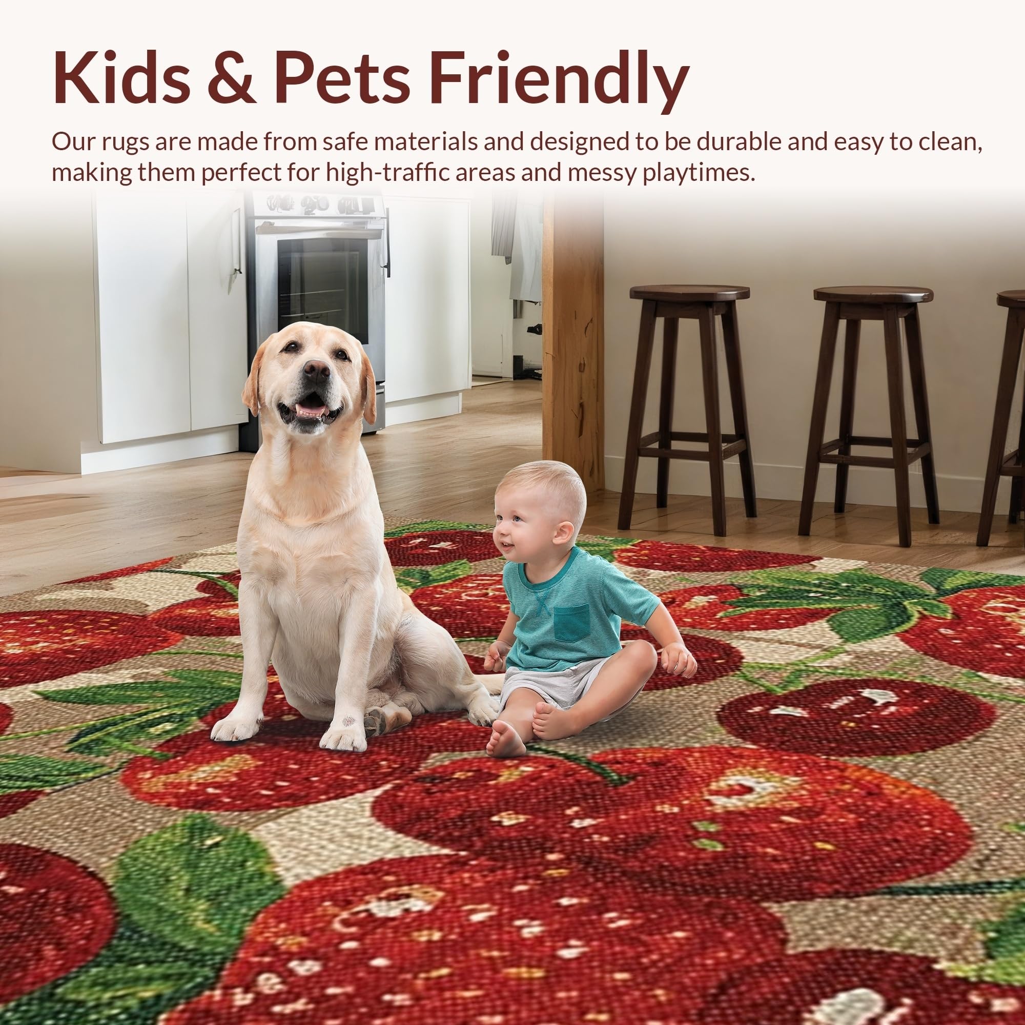 Ultra Soft Area Rug, Non Slip, Stain Resistant, Washable Area Rugs for Living Room, Bedroom, Cherry Bomb Bow Carpet with Strawberry Accents and Charming Pink Overlay(Red) Overview: