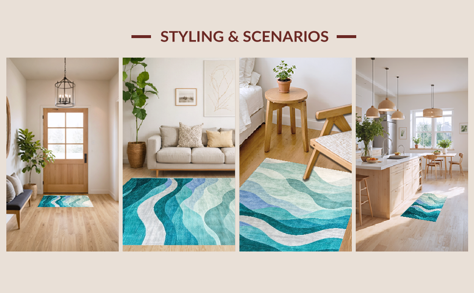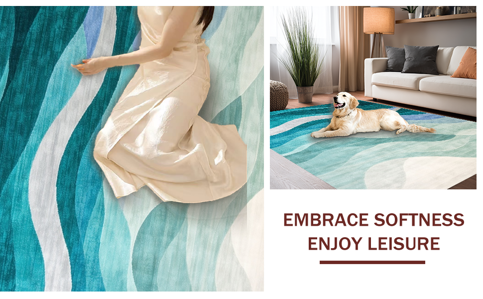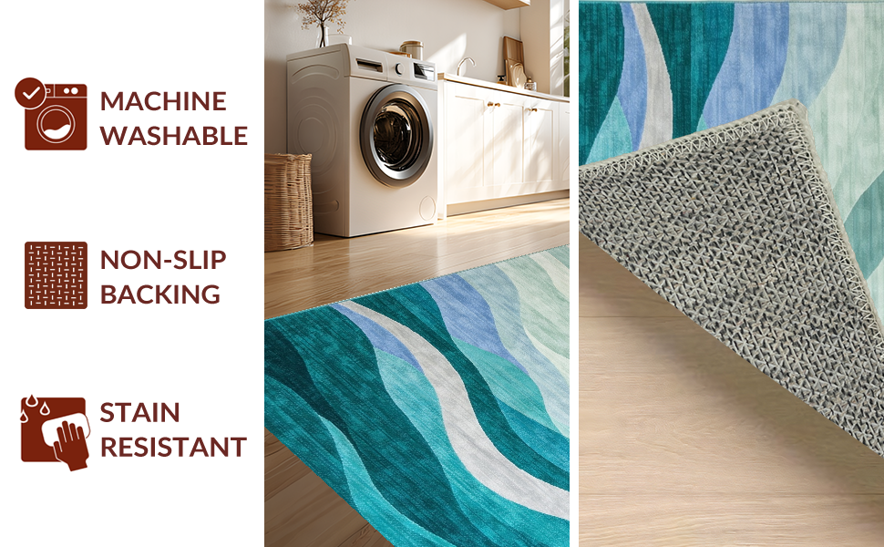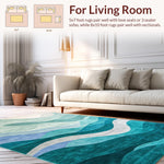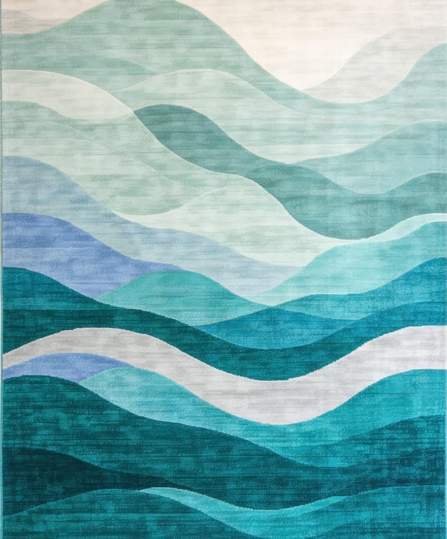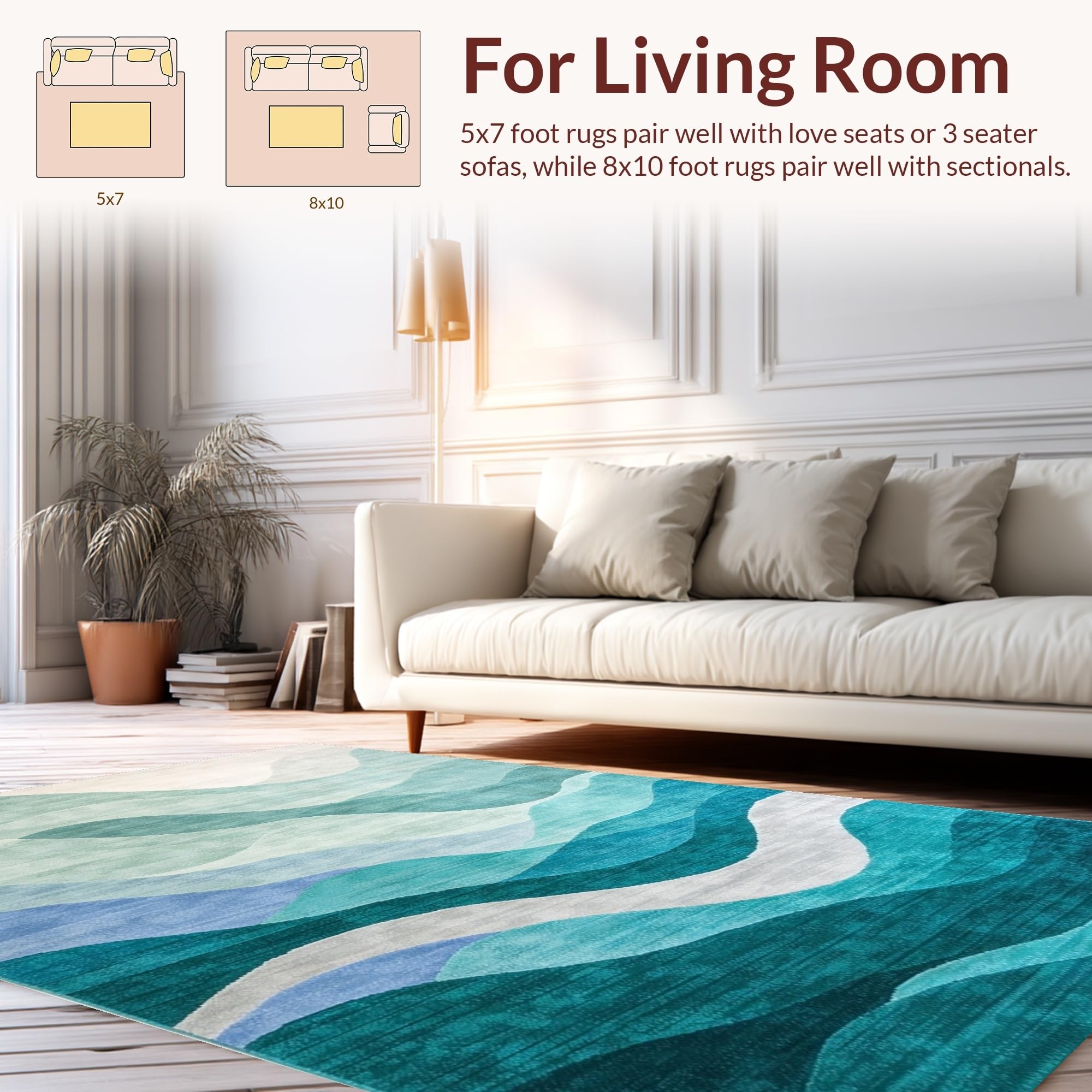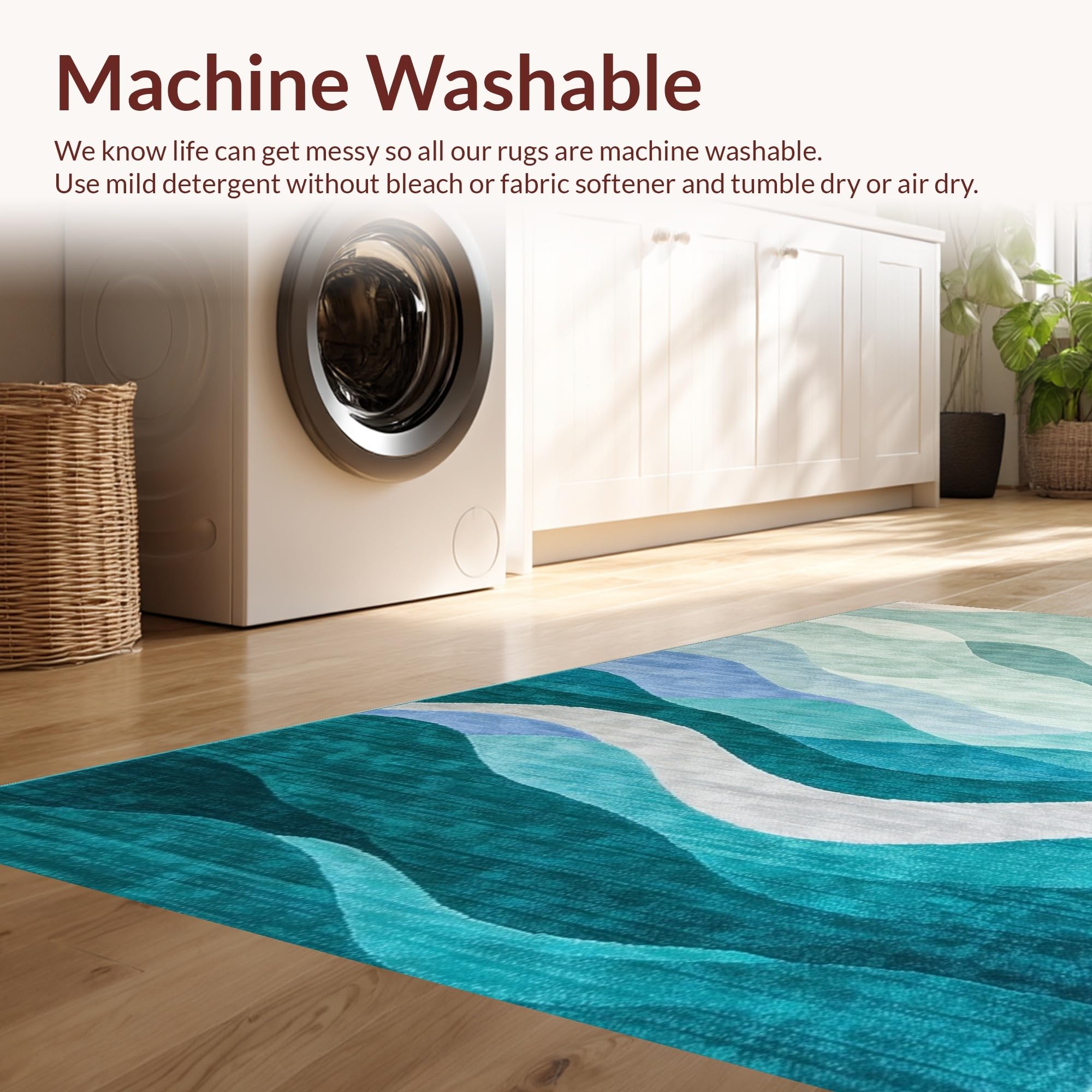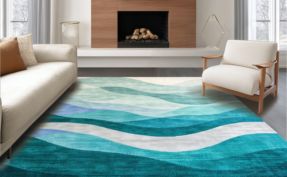 Ultra Soft Area Rug, Non Slip, Stain Resistant, Washable Area Rugs for Living Room, Bedroom, Chic Aqua Hued Textural Waves(Blue) Overview: