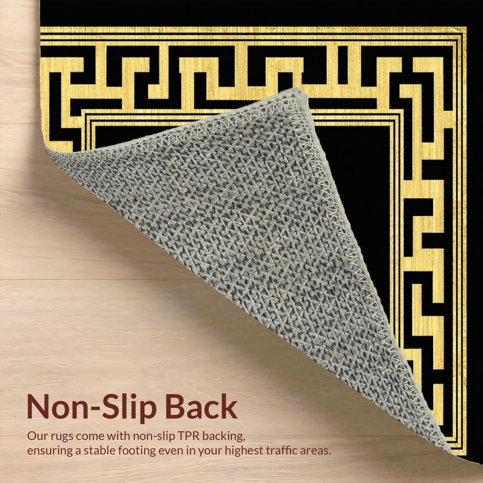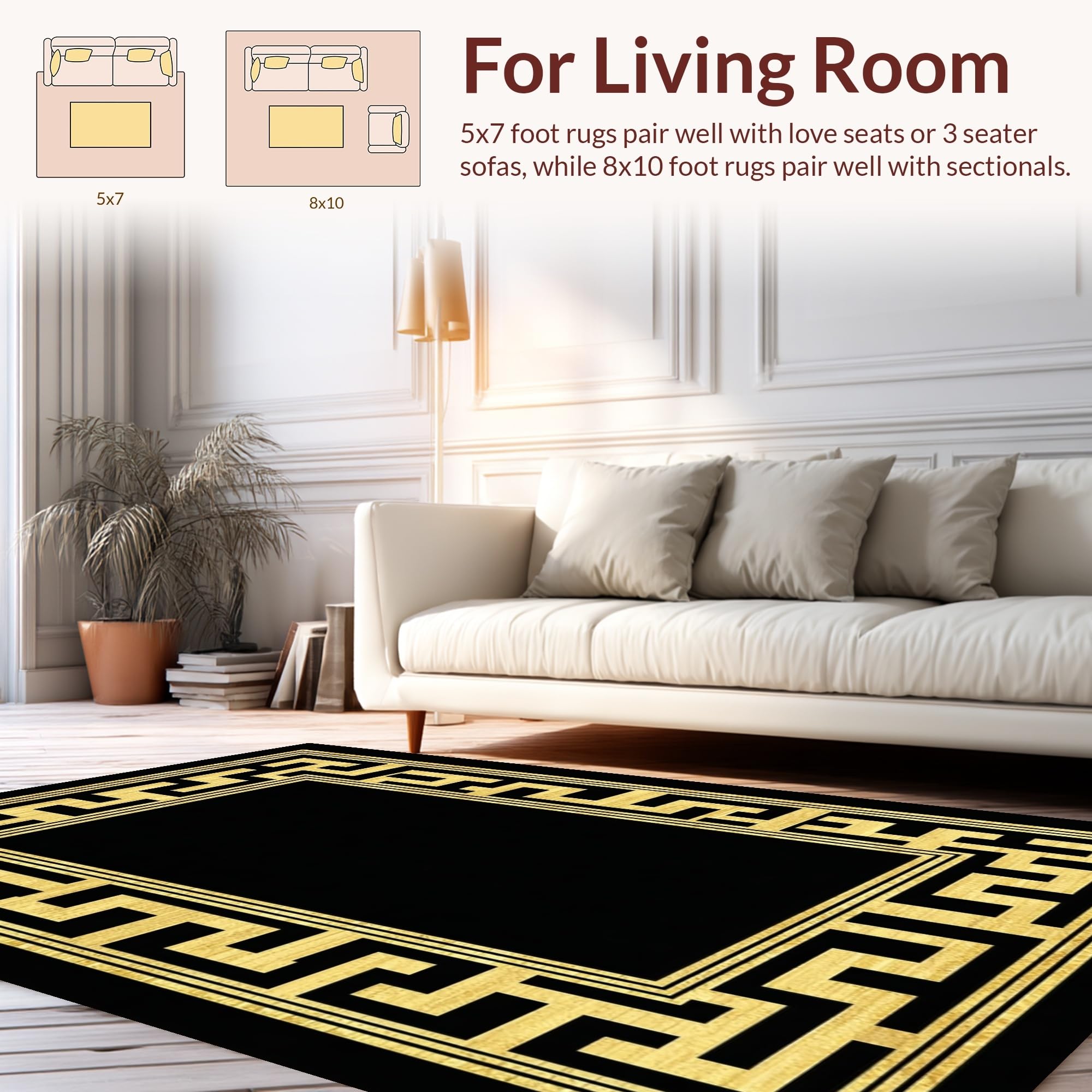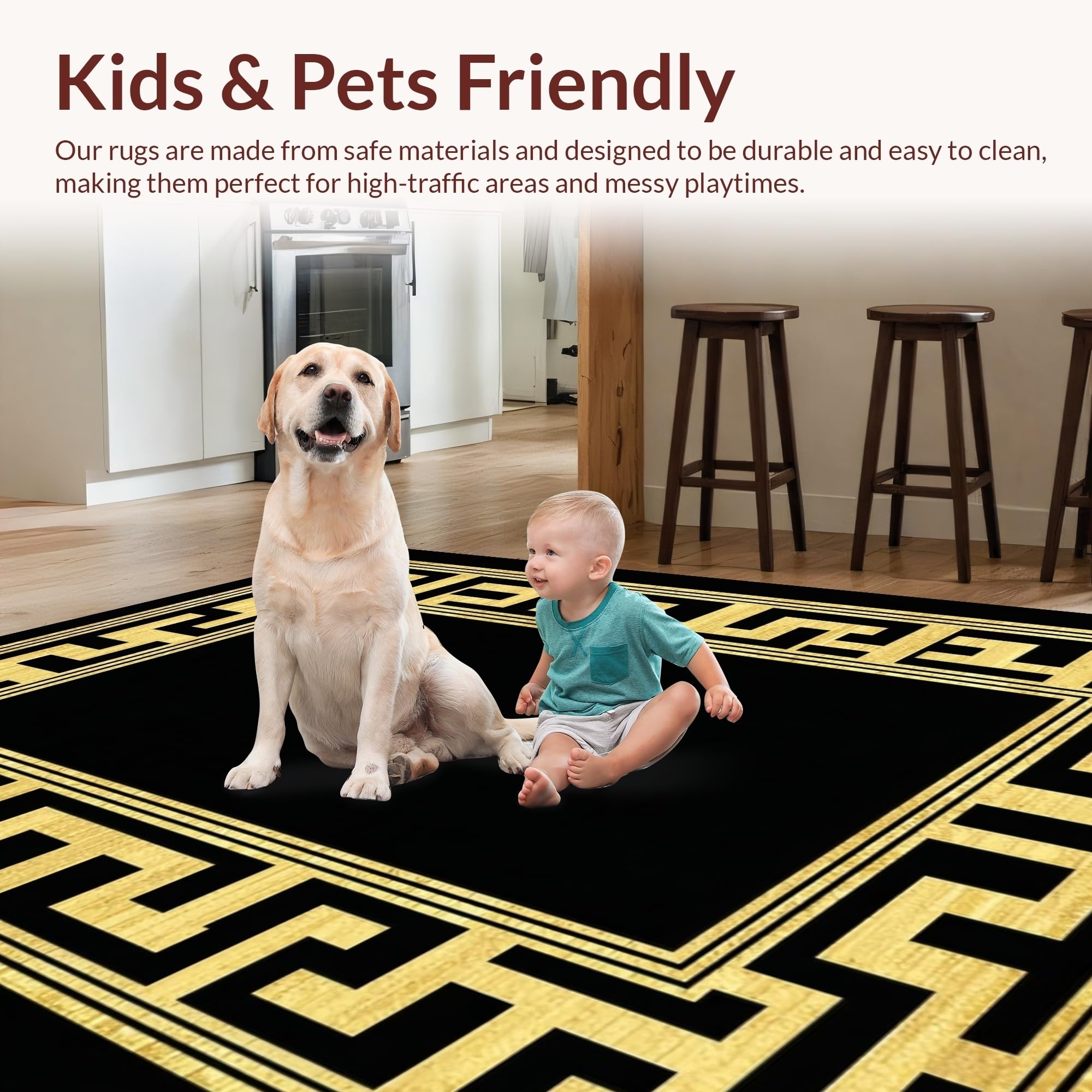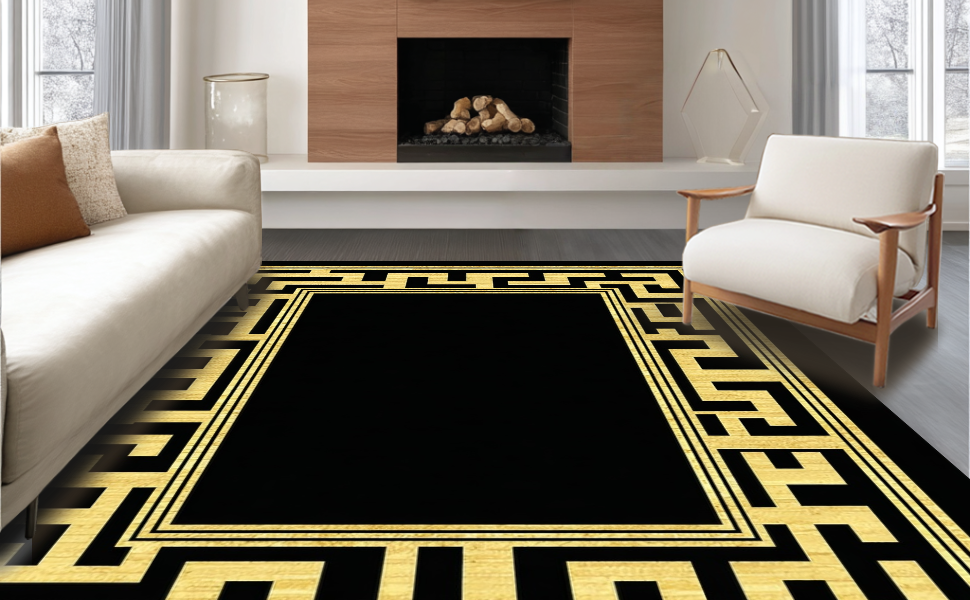 Ultra Soft Area Rug, Non Slip, Stain Resistant, Washable Area Rugs for Living Room, Bedroom, Chic Black Gold Geometric Flair(Black) Overview: