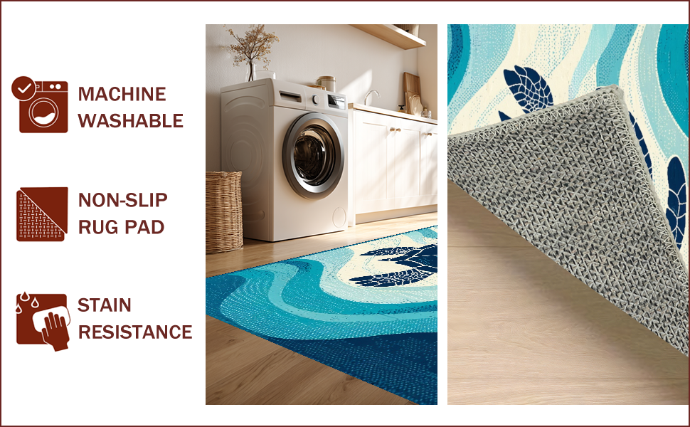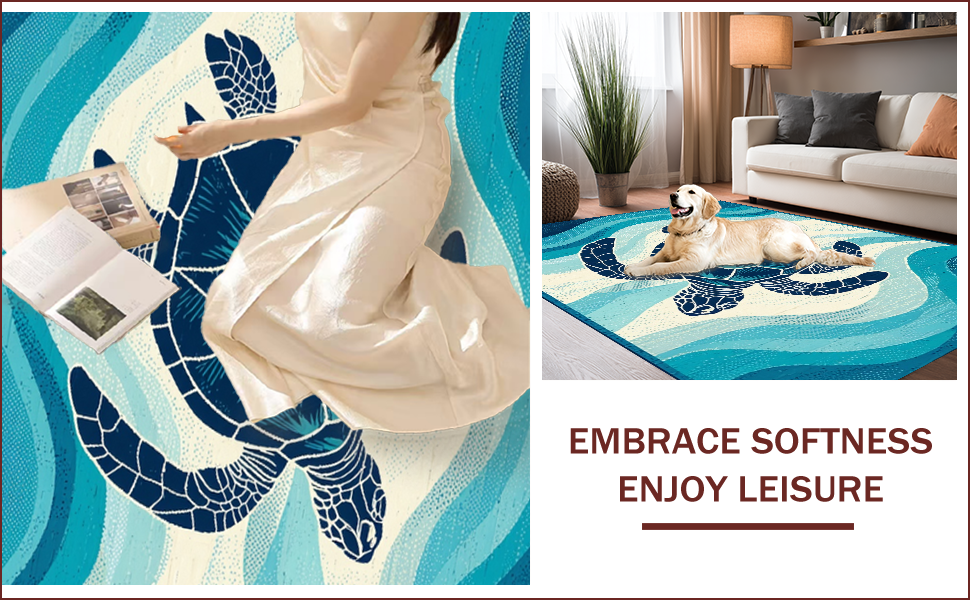 Ultra Soft Area Rug, Non Slip, Stain Resistant, Washable Area Rugs for Living Room, Bedroom, Chic Coastal Sea Turtle Motif(Blue) Overview: