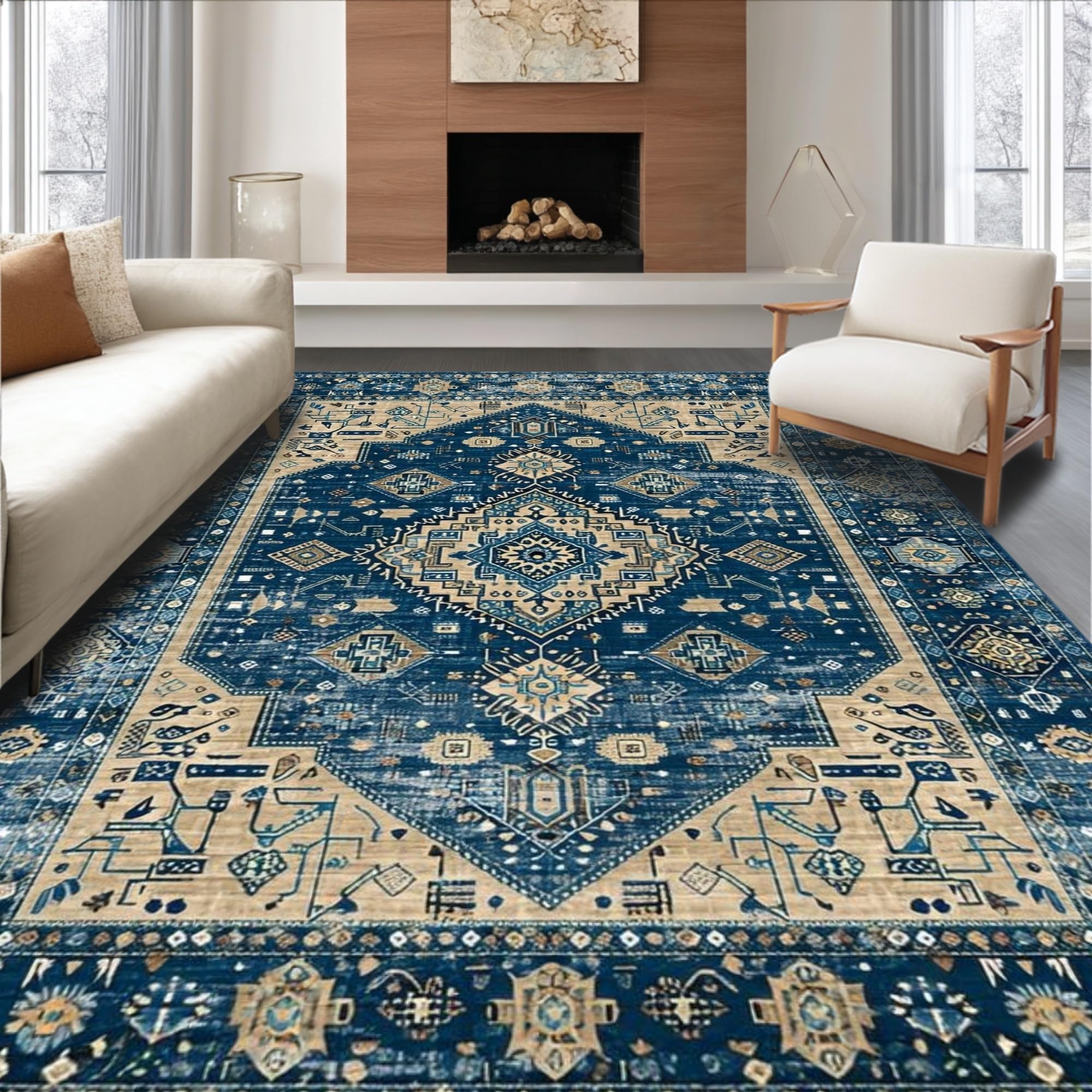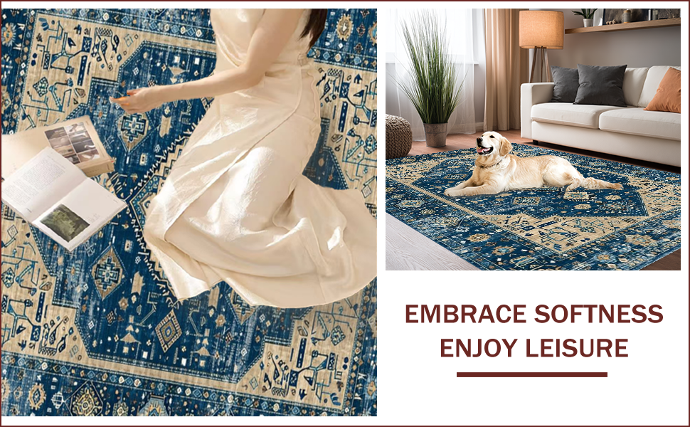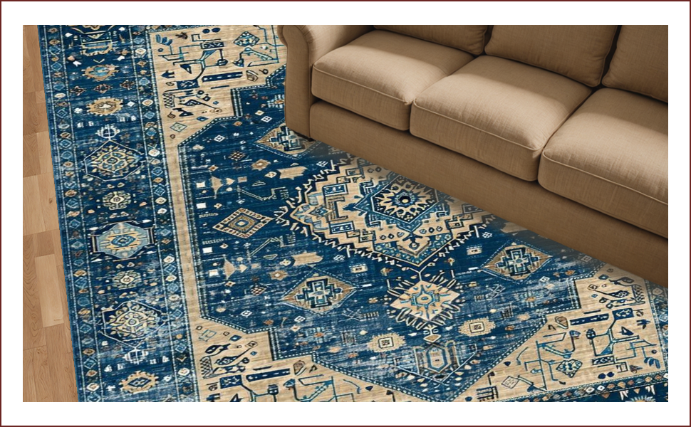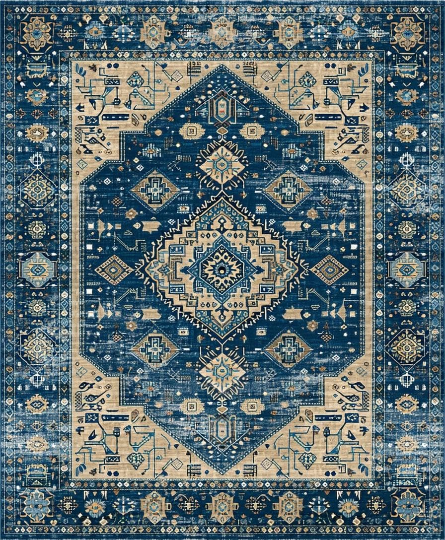 Ultra Soft Area Rug, Non Slip, Stain Resistant, Washable Area Rugs for Living Room, Bedroom, Chic Distressed Geometric Aesthetic(Blue) Overview: