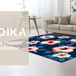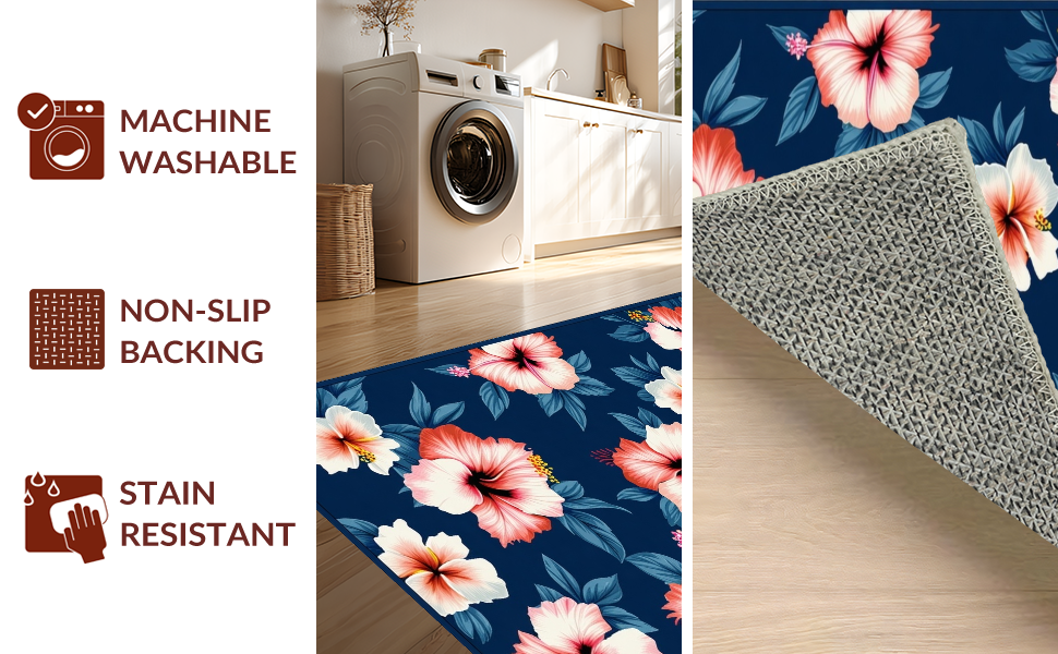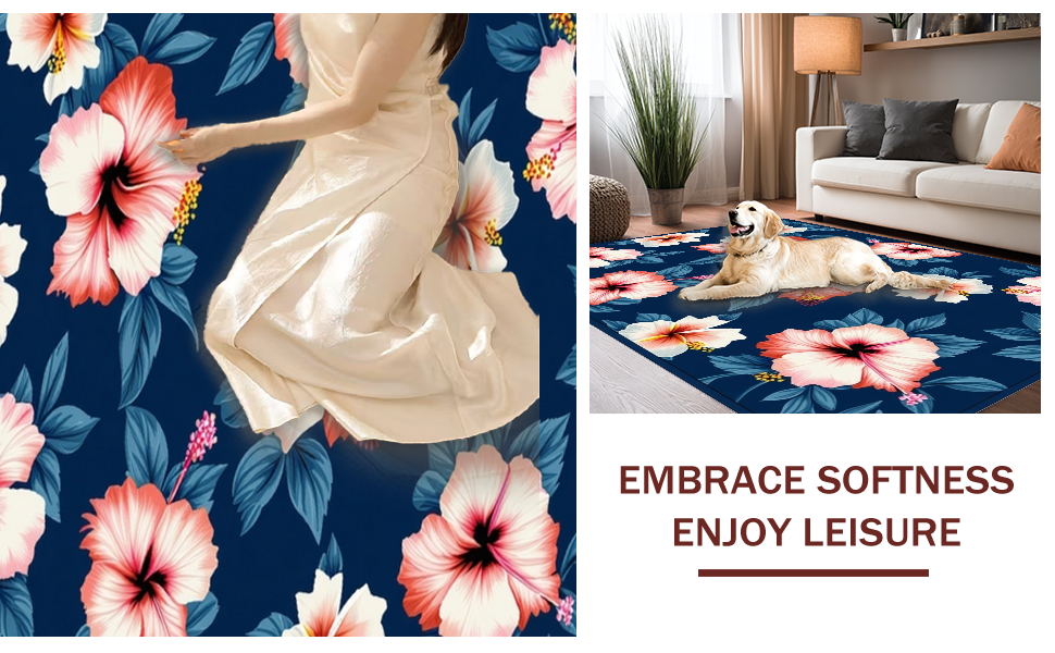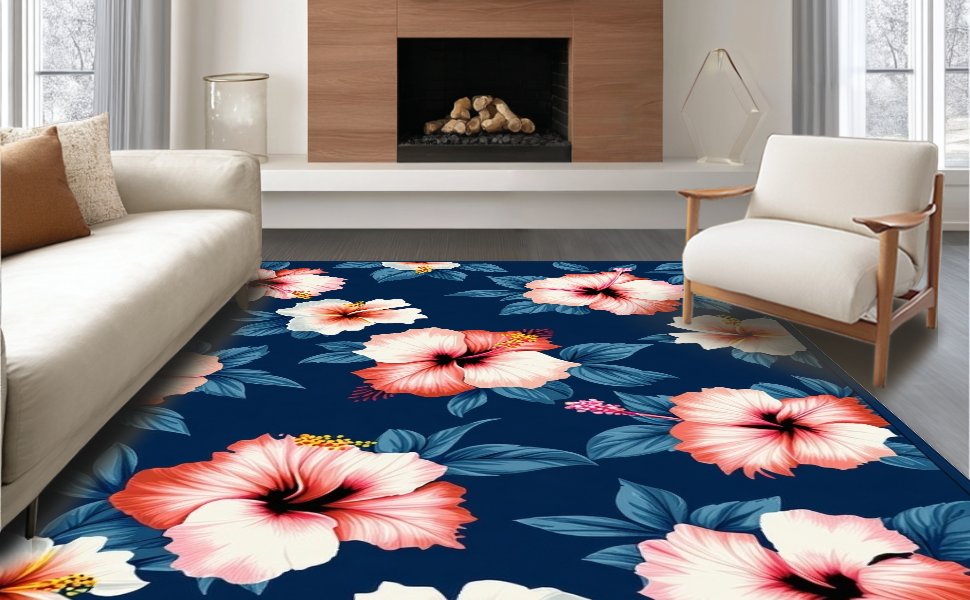 Ultra Soft Area Rug, Non Slip, Stain Resistant, Washable Area Rugs for Living Room, Bedroom, Chic Hibiscus Patterned Design(Blue) Overview: