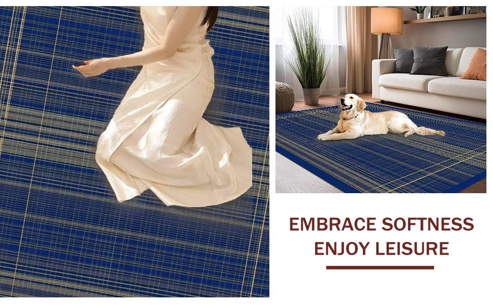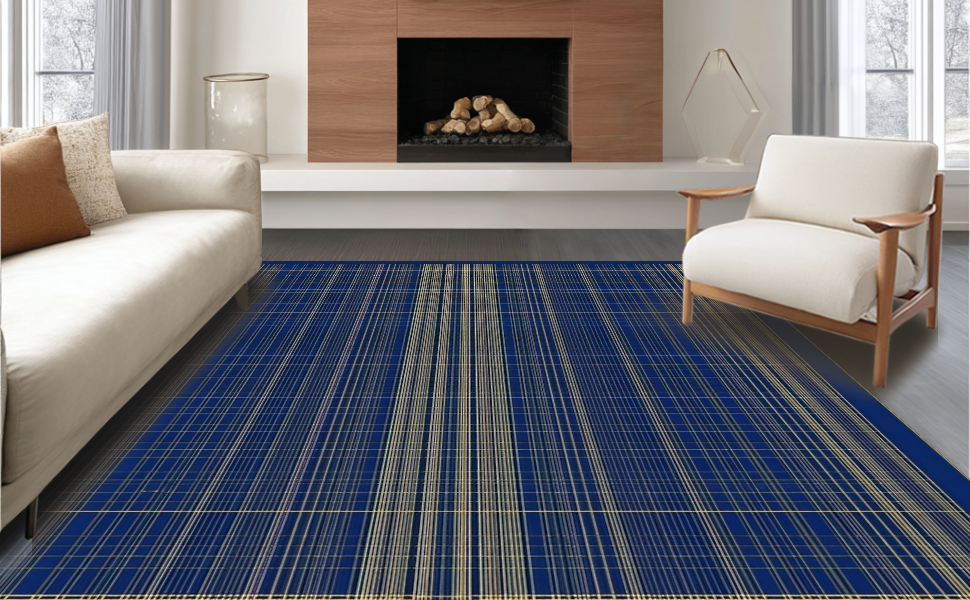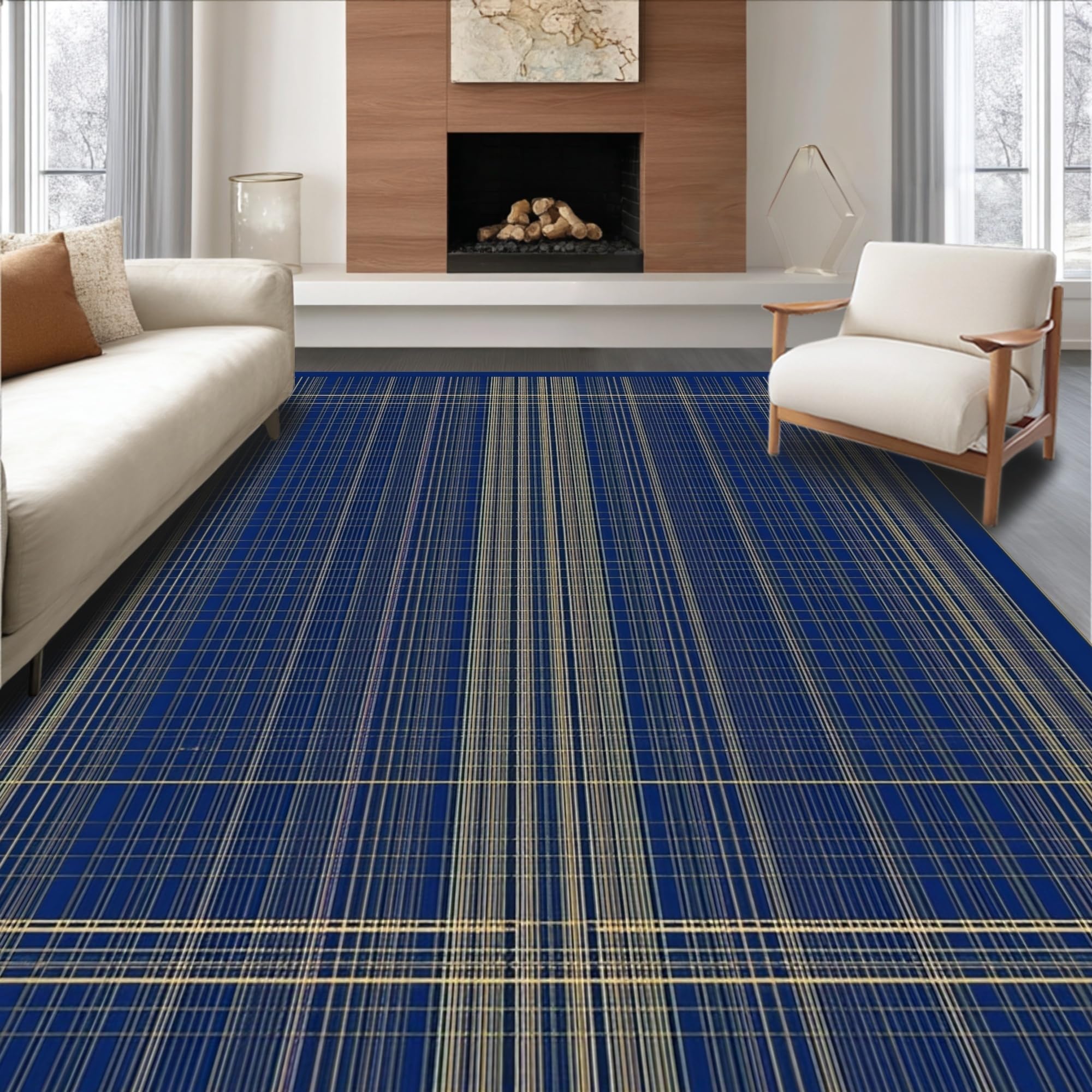 Ultra Soft Area Rug, Non Slip, Stain Resistant, Washable Area Rugs for Living Room, Bedroom, Chic Minimalist Gold Border Geometric Style(Blue) Overview: