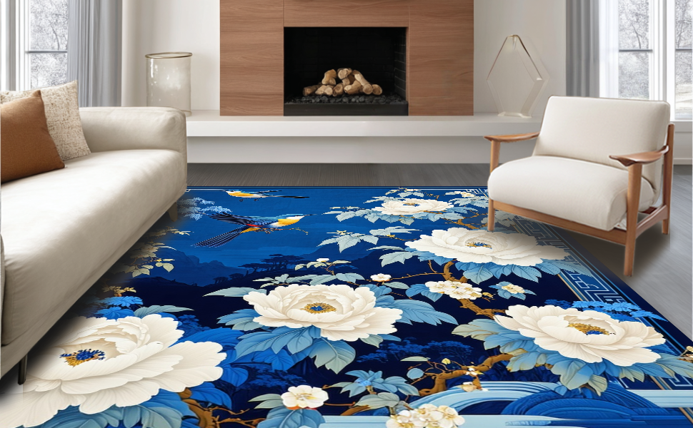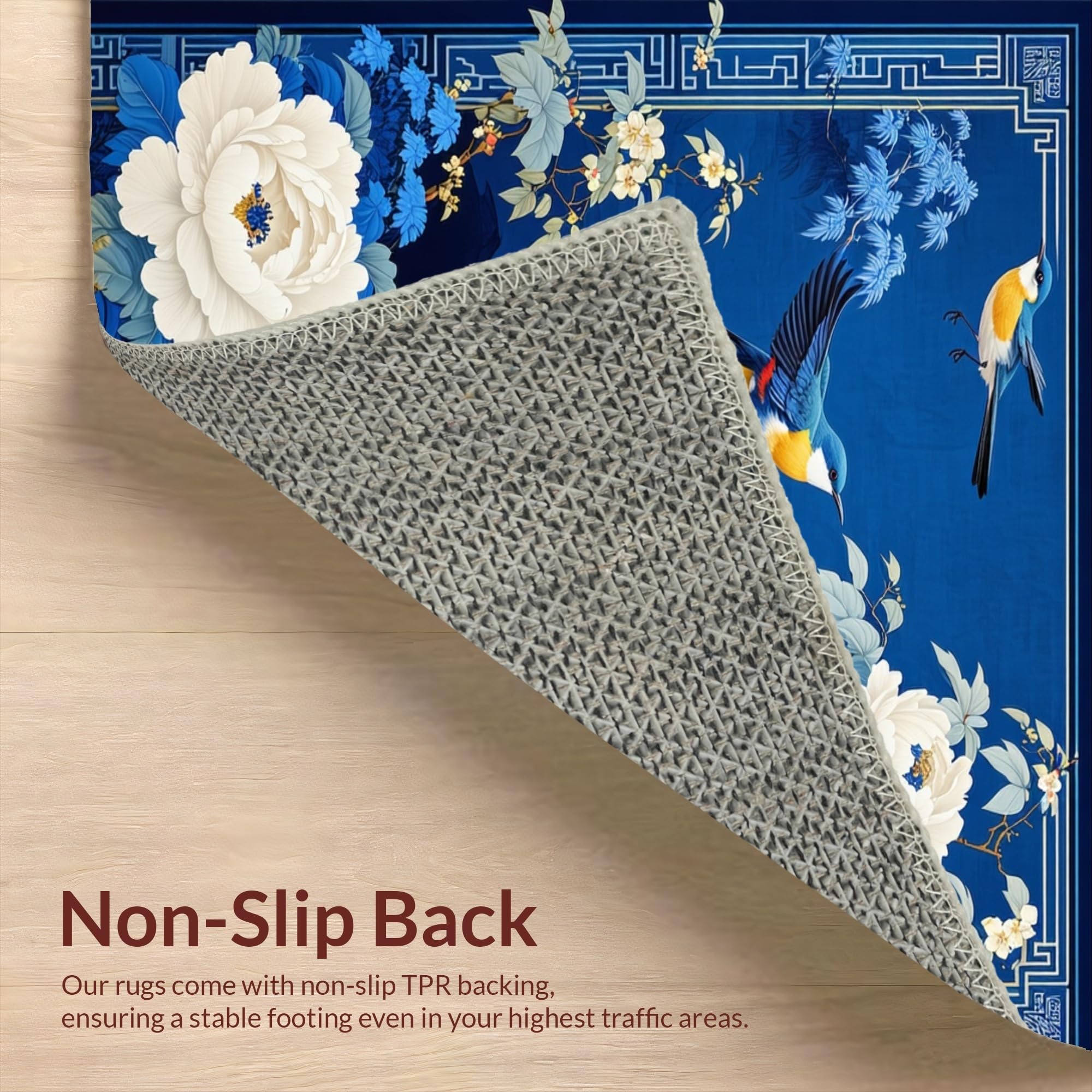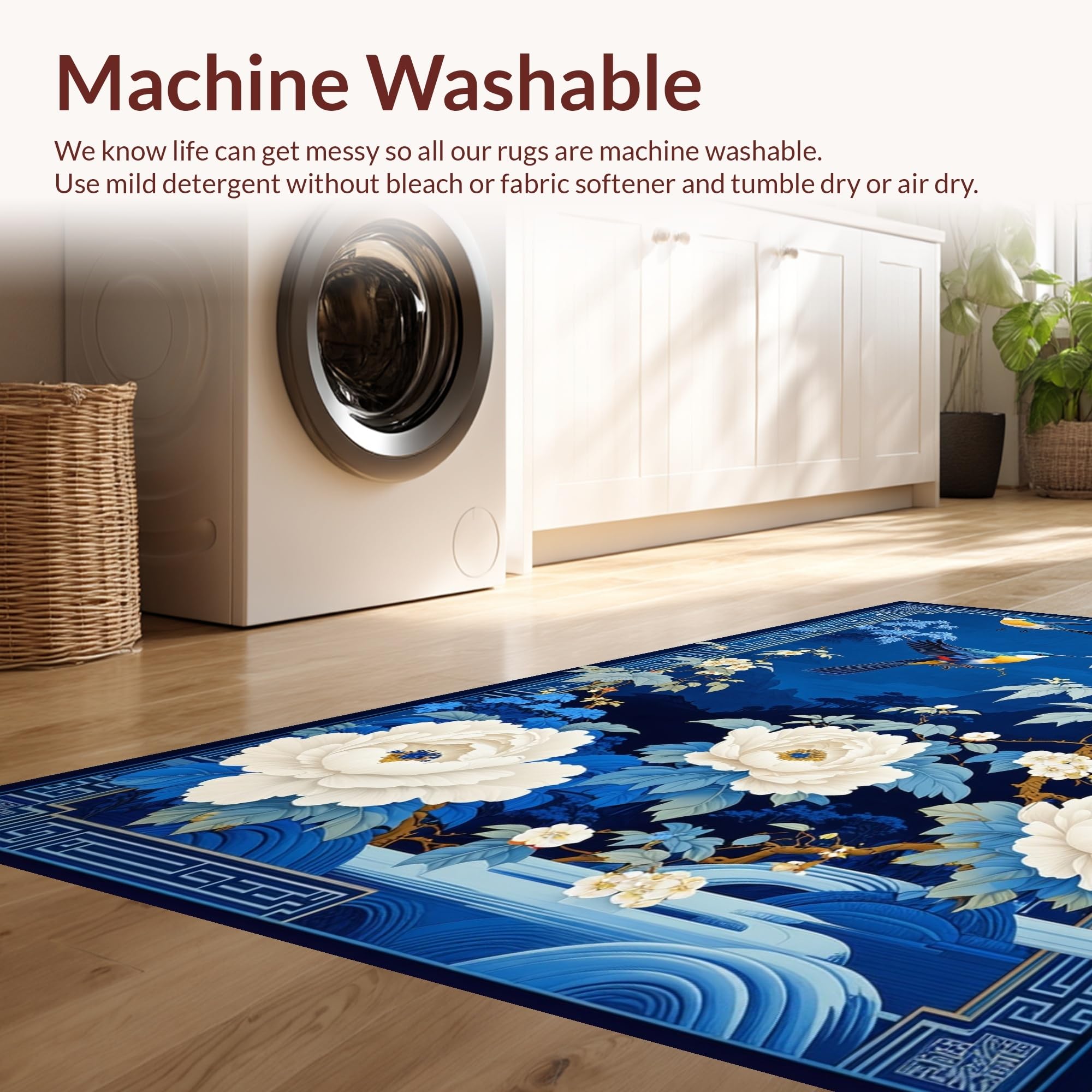Ultra Soft Area Rug, Non Slip, Stain Resistant, Washable Area Rugs for Living Room, Bedroom, Chinoiserie Blue Floral Elegance(Blue) Overview:
