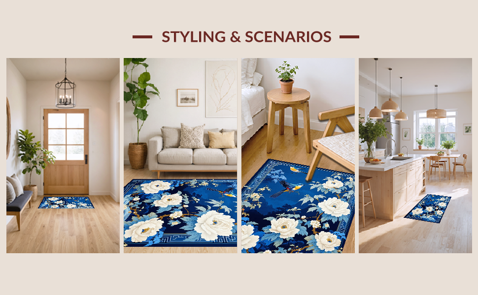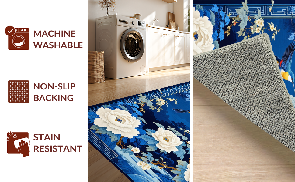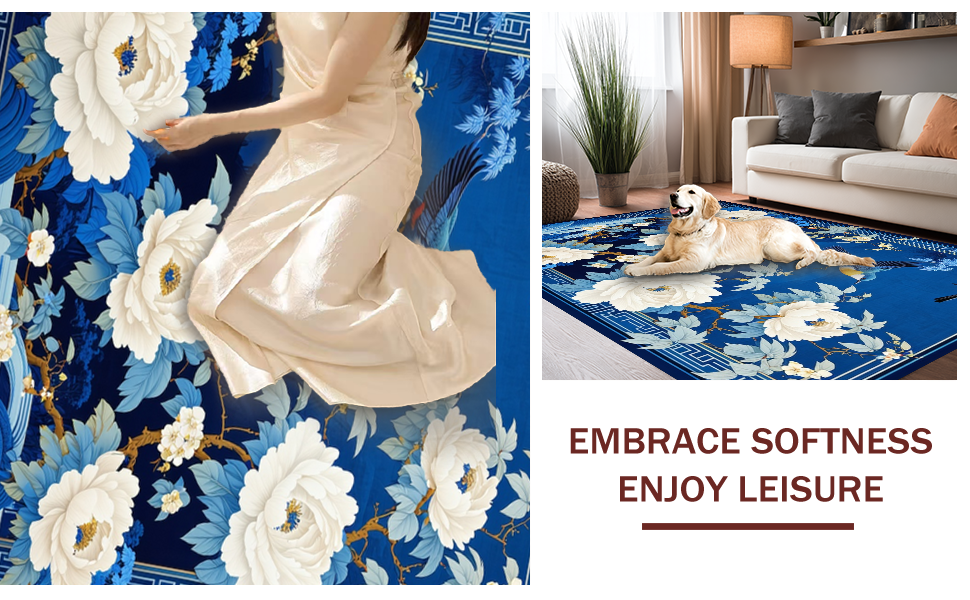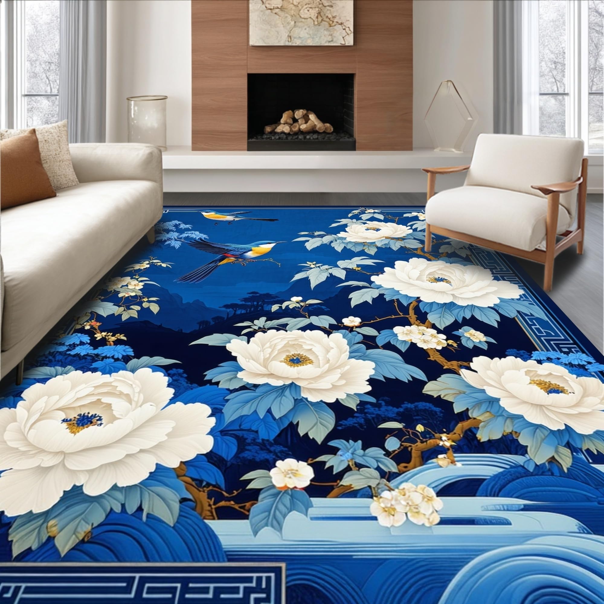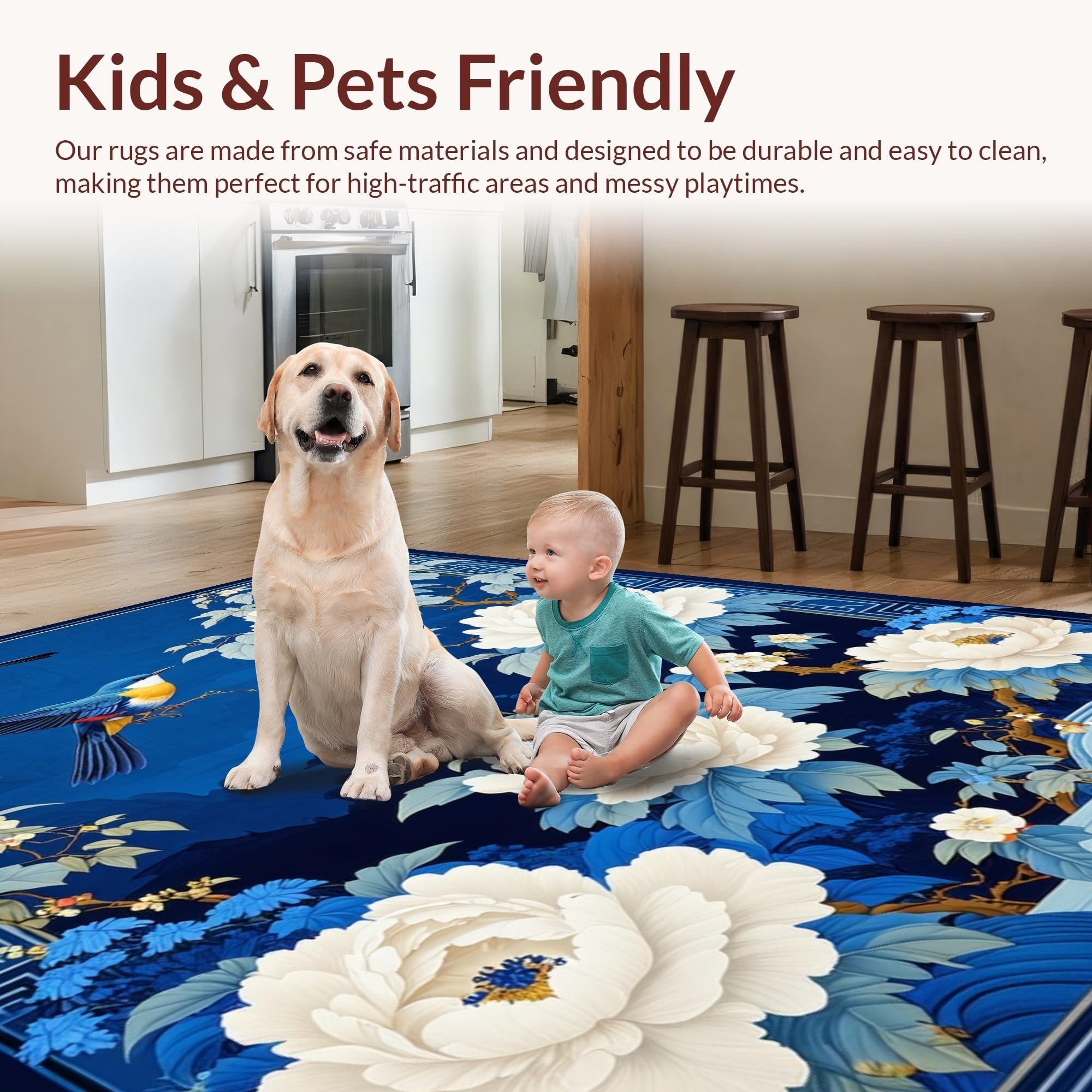 Ultra Soft Area Rug, Non Slip, Stain Resistant, Washable Area Rugs for Living Room, Bedroom, Chinoiserie Blue Floral Elegance(Blue) Overview: