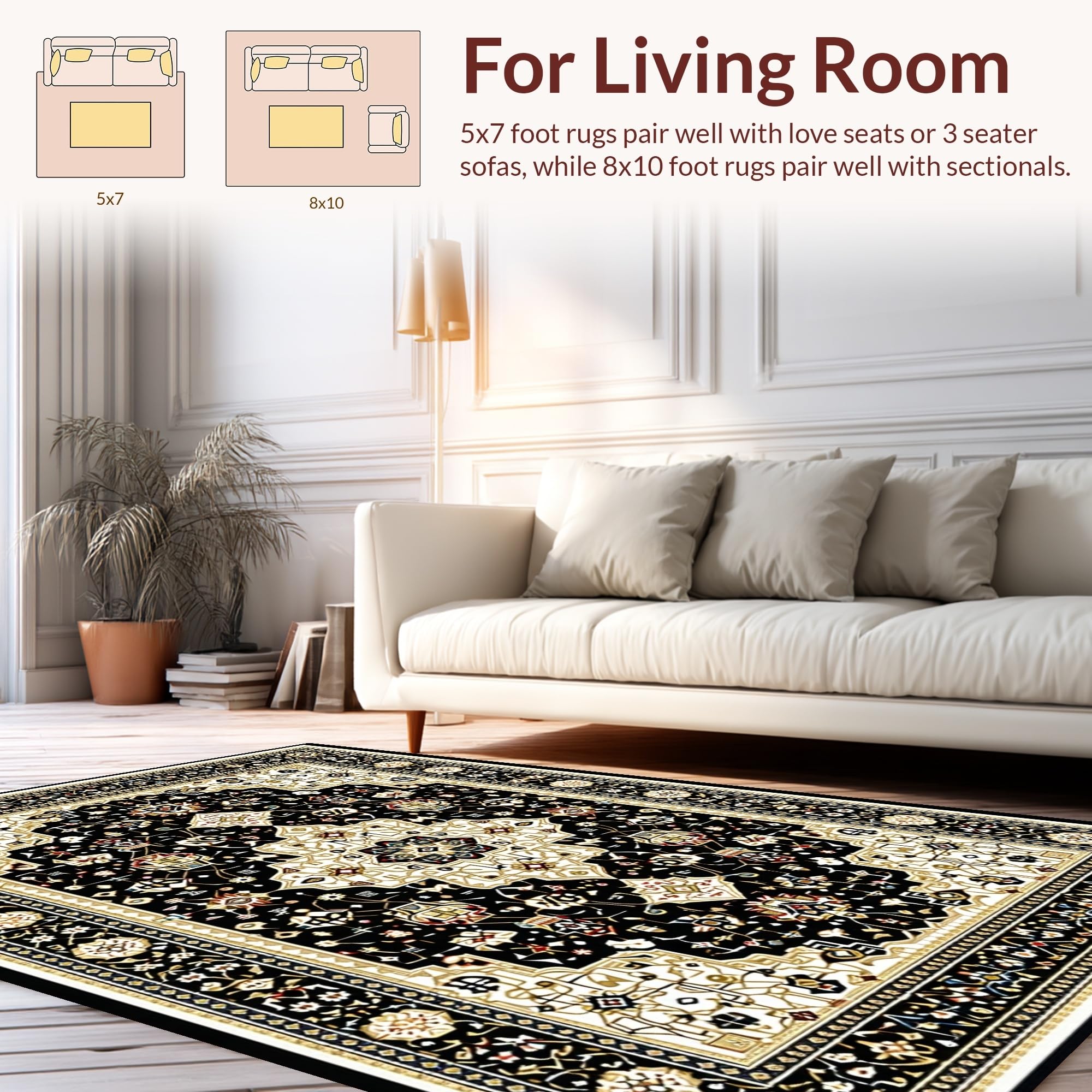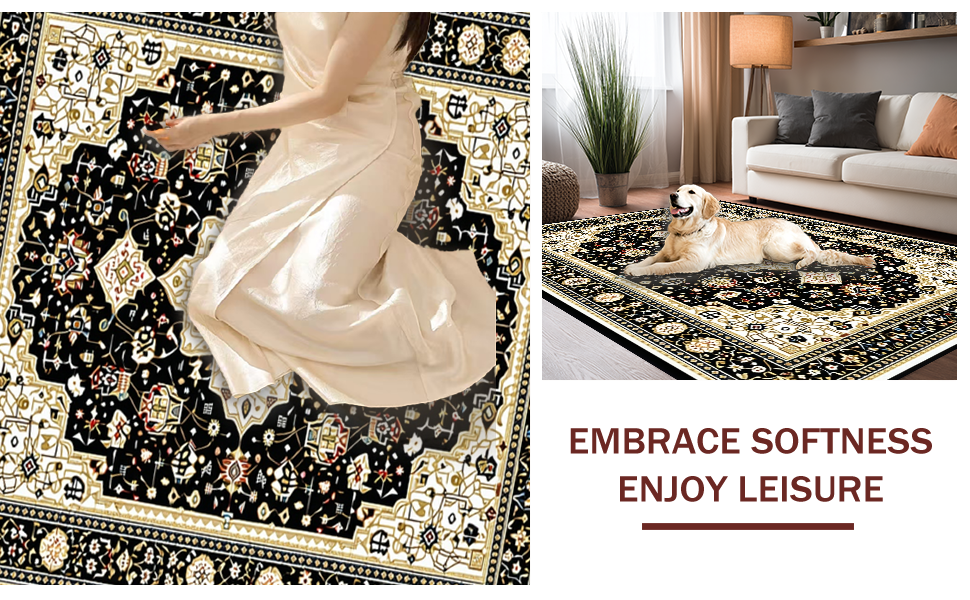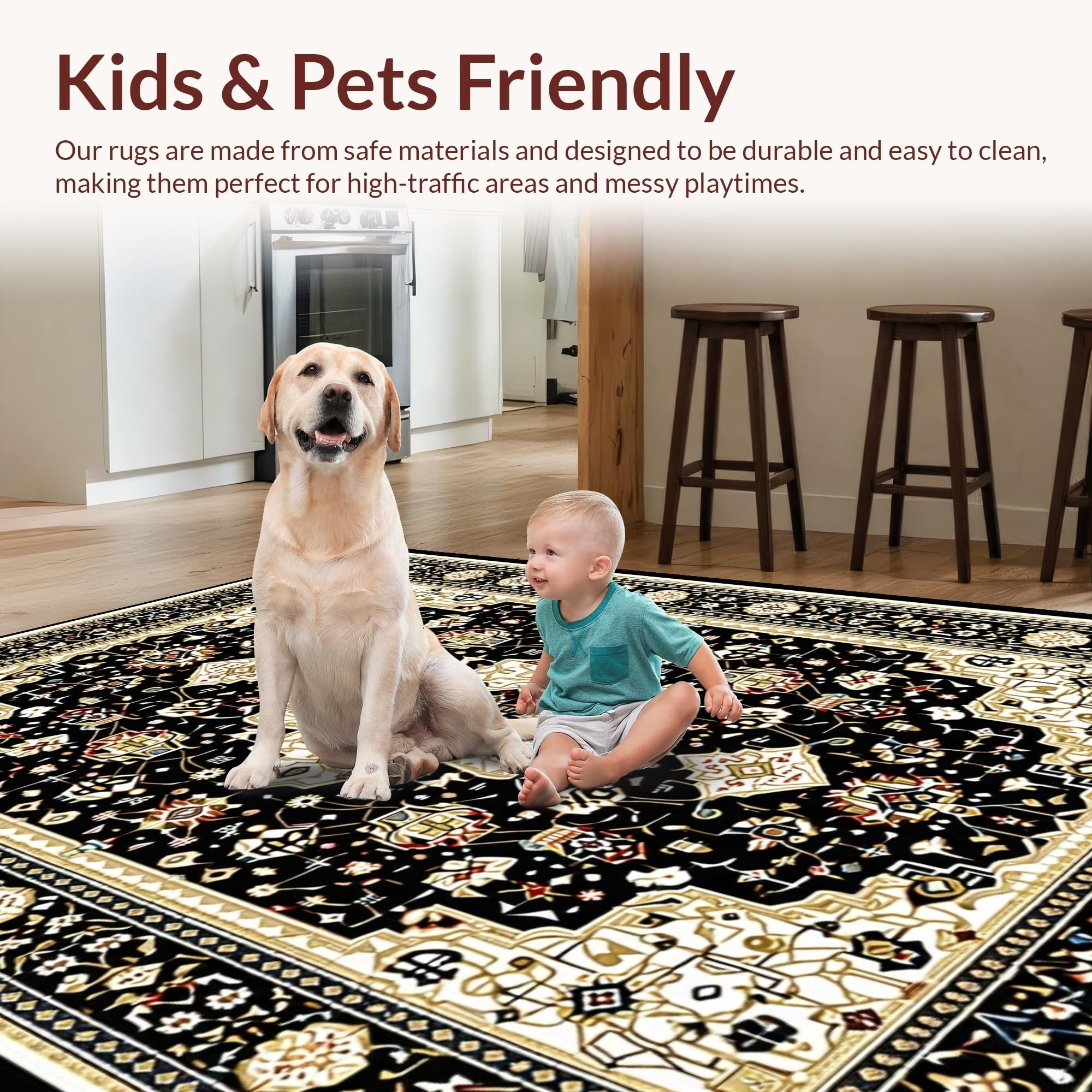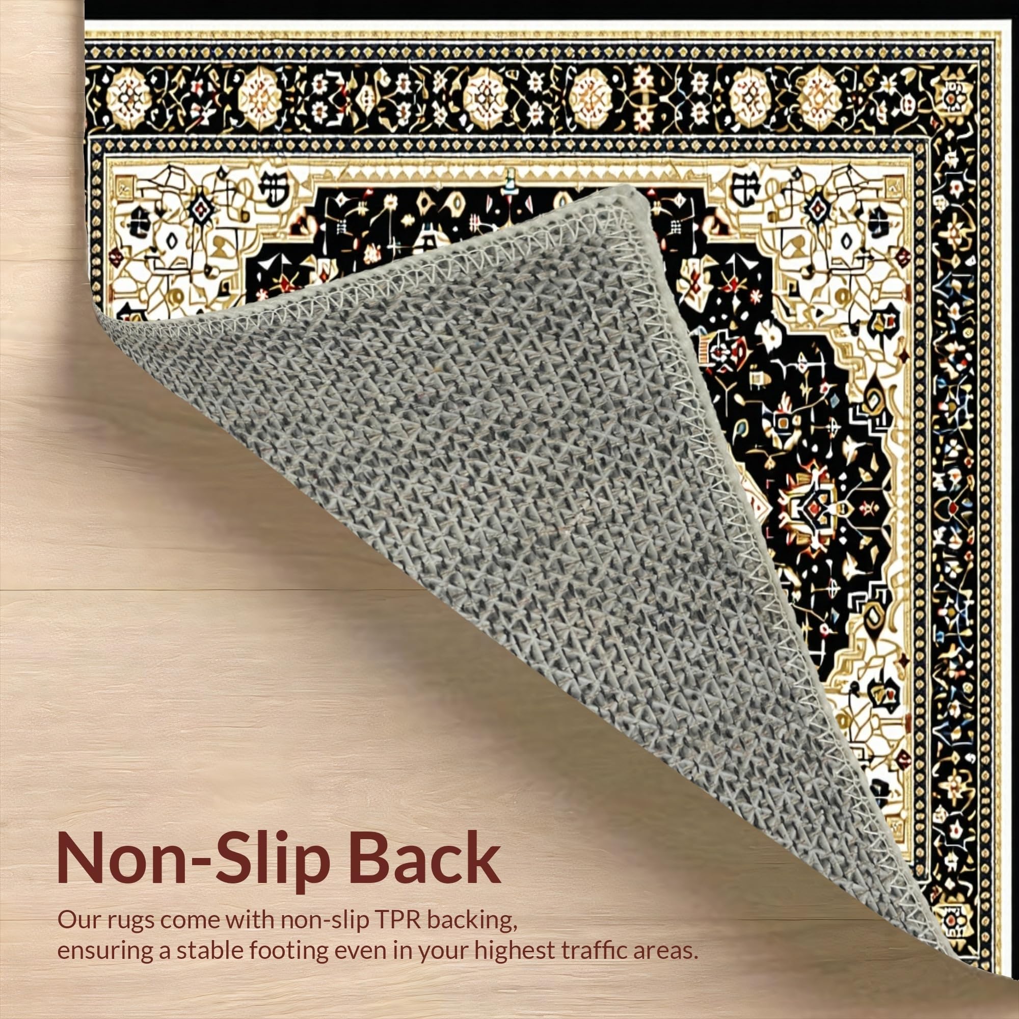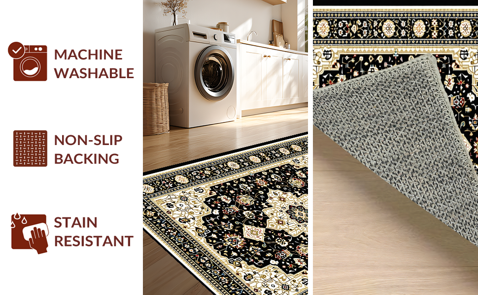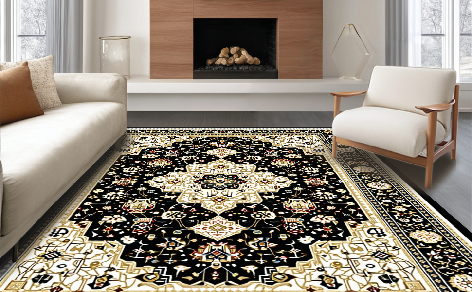 Ultra Soft Area Rug, Non Slip, Stain Resistant, Washable Area Rugs for Living Room, Bedroom, Classic Black Beige Damask Style(Black) Overview: