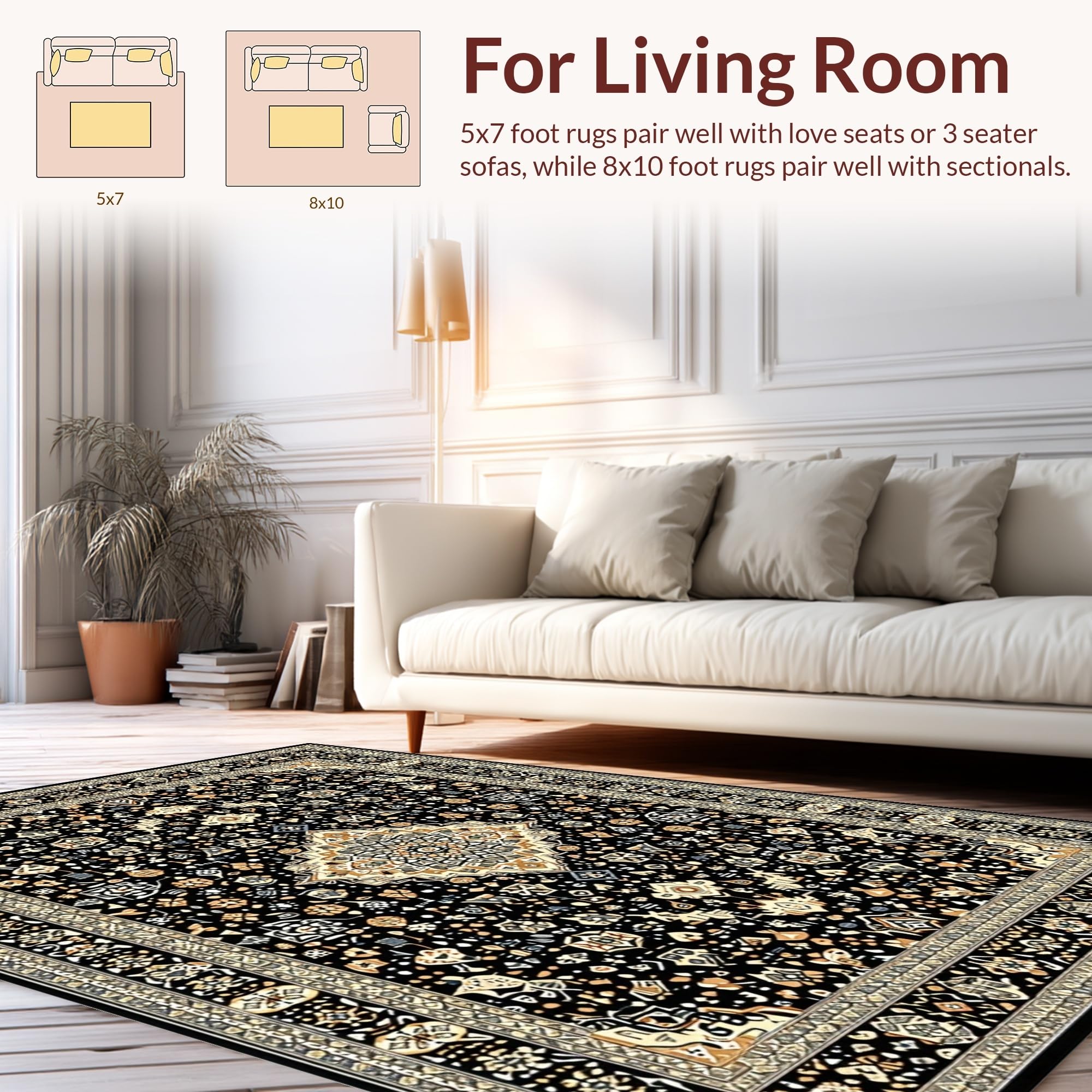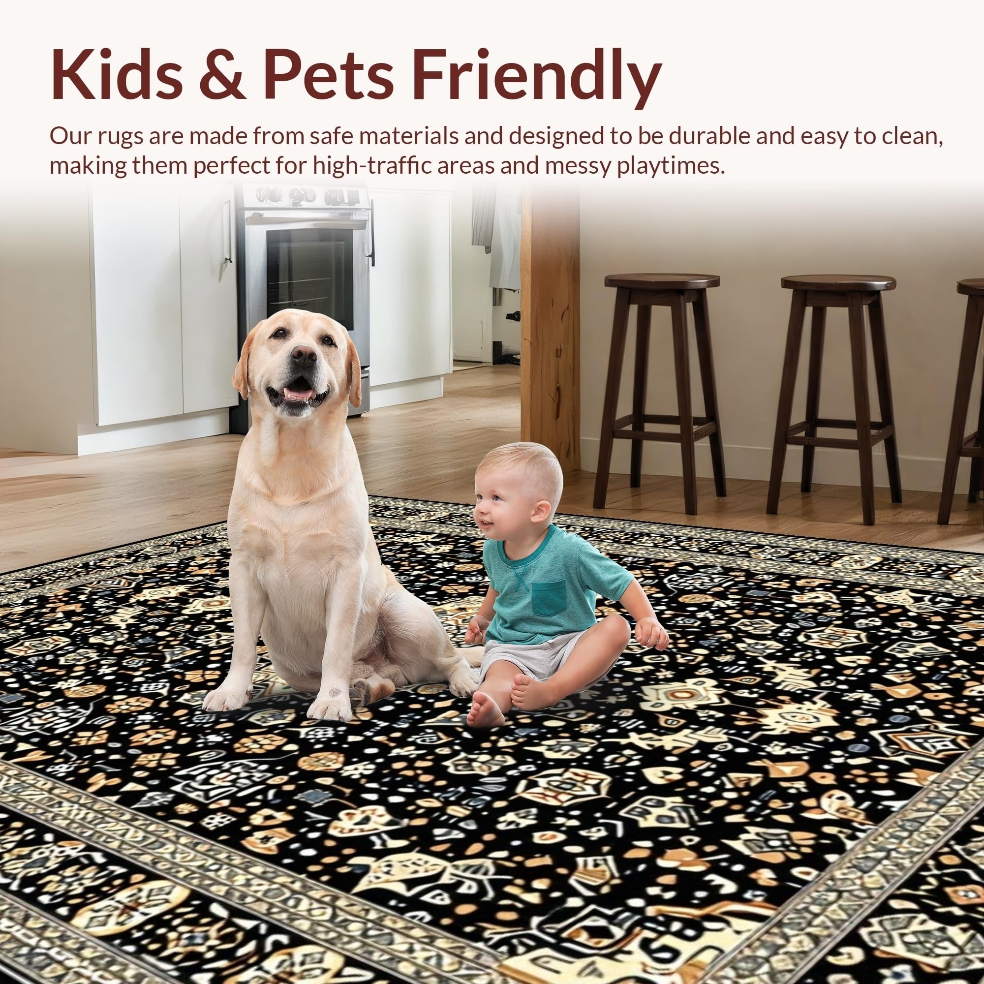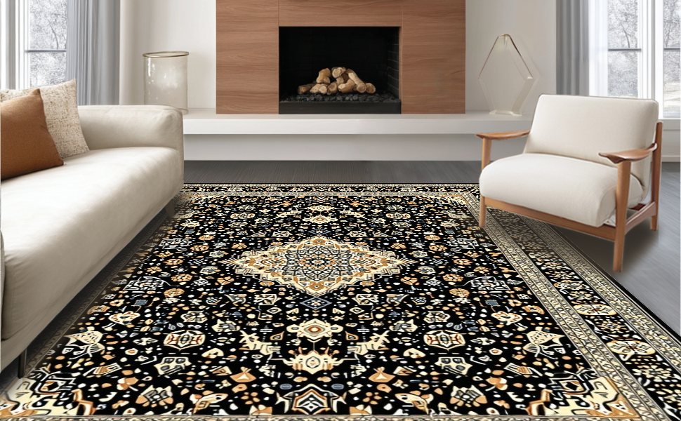 Ultra Soft Area Rug, Non Slip, Stain Resistant, Washable Area Rugs for Living Room, Bedroom, Classic Gold Accented Geometric Pattern(Black) Overview: