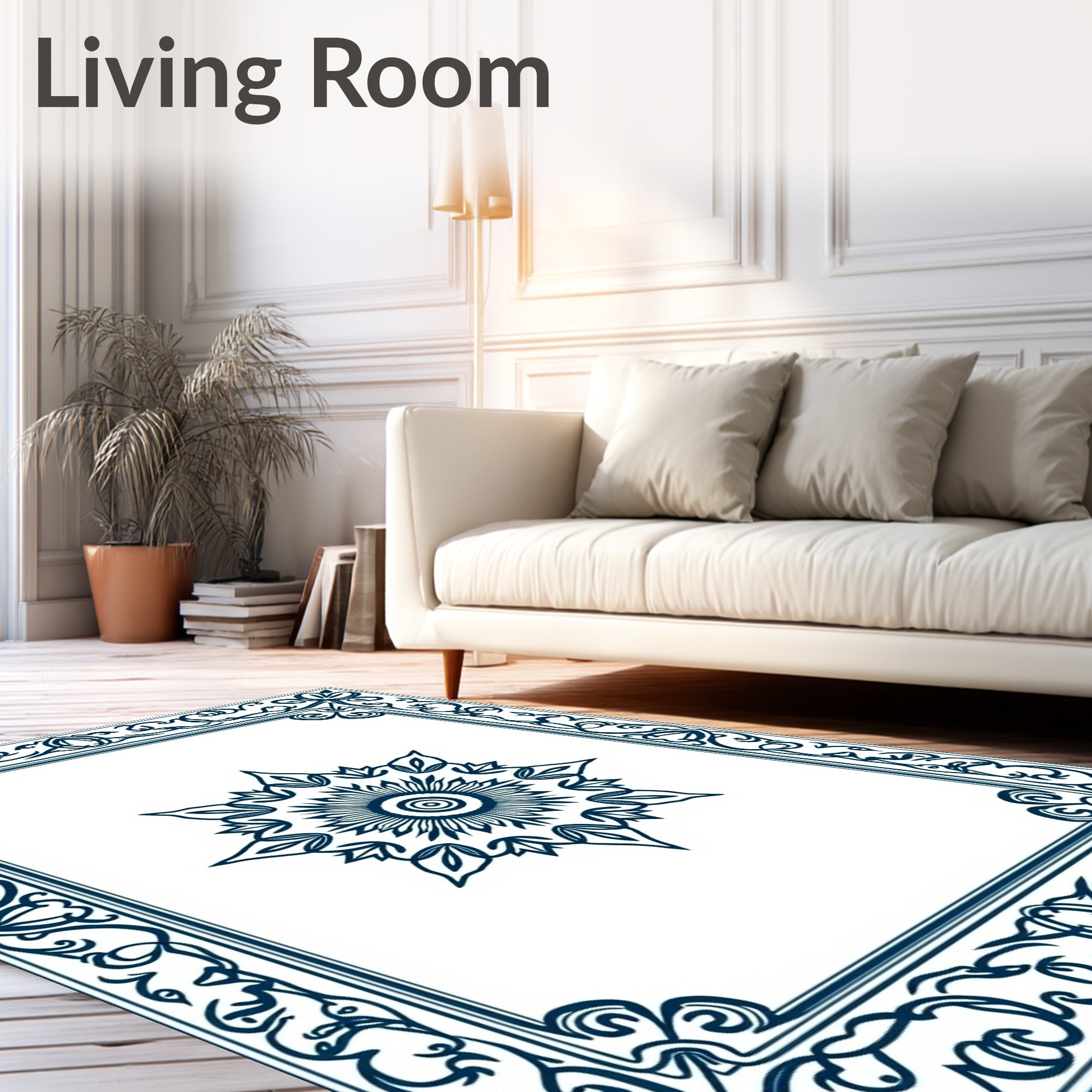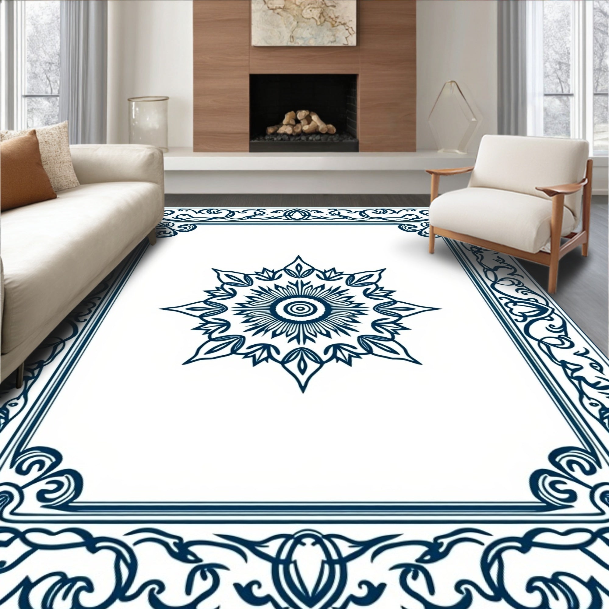 Ultra Soft Area Rug, Non Slip, Stain Resistant, Washable Area Rugs for Living Room, Bedroom, Classic Rosette Center with Scrollwork Border Detailing(Blue) Overview: