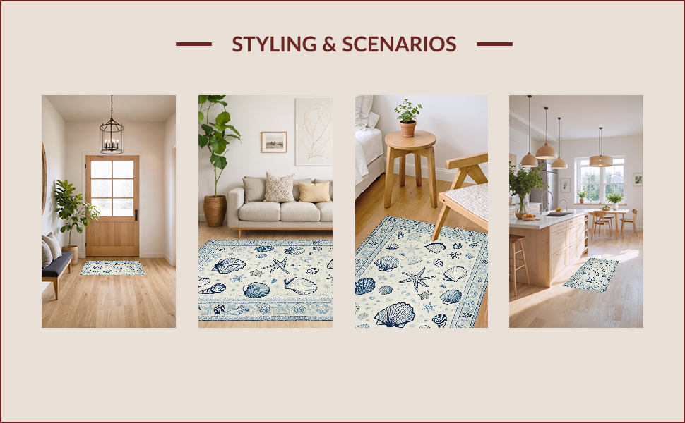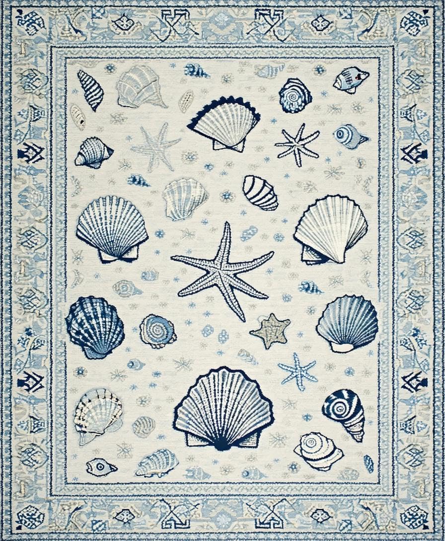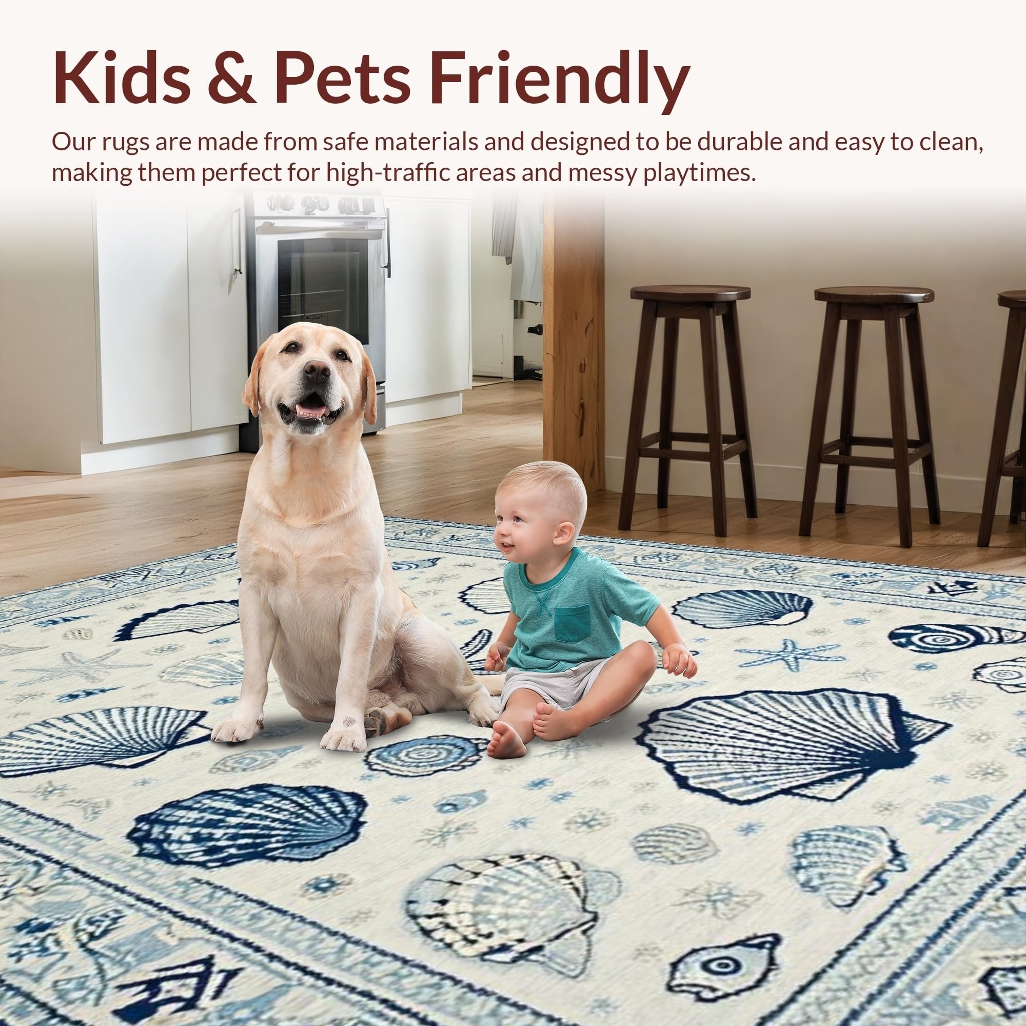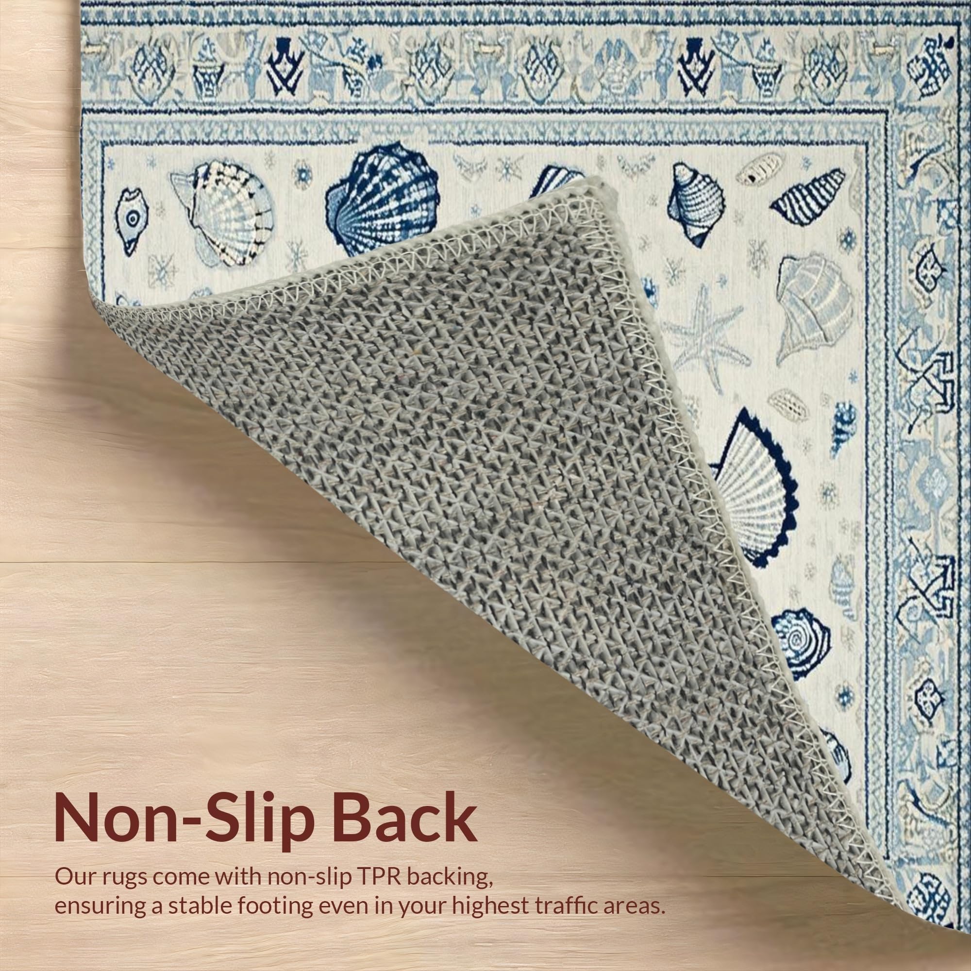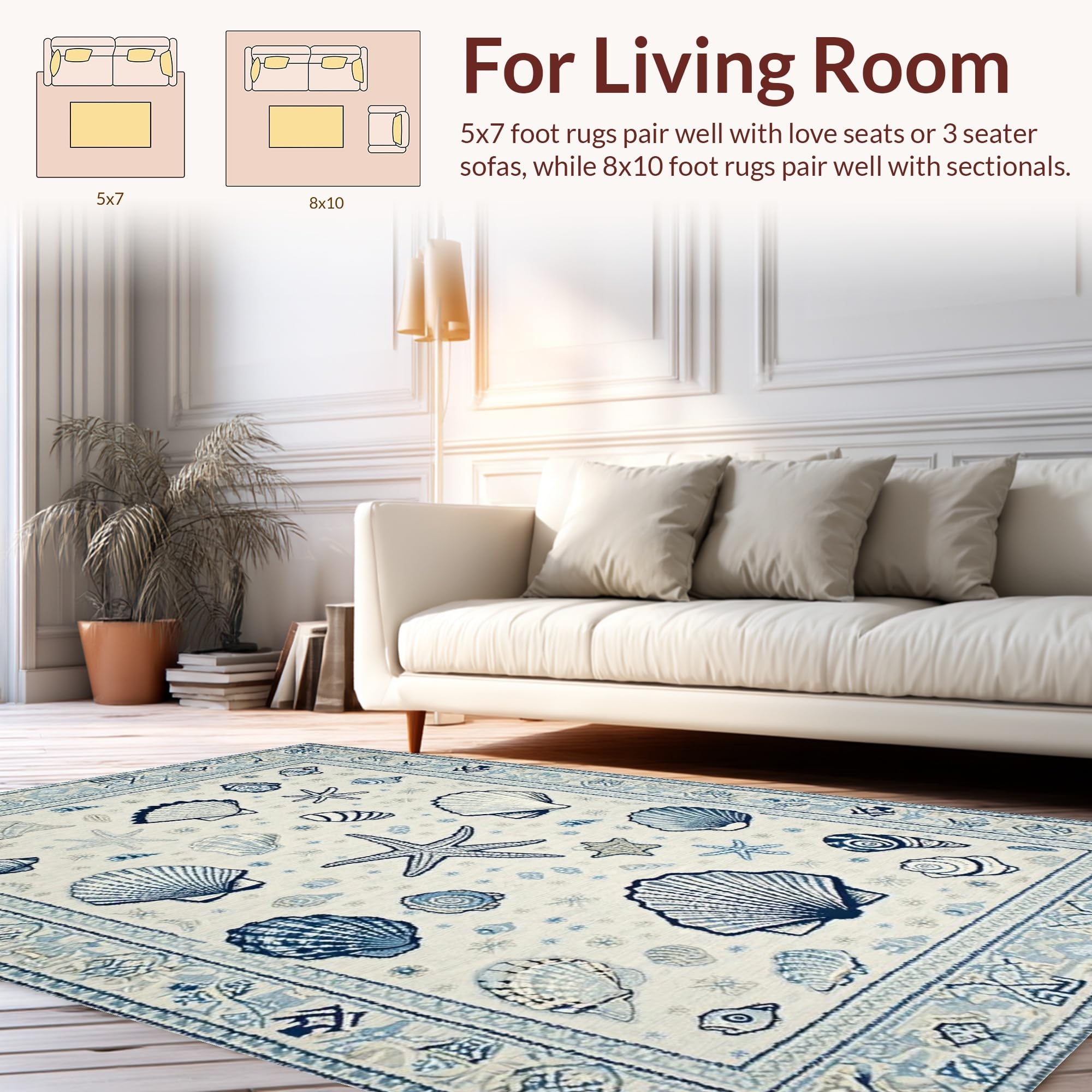 Ultra Soft Area Rug, Non Slip, Stain Resistant, Washable Area Rugs for Living Room, Bedroom, Coastal Shell Motif with Blue Hues(Blue) Overview: