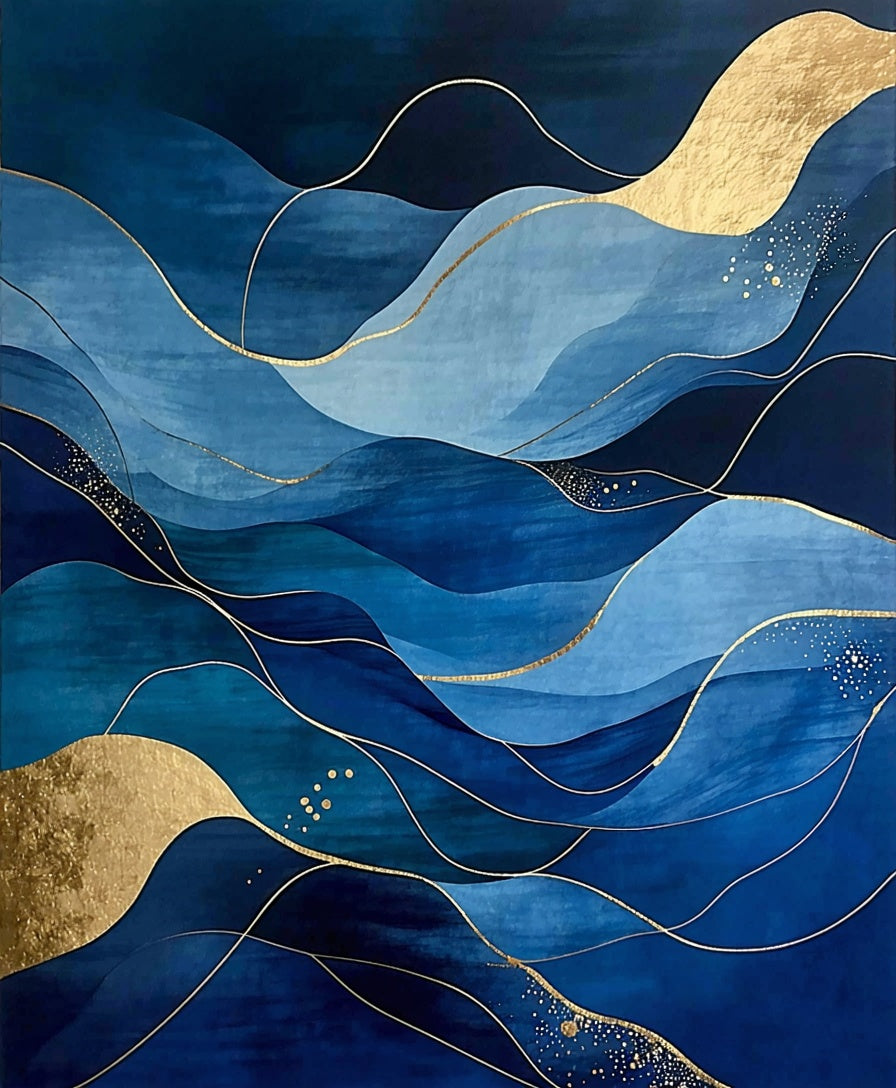 Contemporary Abstract with Waves and Gold Veins(Blue)