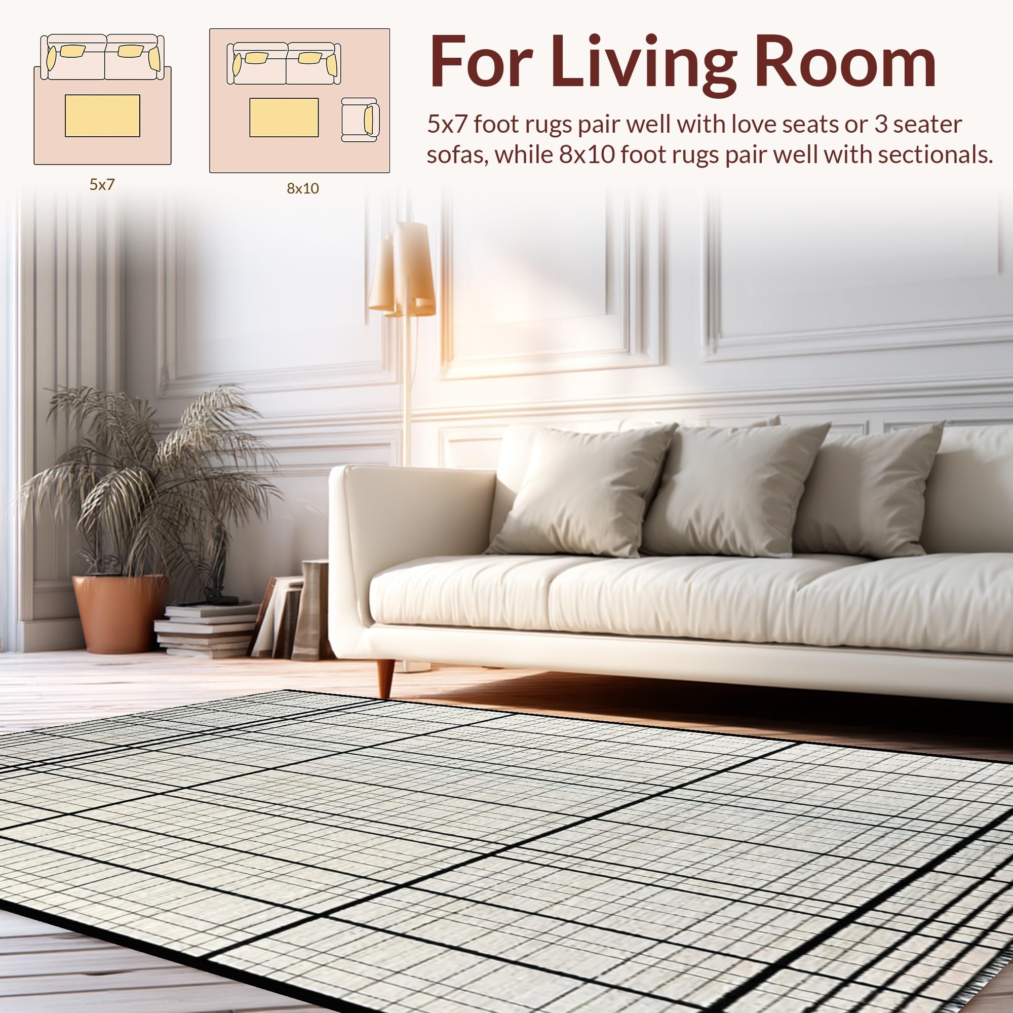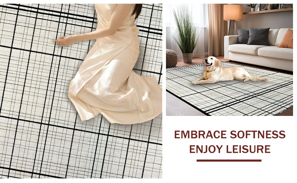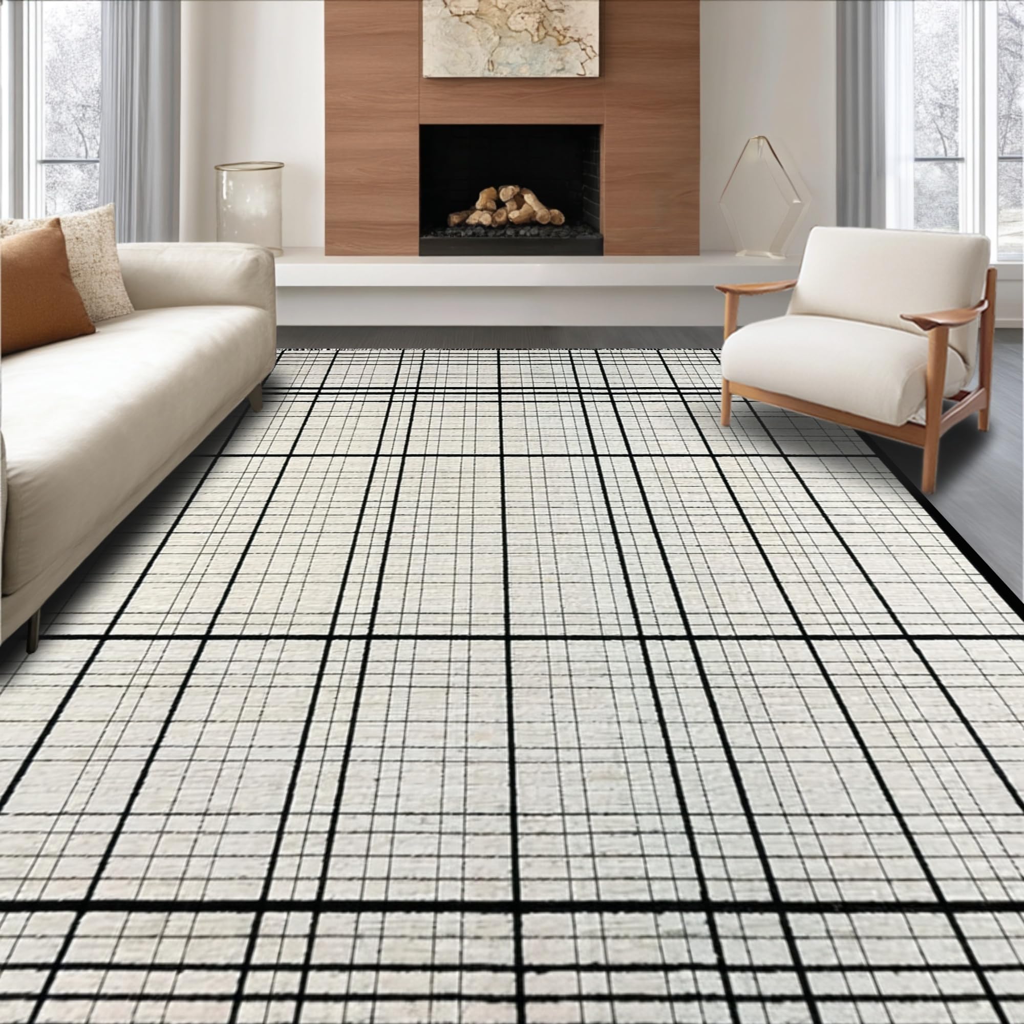 Ultra Soft Area Rug, Non Slip, Stain Resistant, Washable Area Rugs for Living Room, Bedroom, Contemporary Black and White Grid Stripe Rug with Minimalist Layered Motif(Beige) Overview: