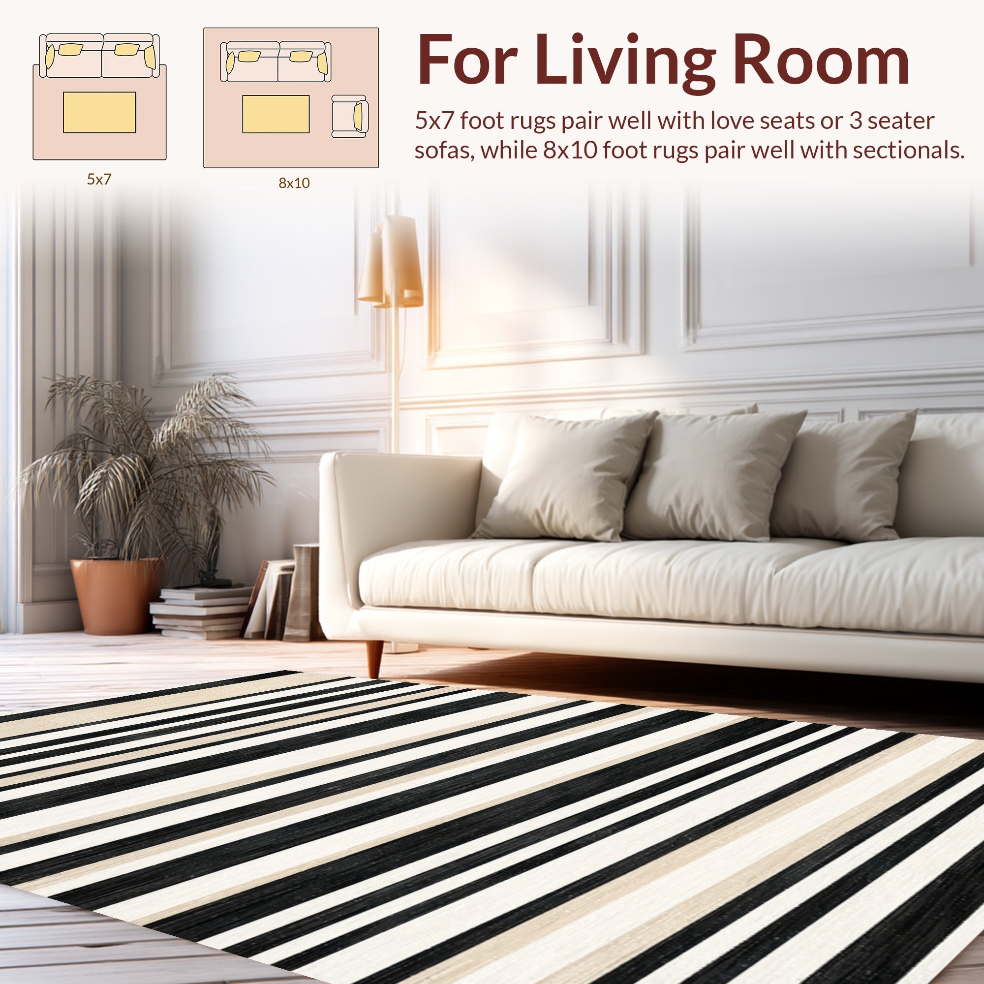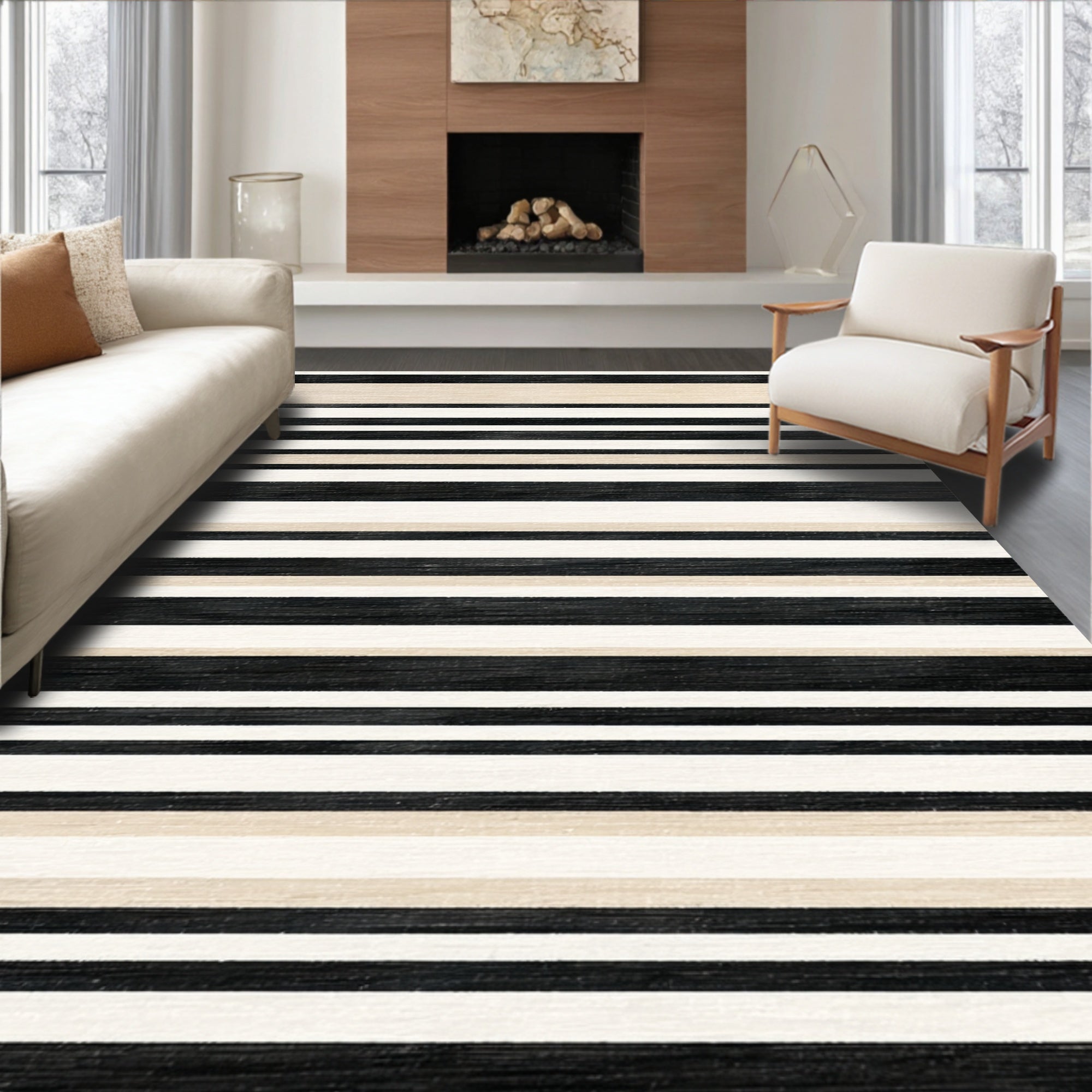 Ultra Soft Area Rug, Non Slip, Stain Resistant, Washable Area Rugs for Living Room, Bedroom, Contemporary Contrast Stripe Featuring Bold Black And White Banding(Black) Overview: