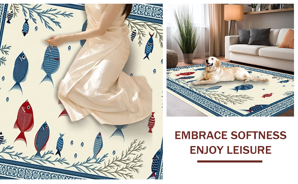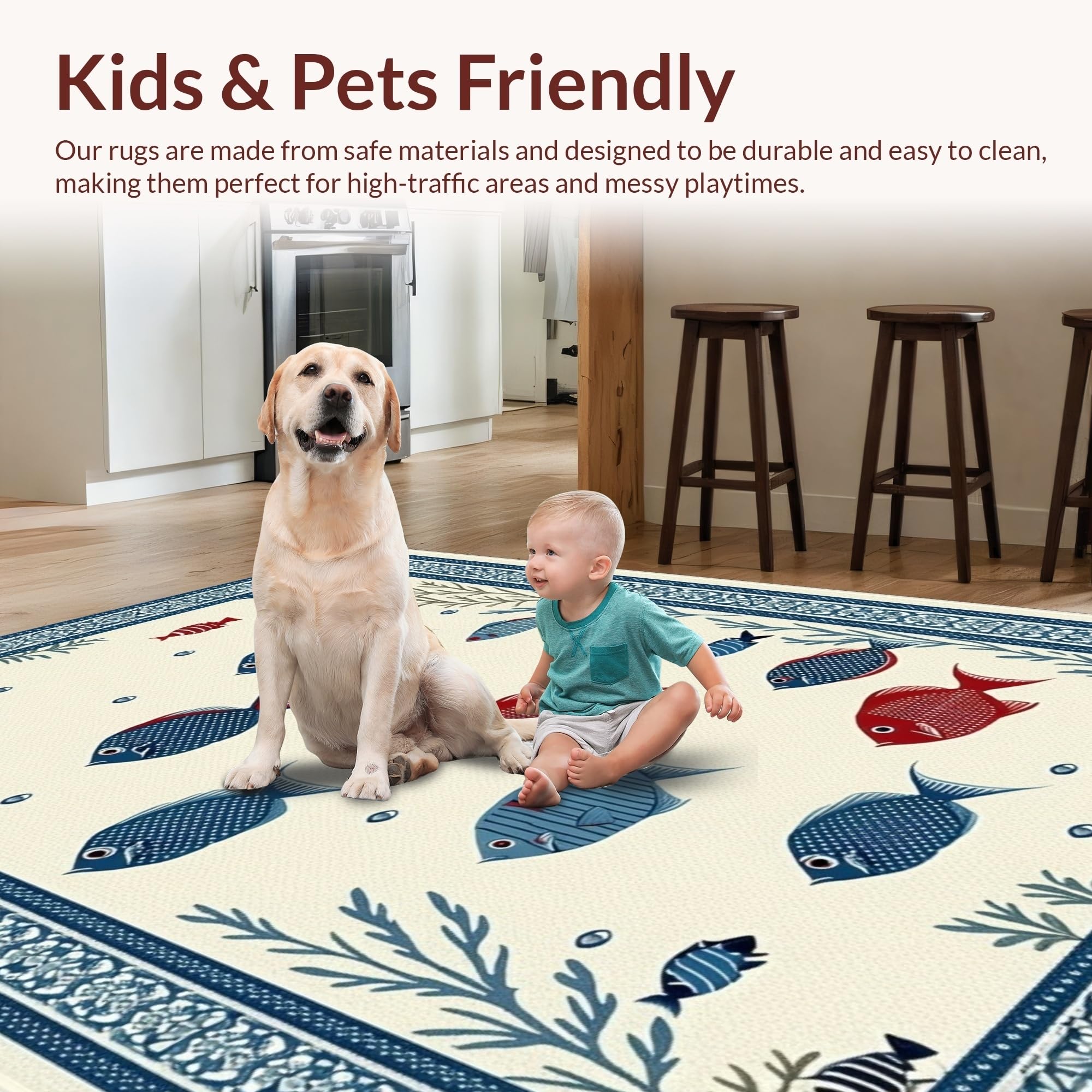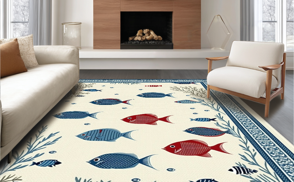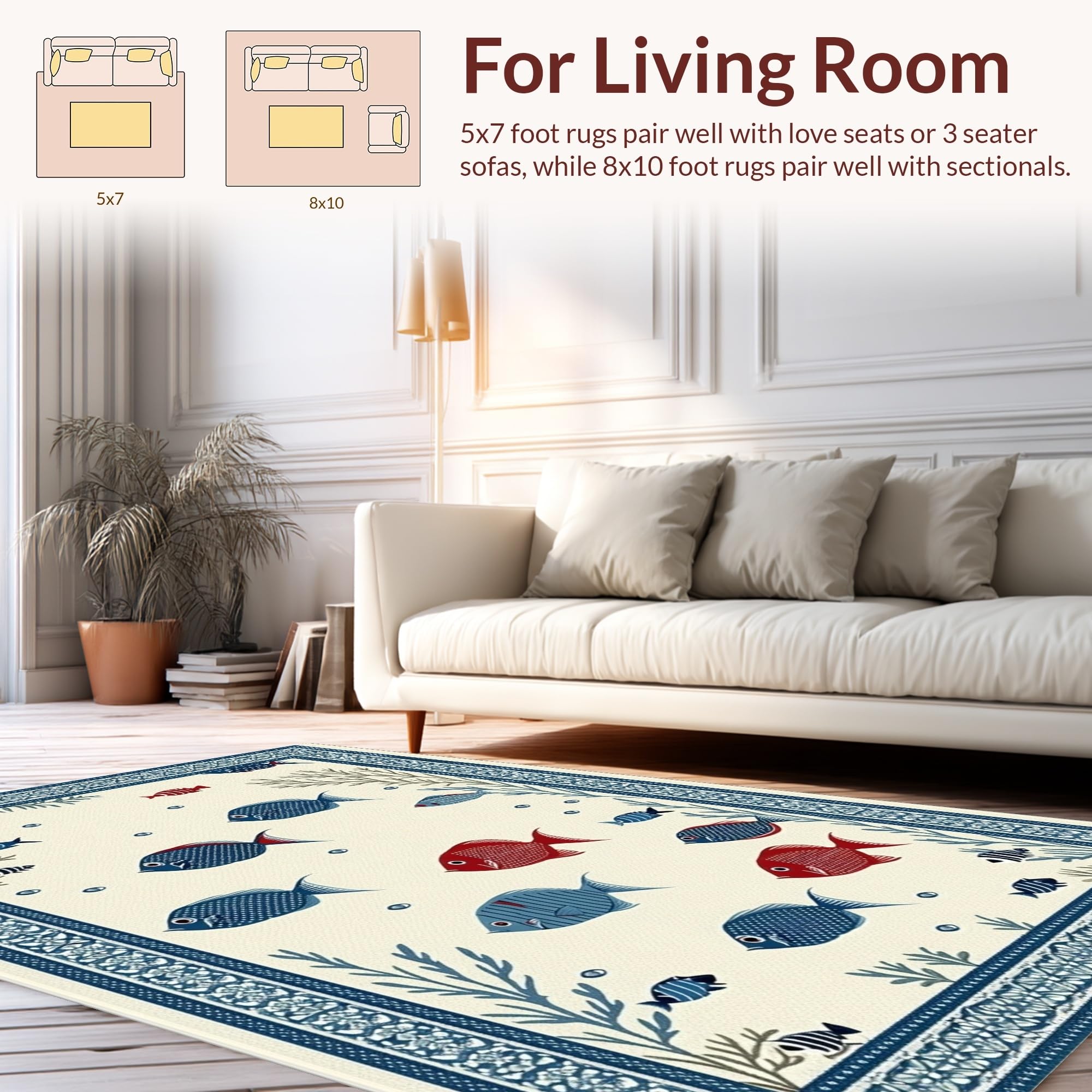 Ultra Soft Area Rug, Non Slip, Stain Resistant, Washable Area Rugs for Living Room, Bedroom, Contemporary Fish Patterned Statement Piece(Ivory) Overview: