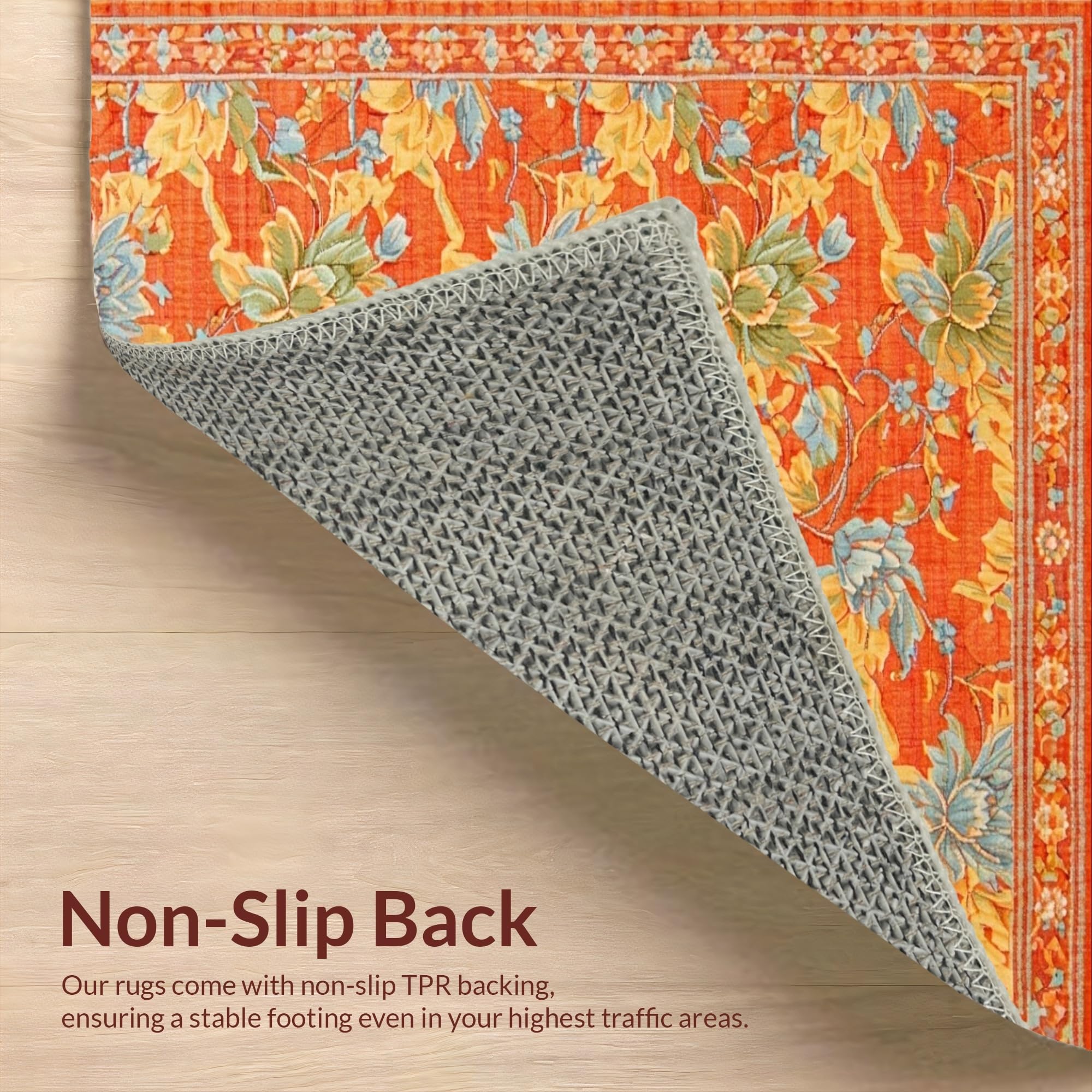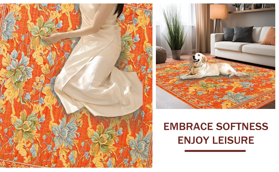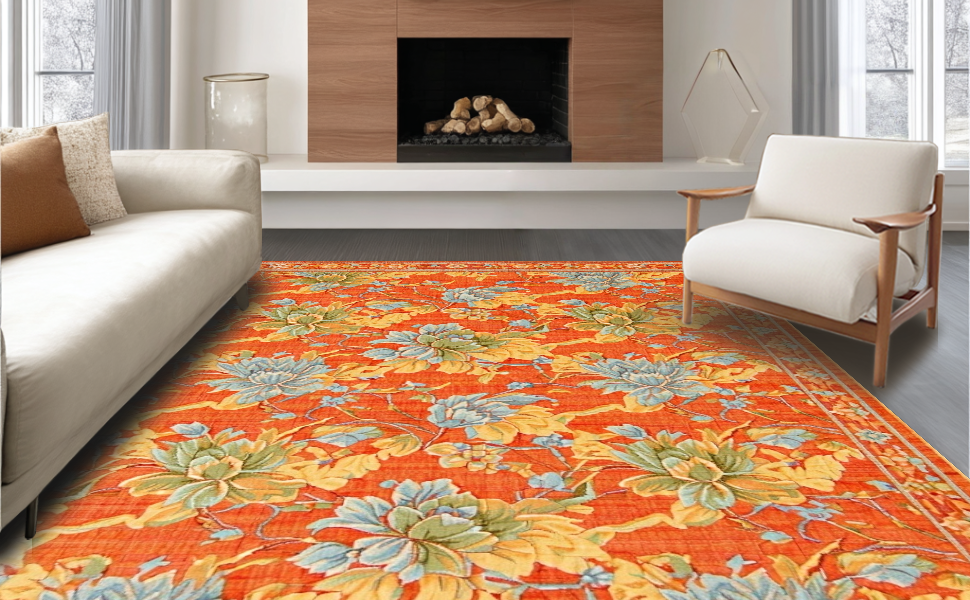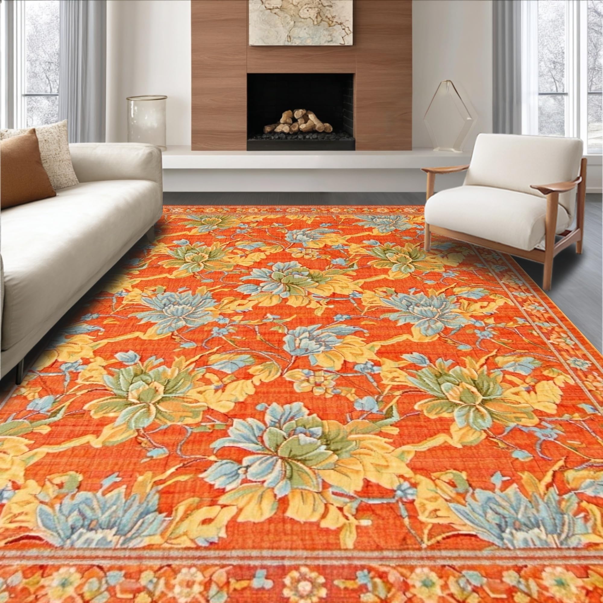 Ultra Soft Area Rug, Non Slip, Stain Resistant, Washable Area Rugs for Living Room, Bedroom, Contemporary Tropical Blossom Aesthetic(Orange) Overview: