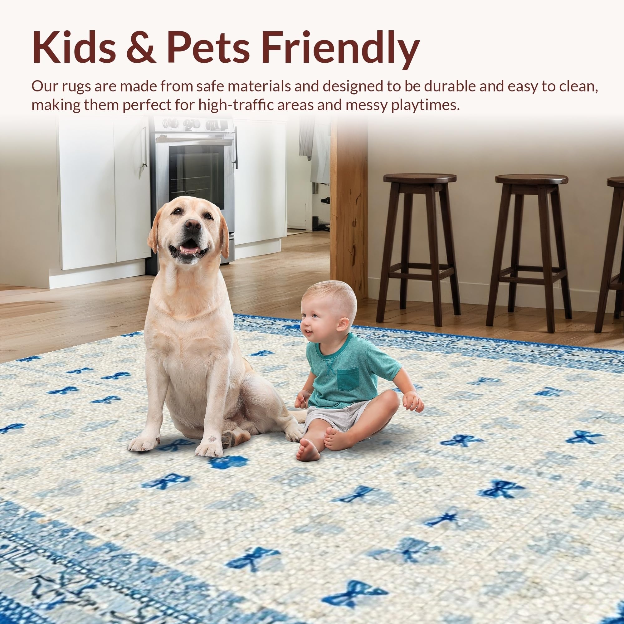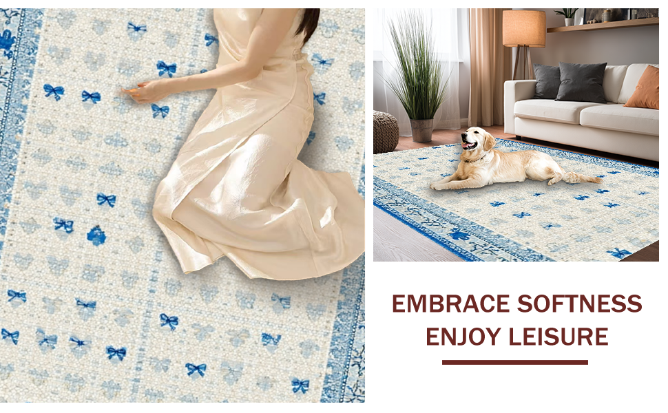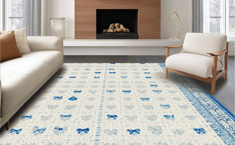 Ultra Soft Area Rug, Non Slip, Stain Resistant, Washable Area Rugs for Living Room, Bedroom, Coquette Bows Rug: Blue Scallop Carpet, Preppy Aesthetic Home Decor(Beige) Overview: