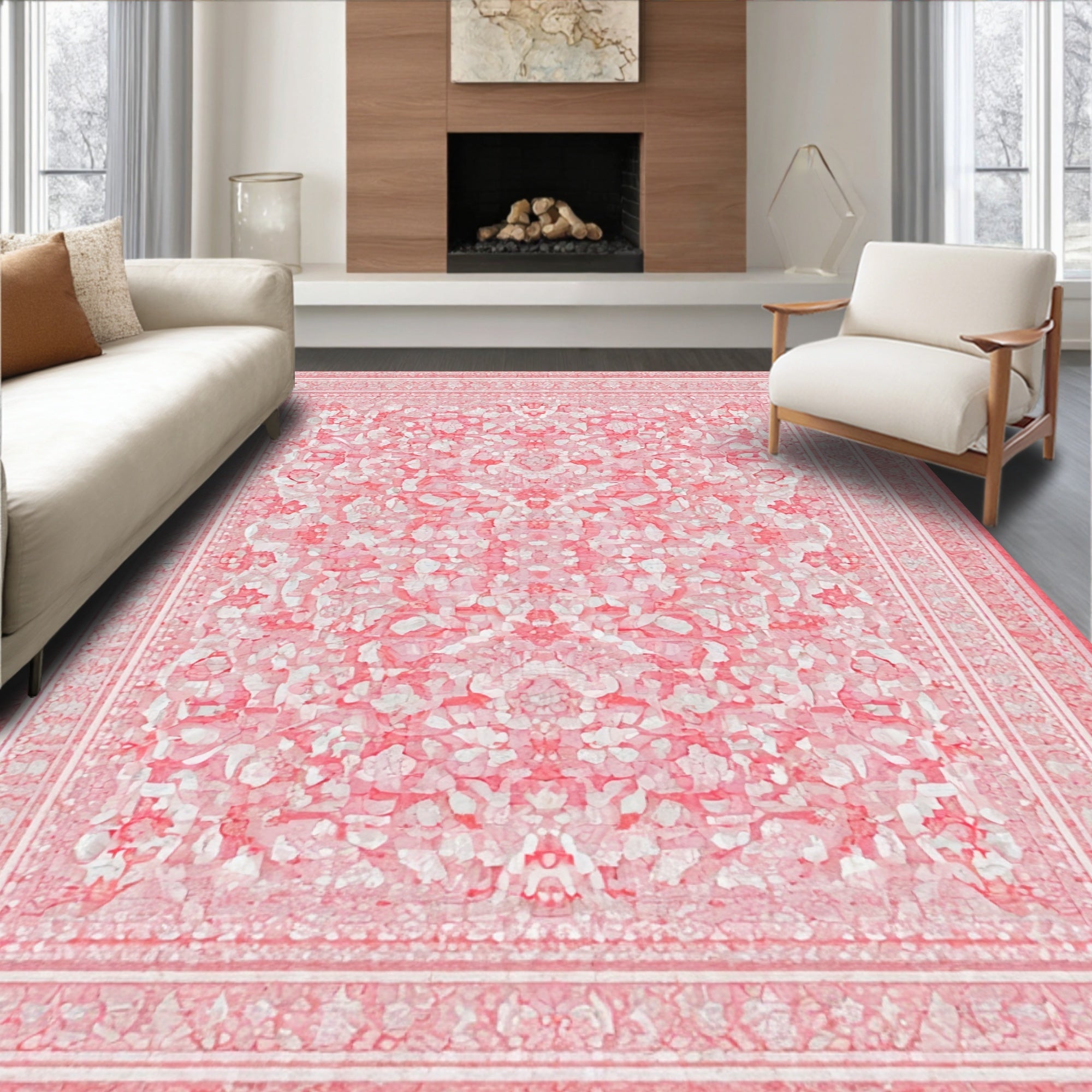 Ultra Soft Area Rug, Non Slip, Stain Resistant, Washable Area Rugs for Living Room, Bedroom, Coquette Ribbon Edge Rug Scalloped Bow Print with Artistic Wavy Patterns(Pink) Overview: