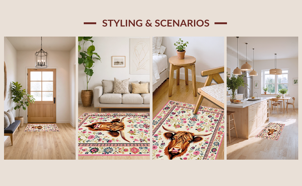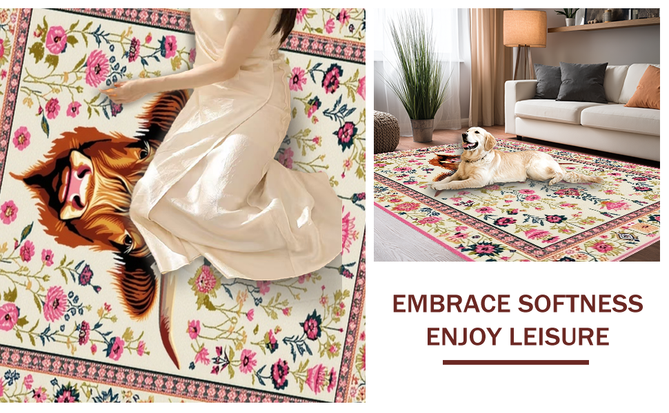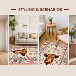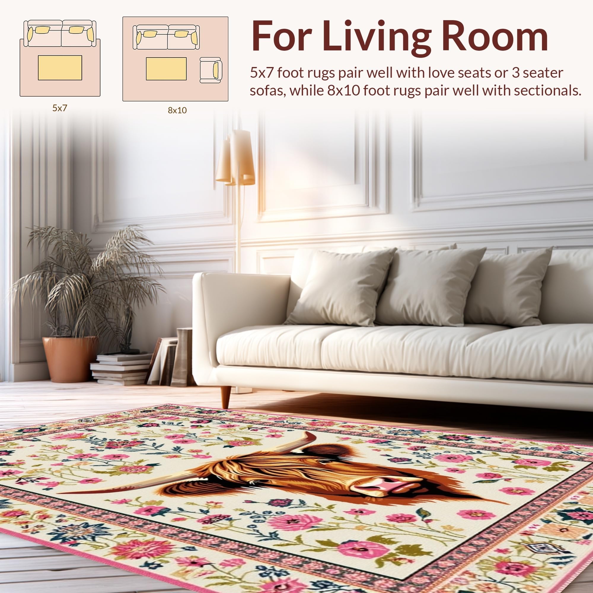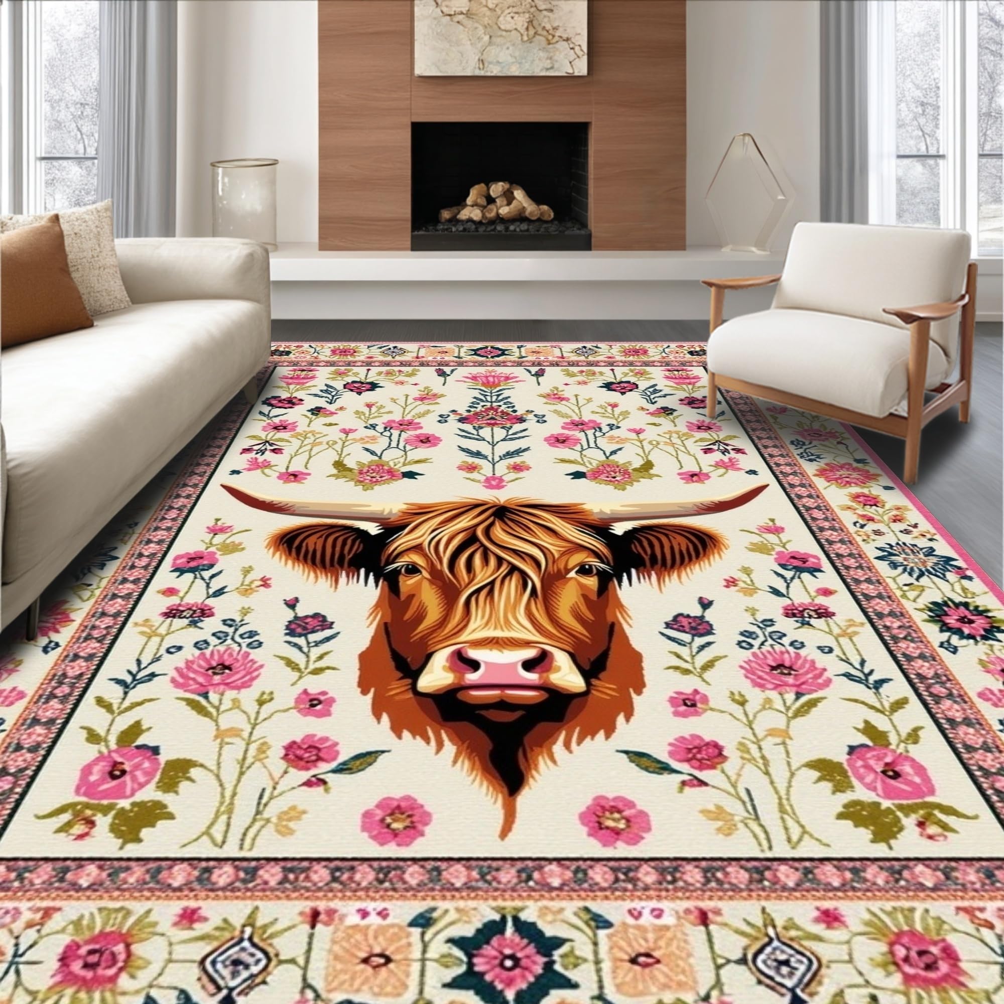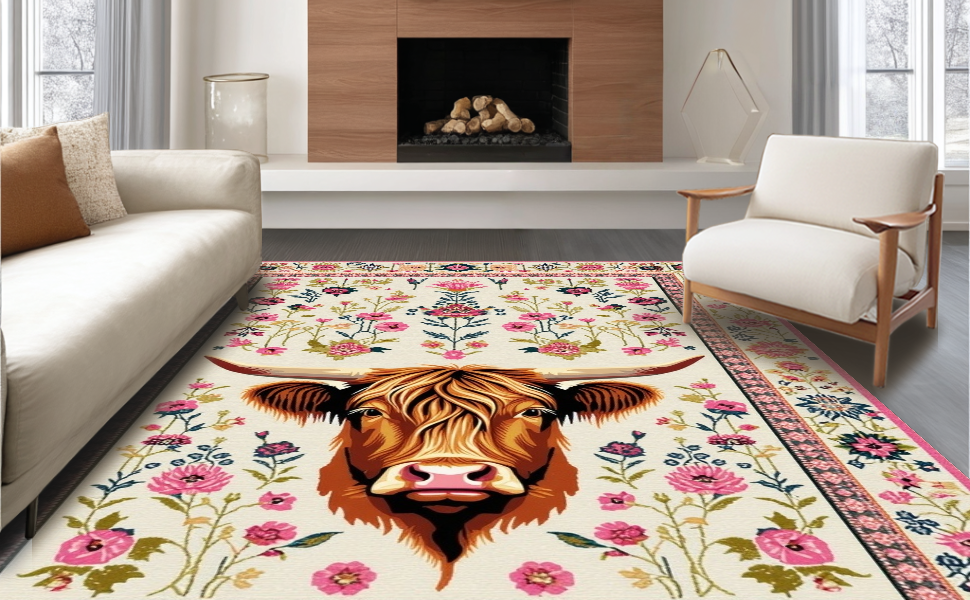 Ultra Soft Area Rug, Non Slip, Stain Resistant, Washable Area Rugs for Living Room, Bedroom, Cozy Vintage Cattle Graphics(Beige) Overview: