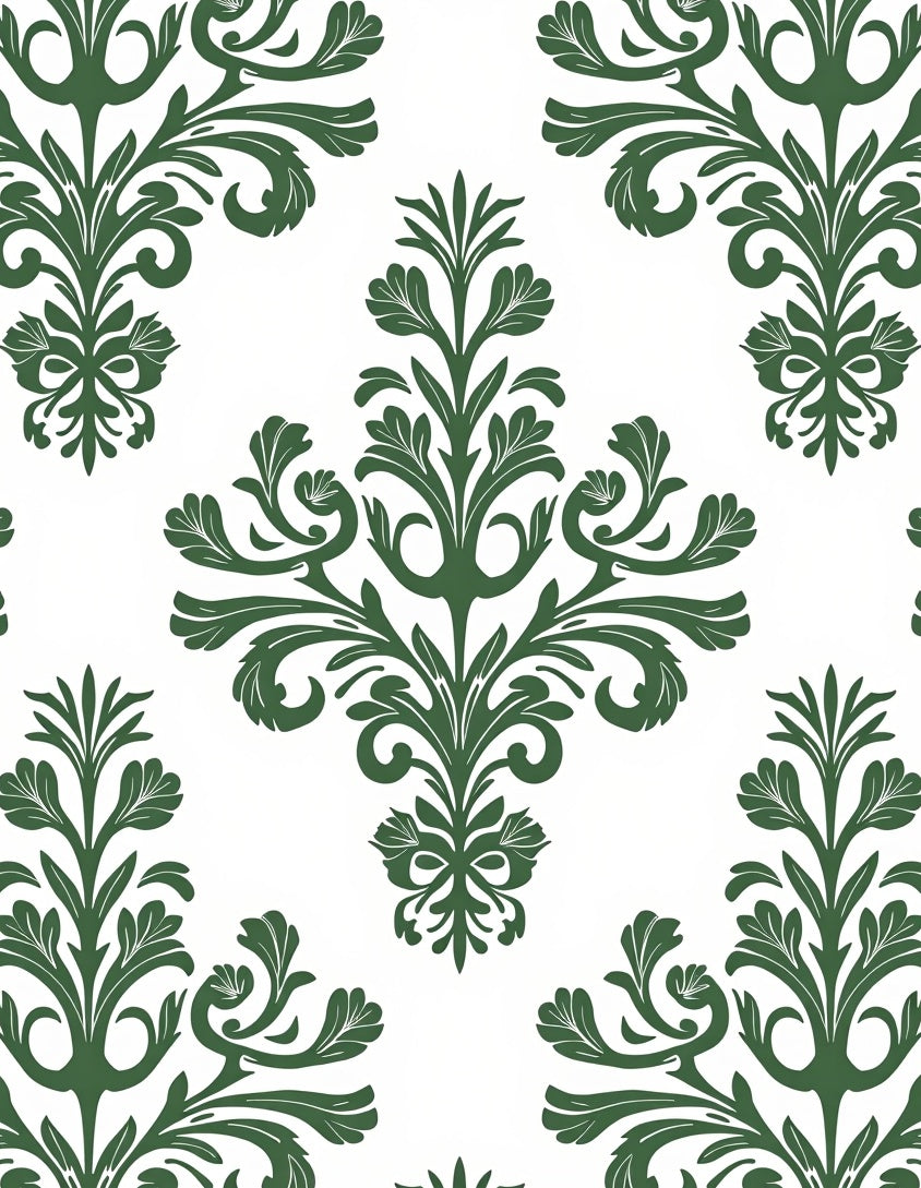 Damask Scrollwork Design with Botanical(Green)