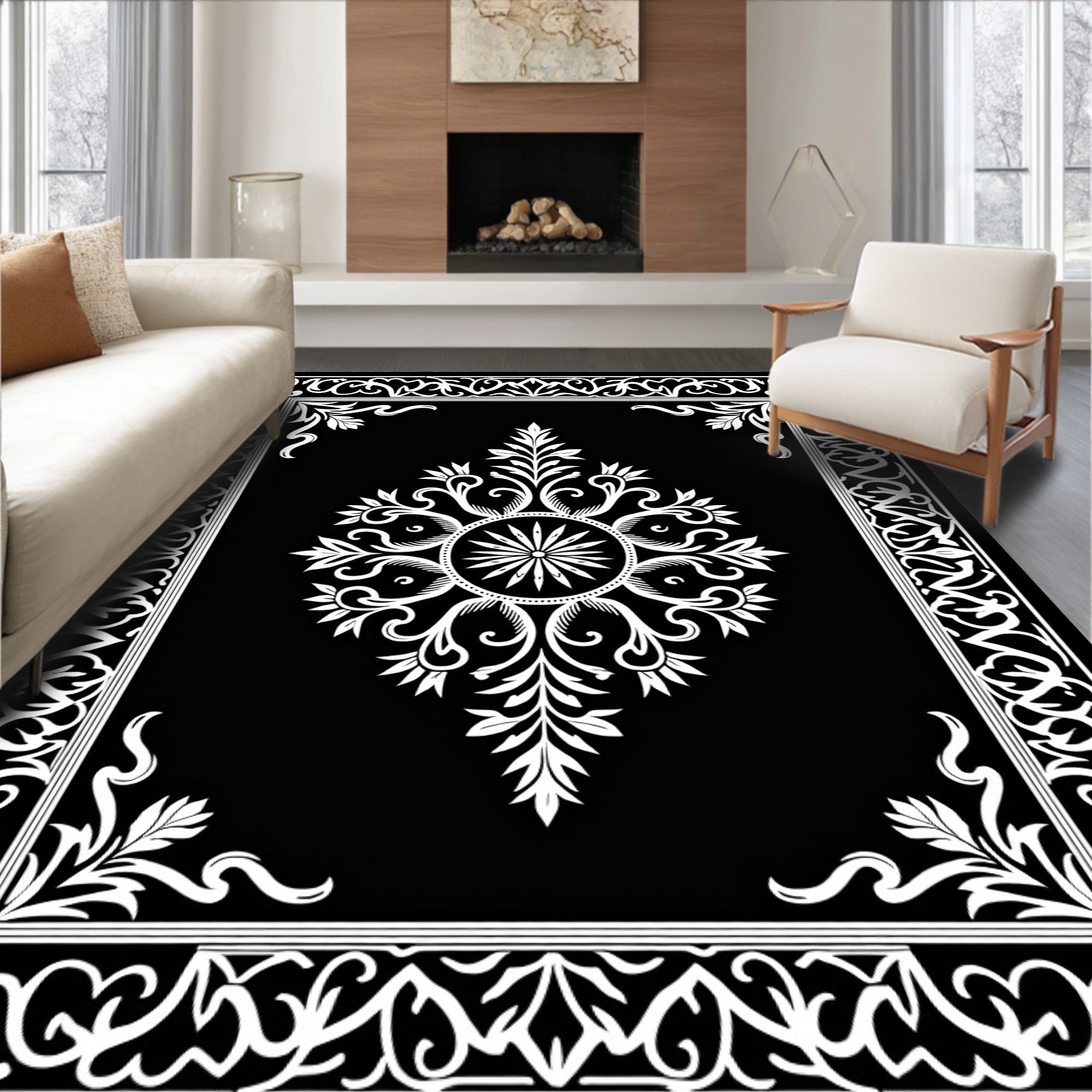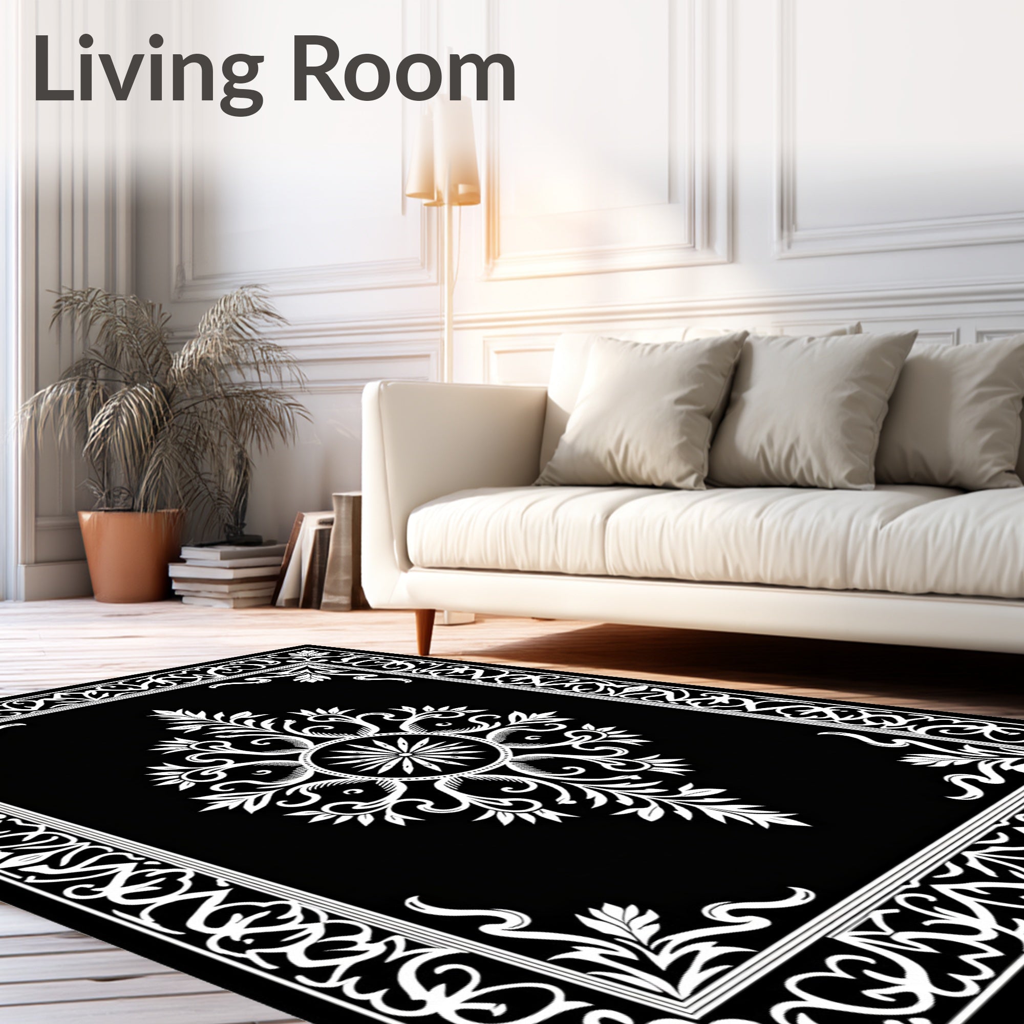 Ultra Soft Area Rug, Non Slip, Stain Resistant, Washable Area Rugs for Living Room, Bedroom, Damask Vinework with Ornate Botanical Scrolls(Black) Overview: