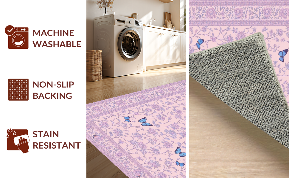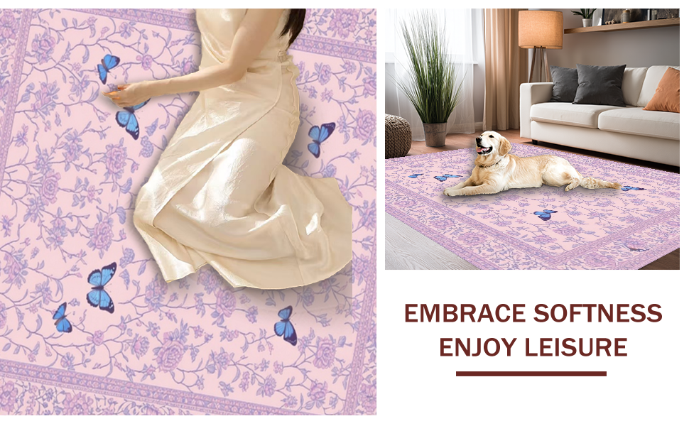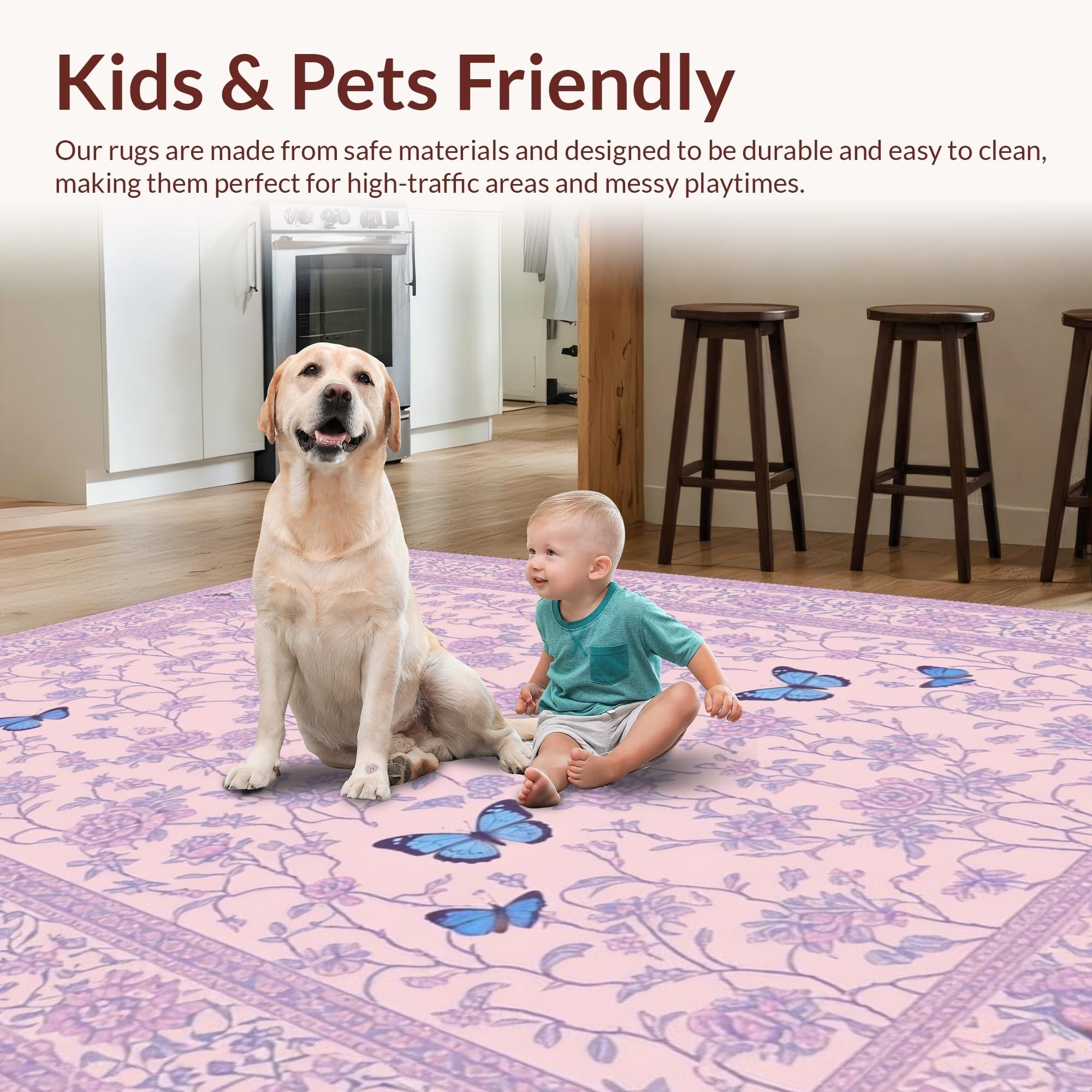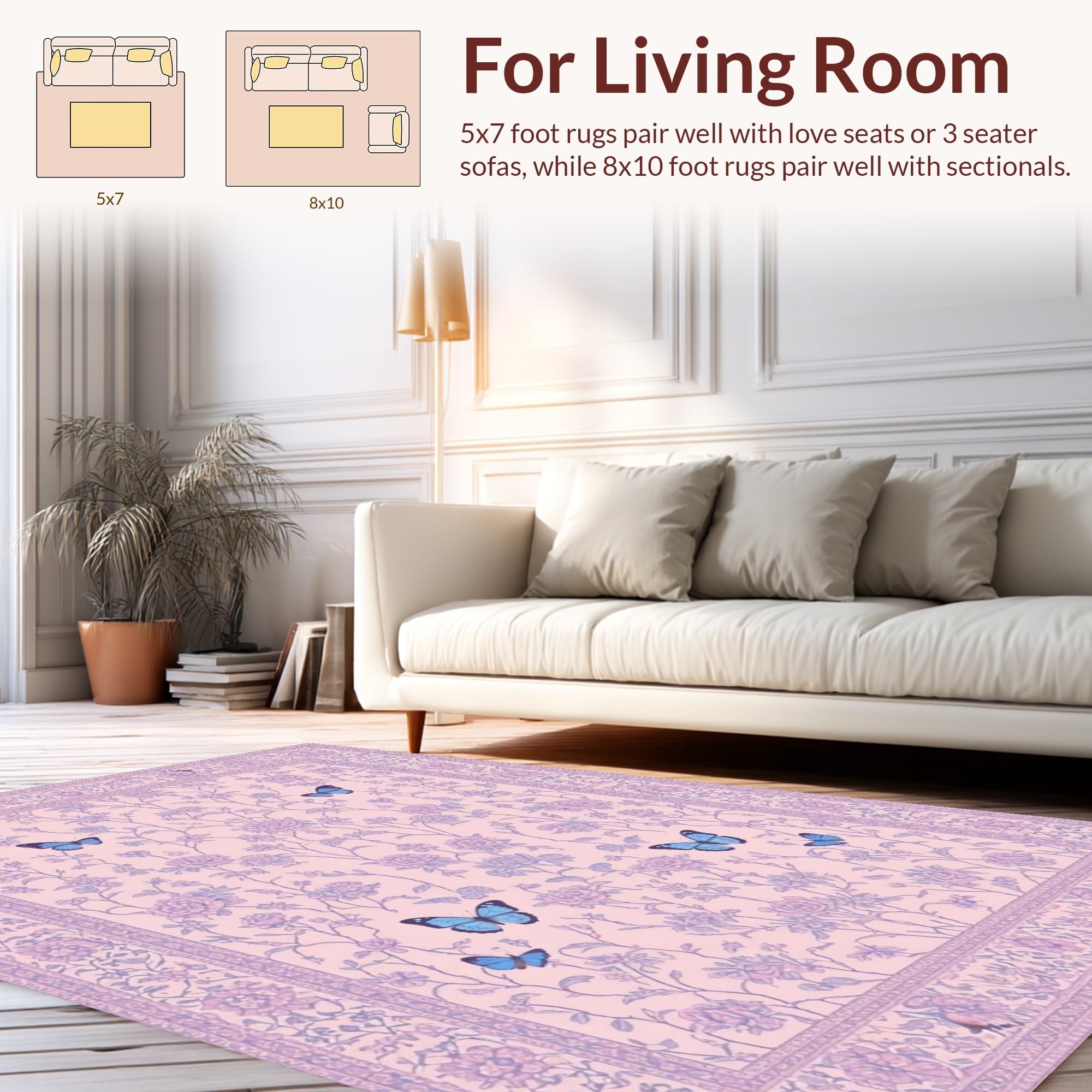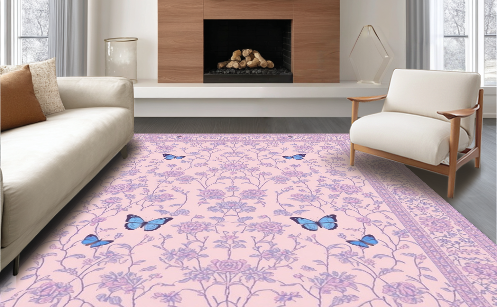 Ultra Soft Area Rug, Non Slip, Stain Resistant, Washable Area Rugs for Living Room, Bedroom, Delicate Springtime Butterfly Design(Pink) Overview: