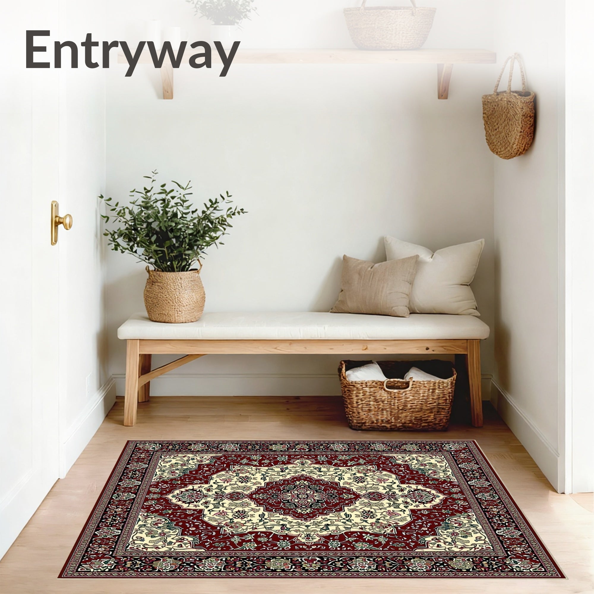 Flatwoven High Traffic Area Rug, Distressed Victorian Inspired Burgundy Ornate Medallion Floral, Non Slip, Stain Resistant, Washable Area Rugs for Living Room, Bedroom (Red) Overview: