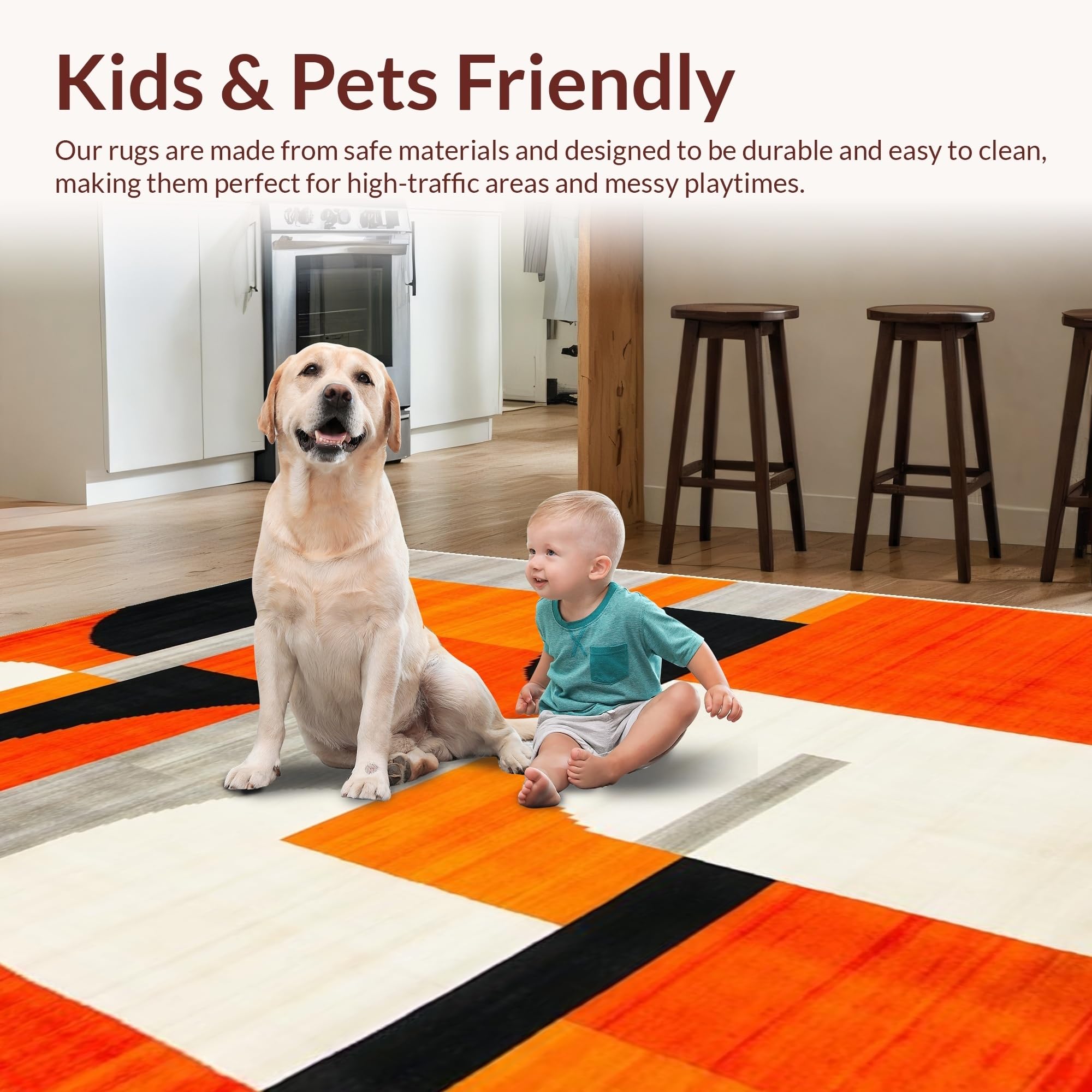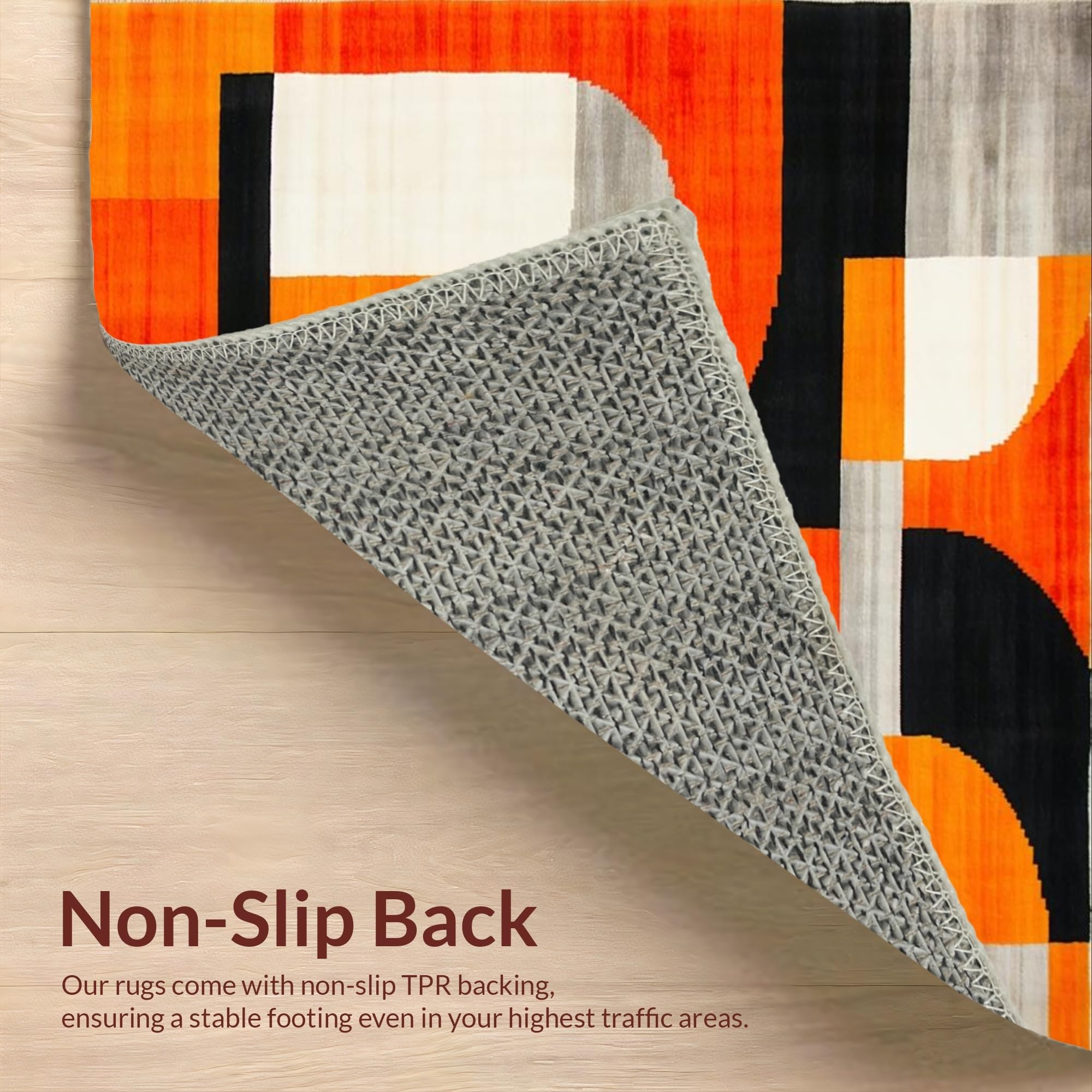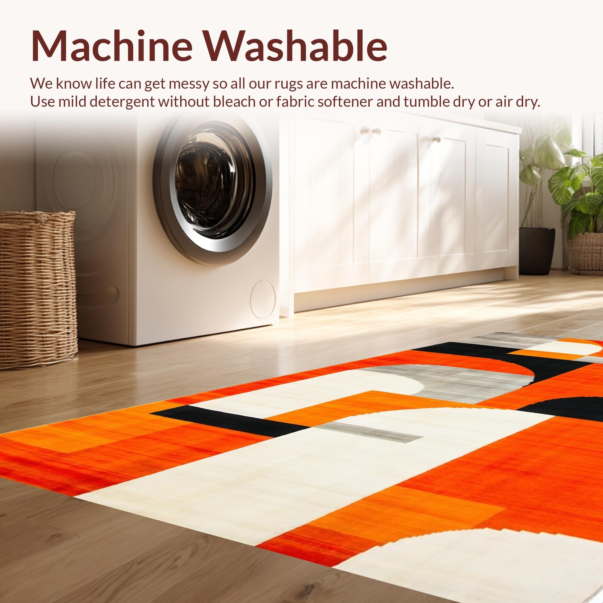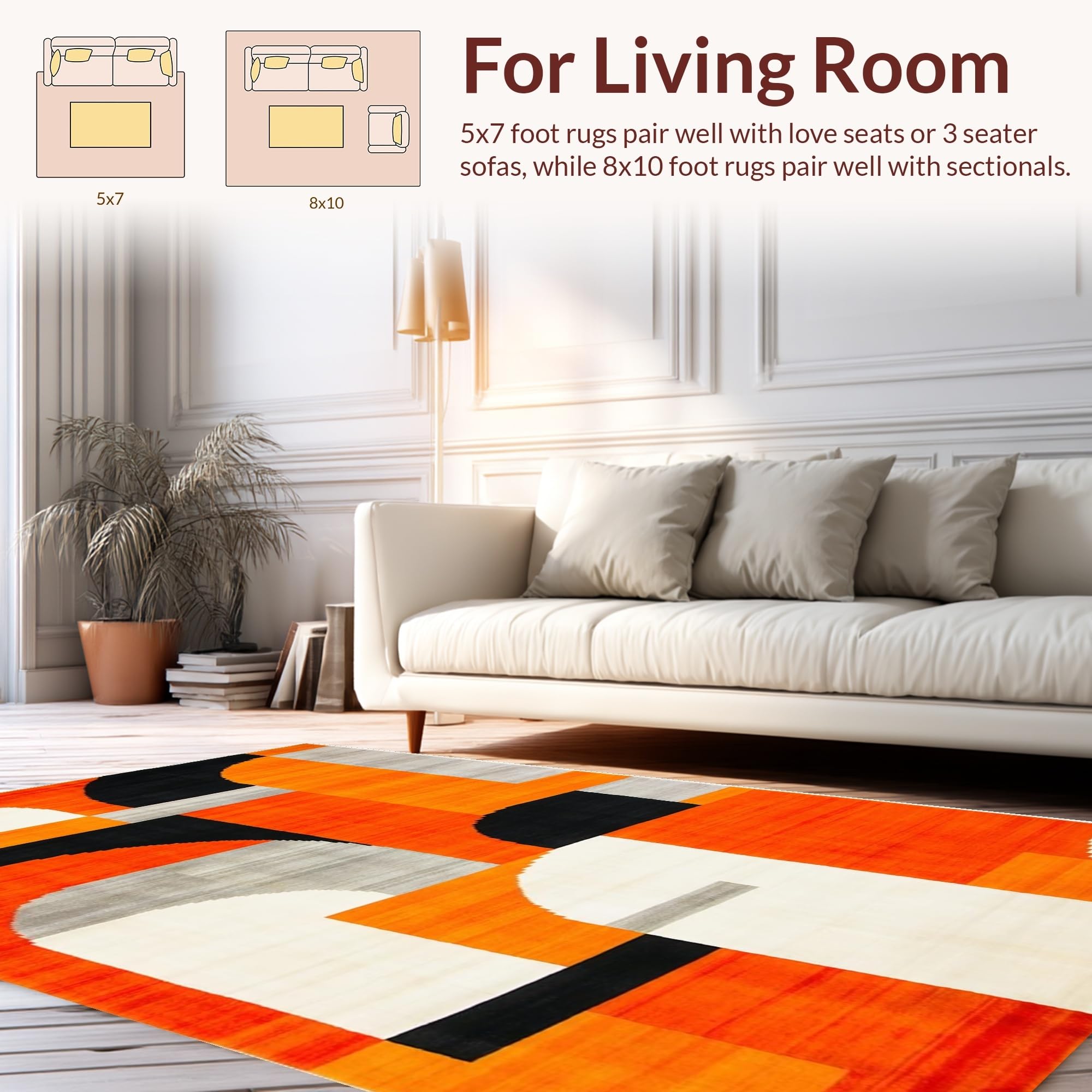 Ultra Soft Area Rug, Non Slip, Stain Resistant, Washable Area Rugs for Living Room, Bedroom, Dynamic 70s Inspired Graphic Design(Orange) Overview: