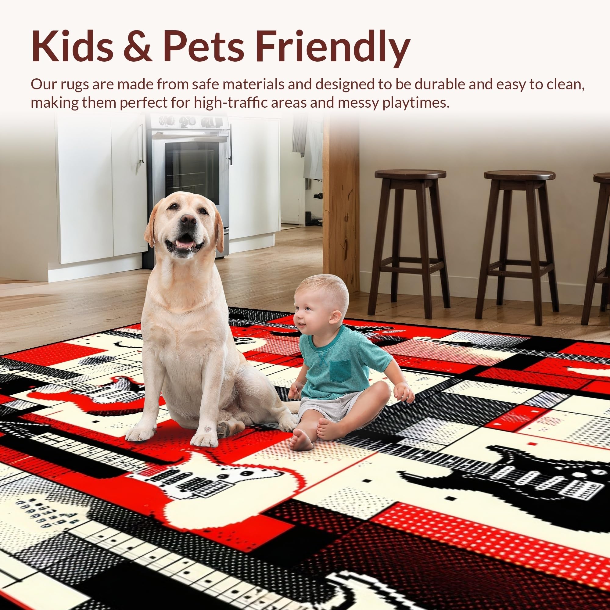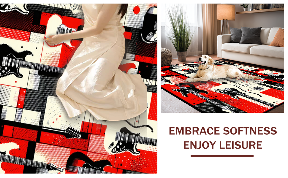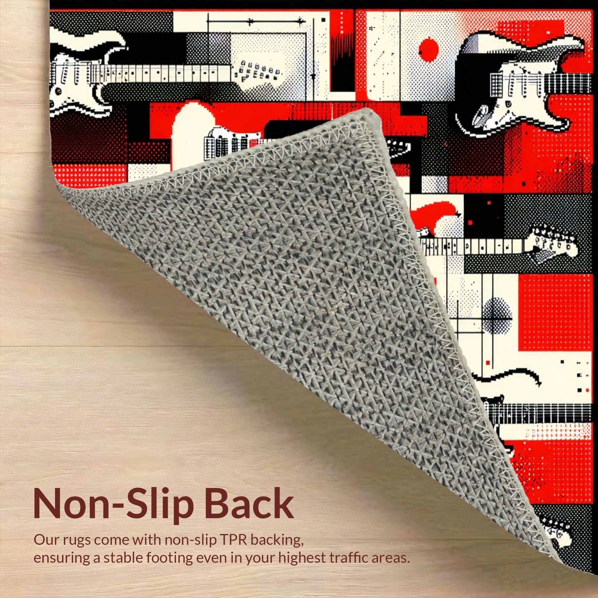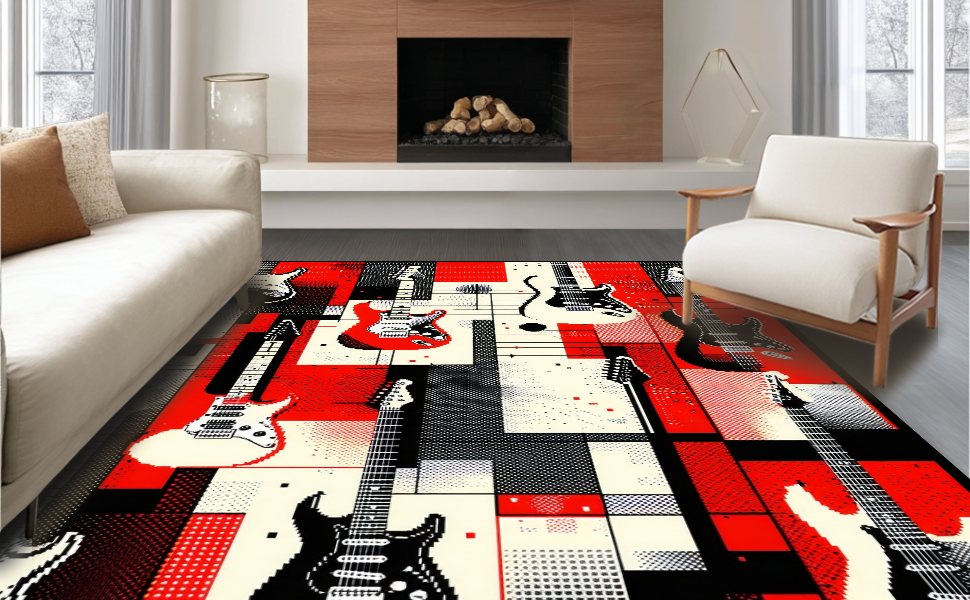 Ultra Soft Area Rug, Non Slip, Stain Resistant, Washable Area Rugs for Living Room, Bedroom, Dynamic Electric Guitar Visuals(Red) Overview: