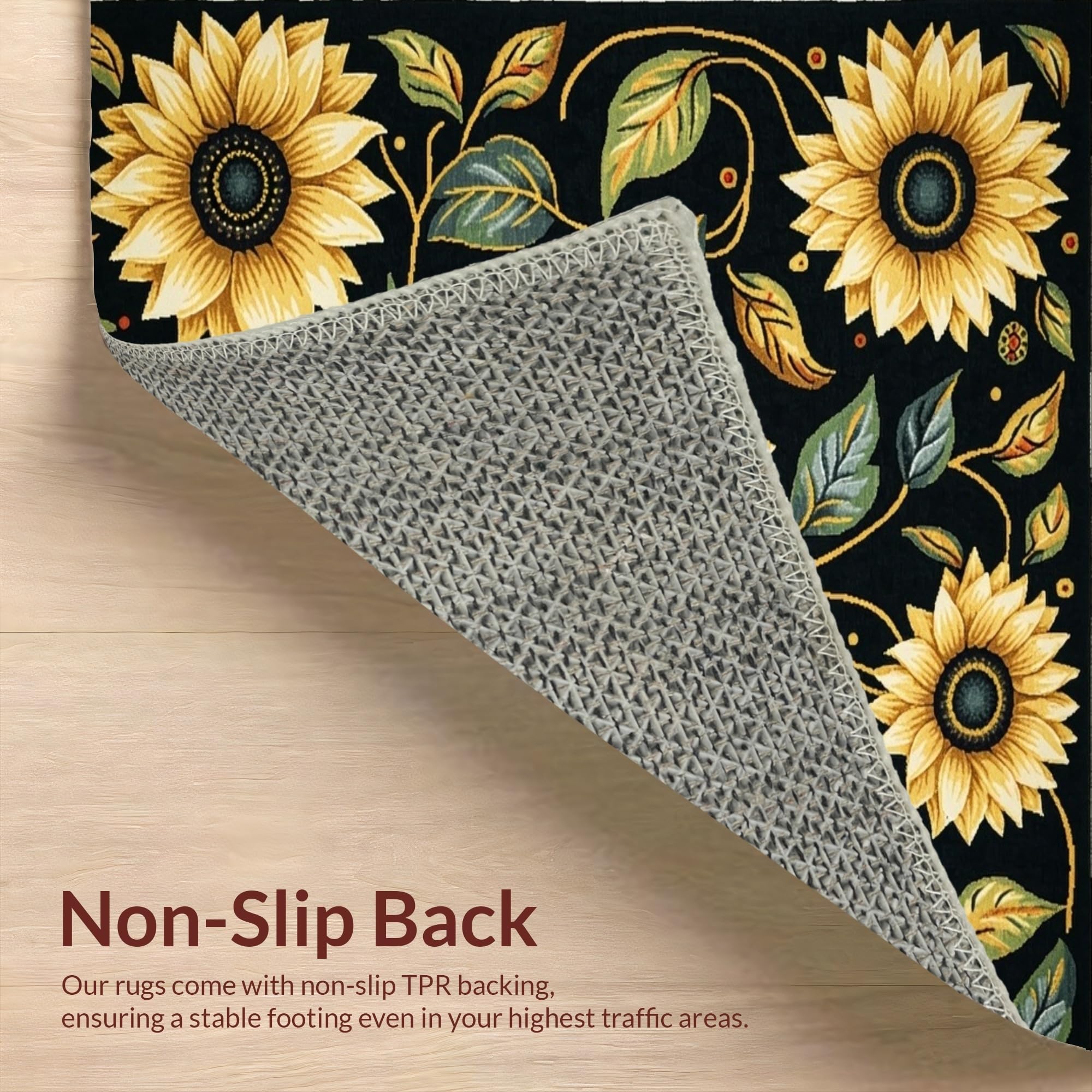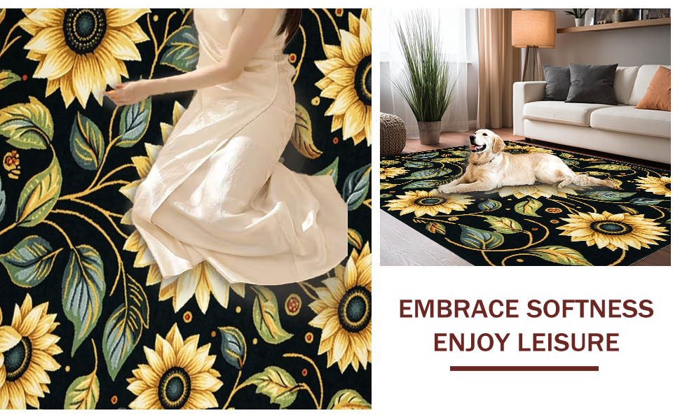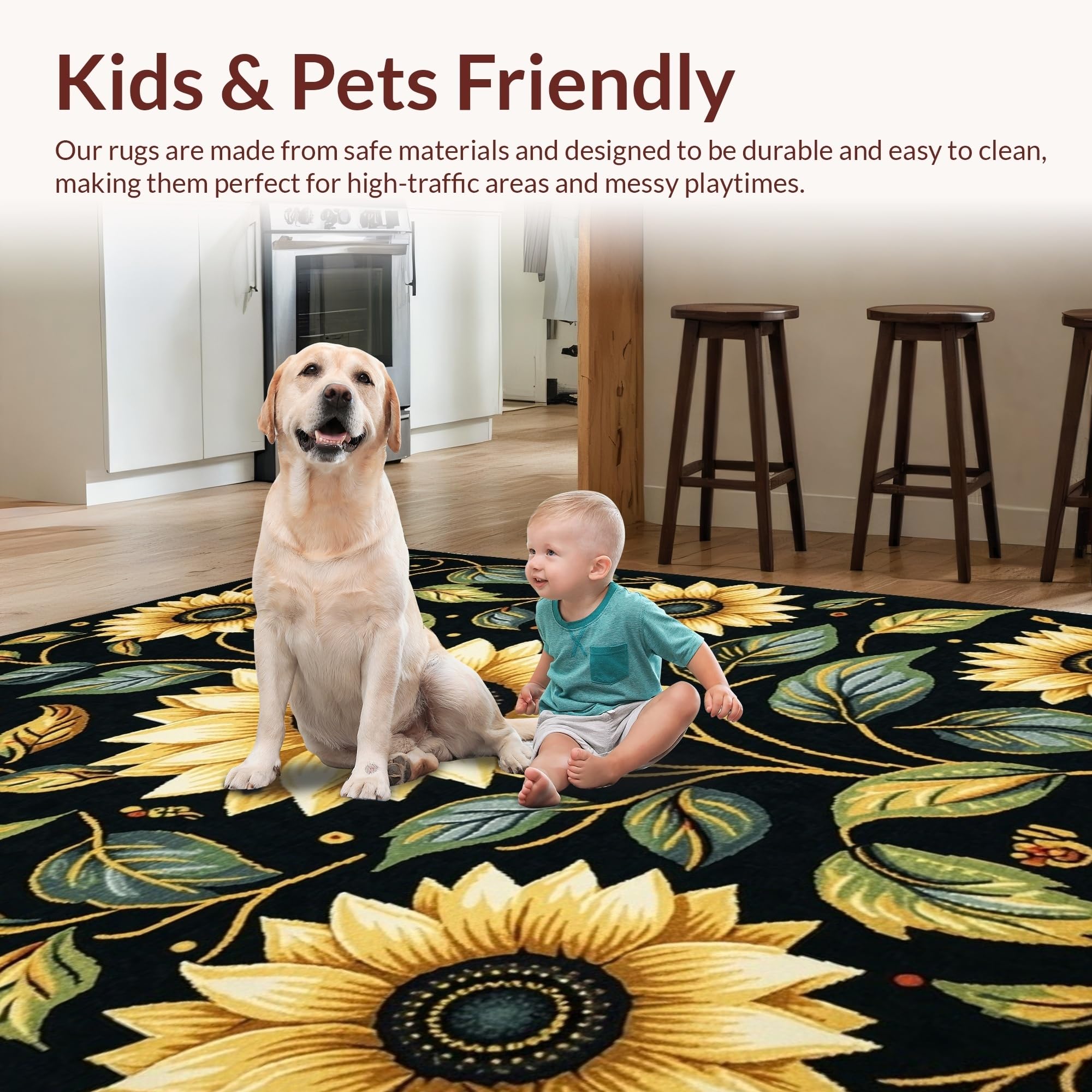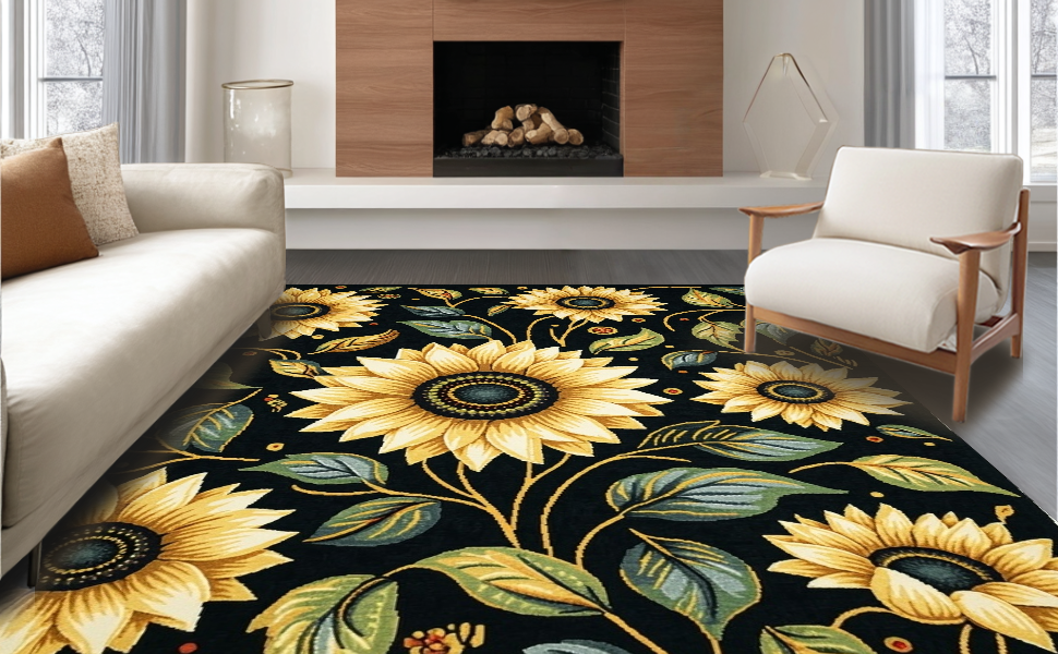 Ultra Soft Area Rug, Non Slip, Stain Resistant, Washable Area Rugs for Living Room, Bedroom, Dynamic Sunflower Graphic Element(Black) Overview: