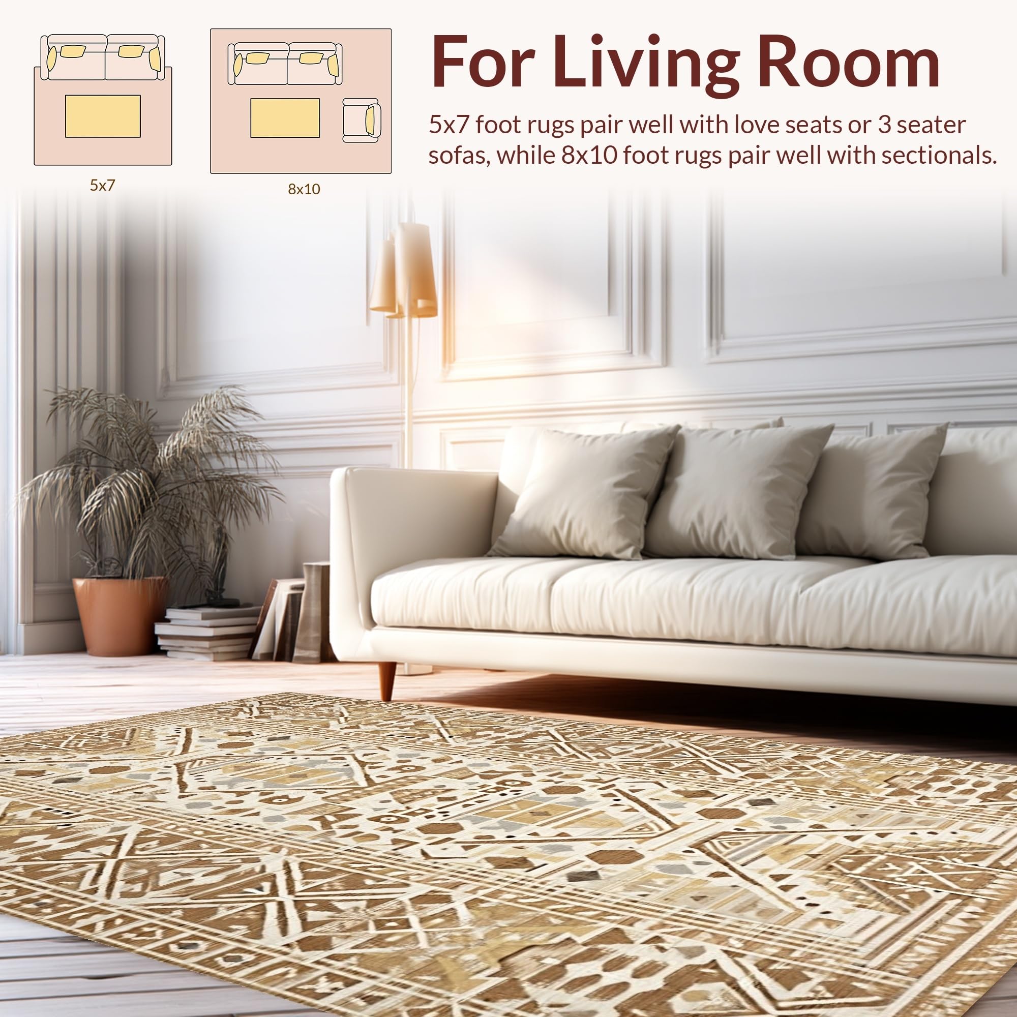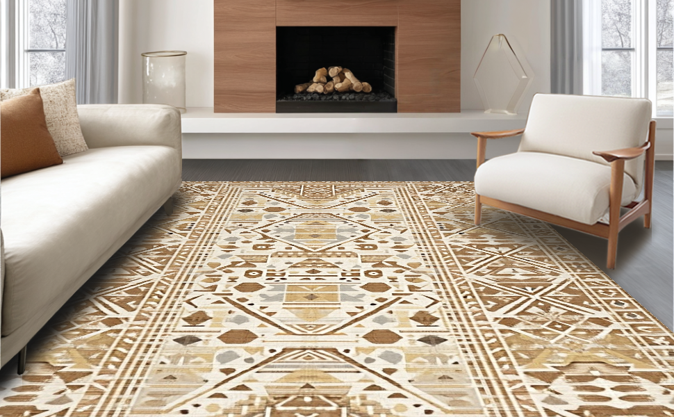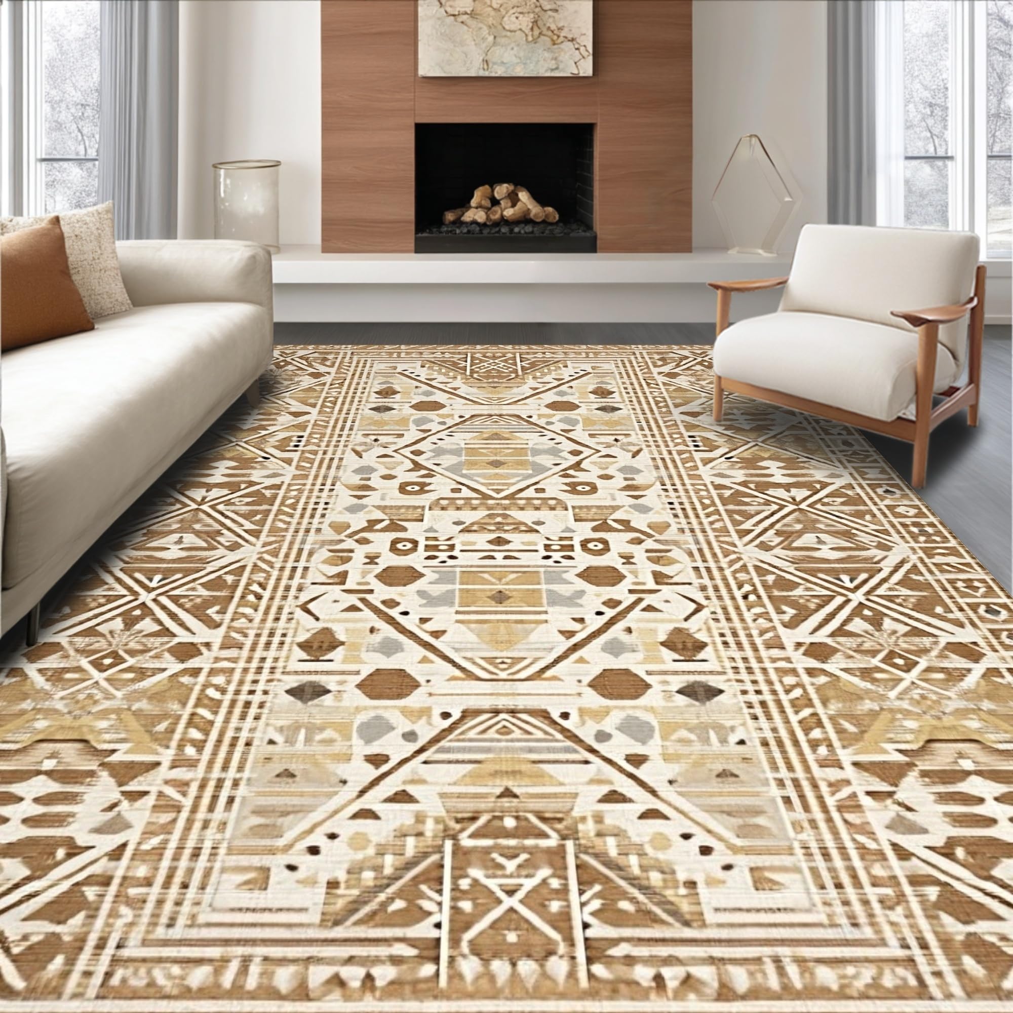 Ultra Soft Area Rug, Non Slip, Stain Resistant, Washable Area Rugs for Living Room, Bedroom, Earthy Toned Geometric Motif(Beige) Overview: