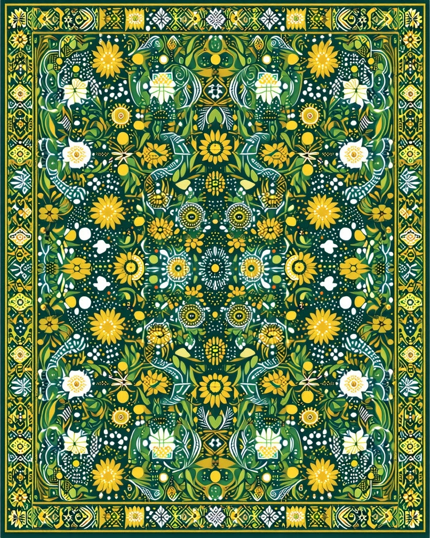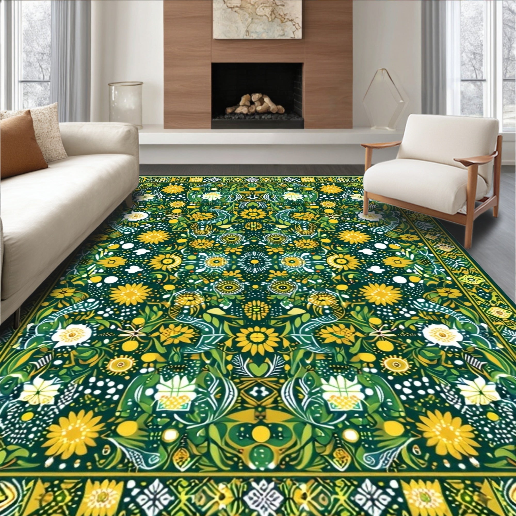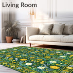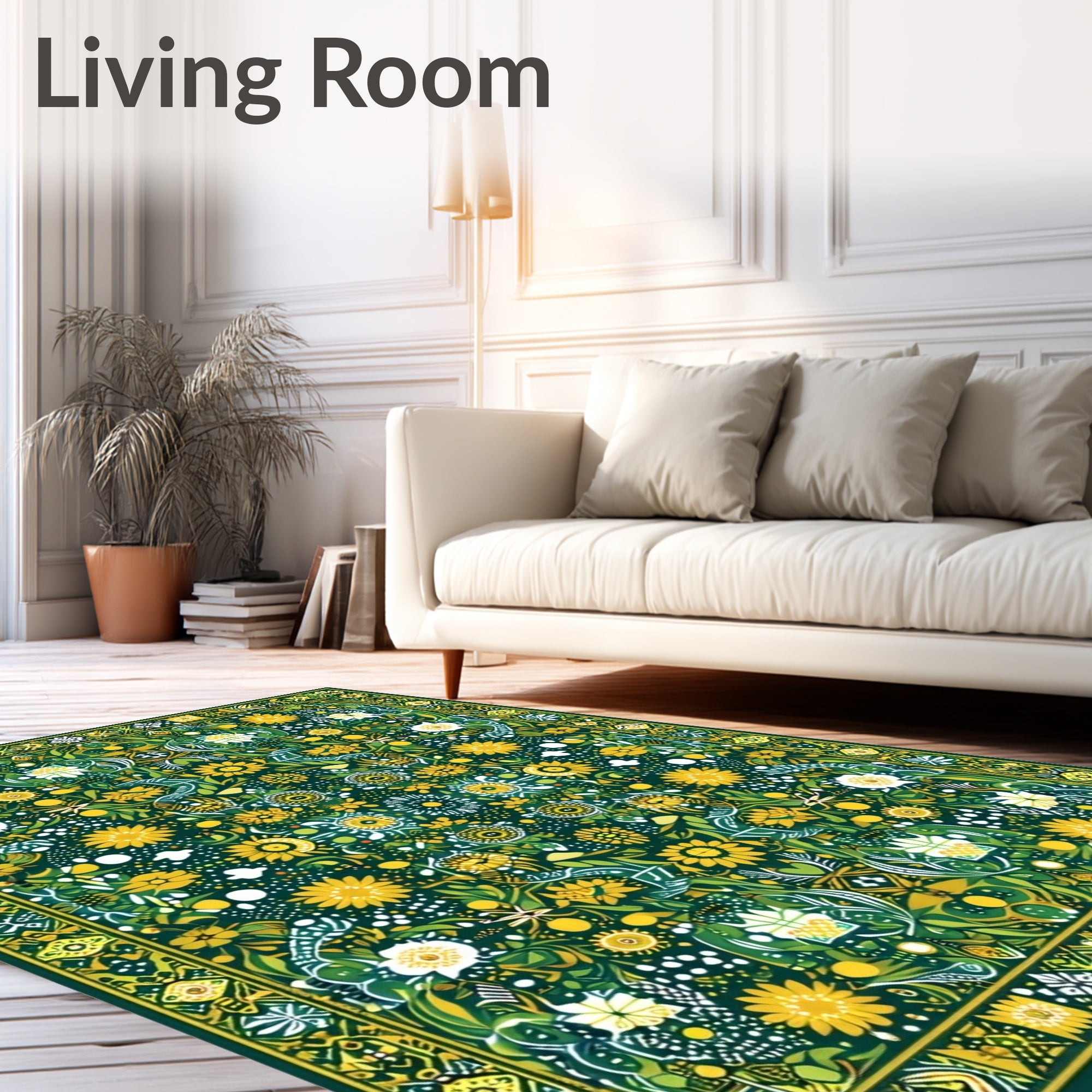 Flatwoven High Traffic Area Rug, Eclectic Boho in with Golden Yellow Swirls, Non Slip, Stain Resistant, Washable Area Rugs for Living Room, Bedroom (Green) Overview: