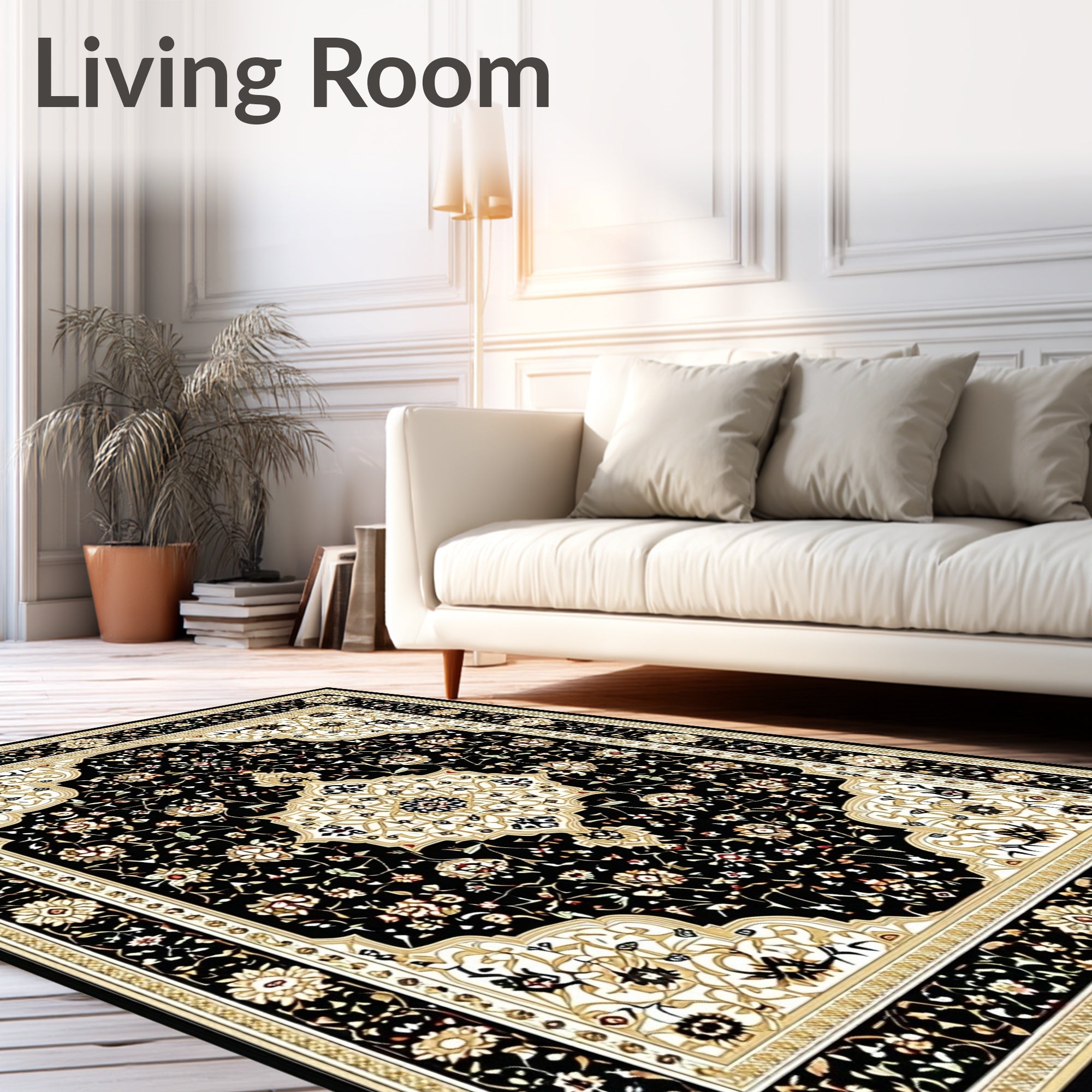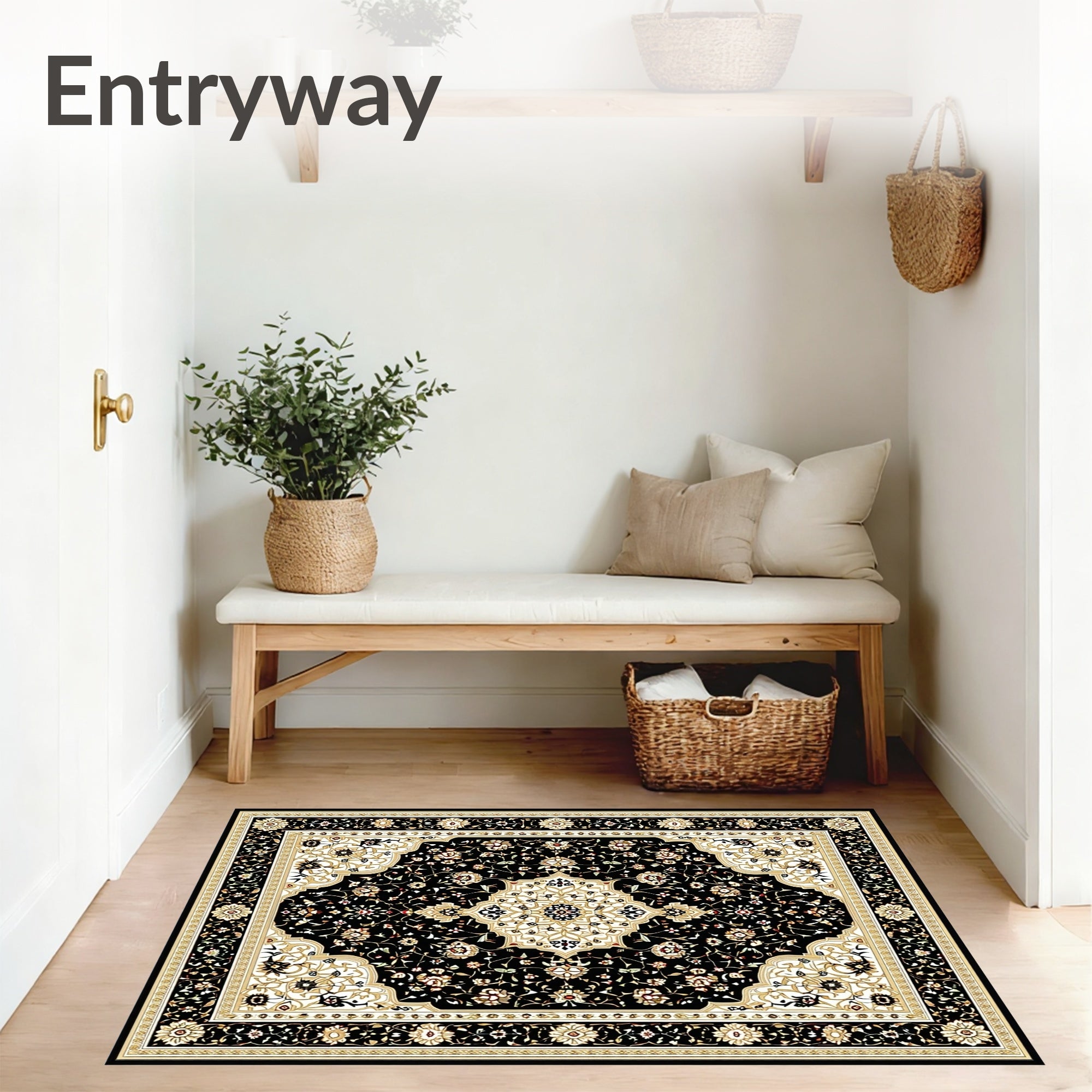 Flatwoven High Traffic Area Rug, Elegant Black and Beige Medallion with Ornate Oriental Motifs, Non Slip, Stain Resistant, Washable Area Rugs for Living Room, Bedroom (Black) Overview:
